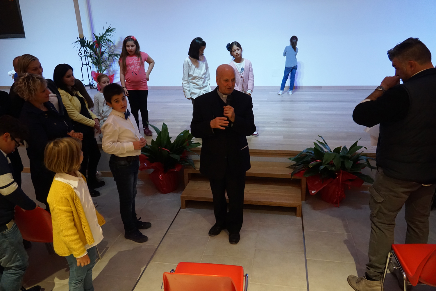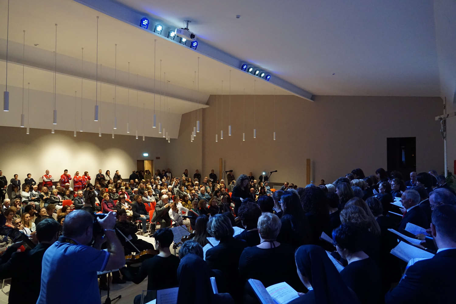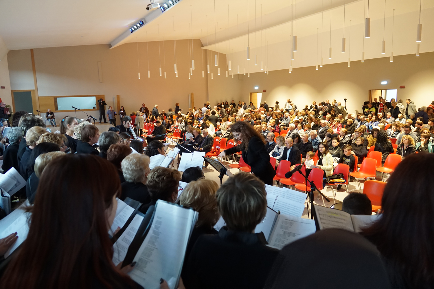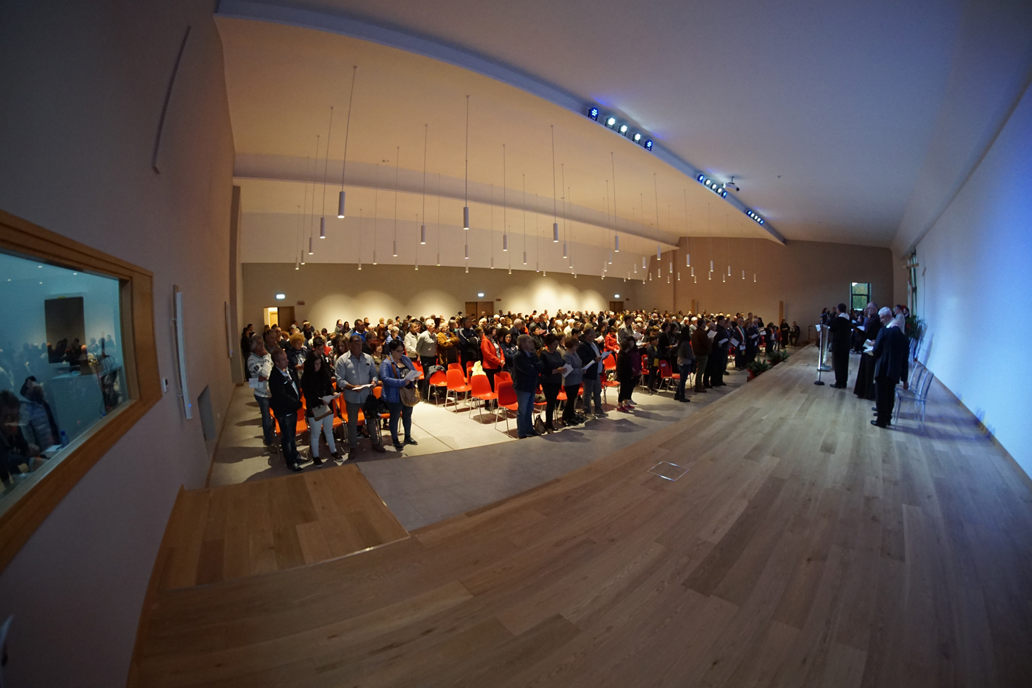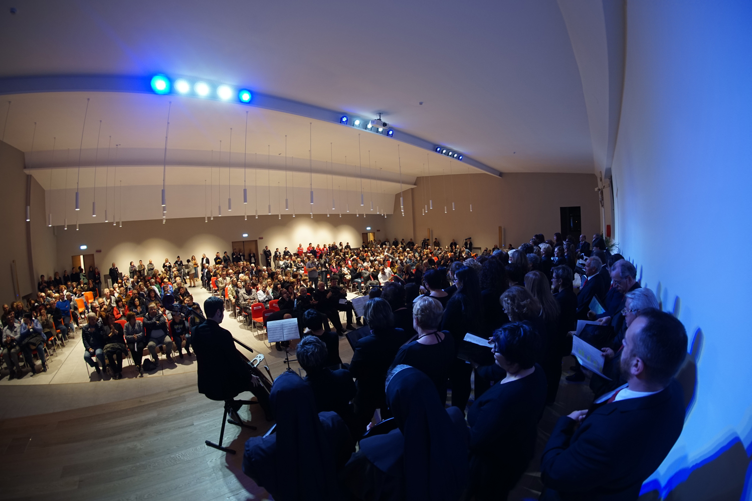 L’ingresso dei convenuti è avvenuto attraverso il bel giardino interno, dal quale prendono luce le aule per il catechismo e le altre attività, disposte su due ali. Un corridoio centrale conduce nel grande salone già sperimentato con i due incontri pastorali diocesani dello scorso settembre e dello scorso anno. Ad accogliere il corteo il canto del coro diocesano, rafforzato da una piccola compagine strumentale di archi e fiati, affidata a giovani e talentuosi musicisti.