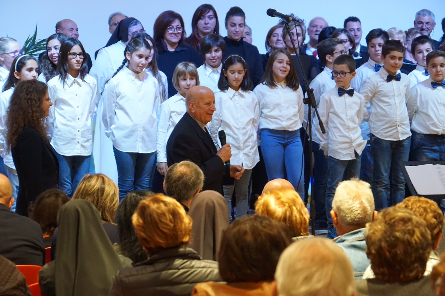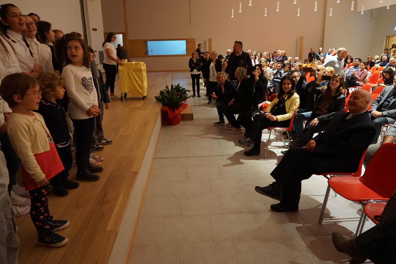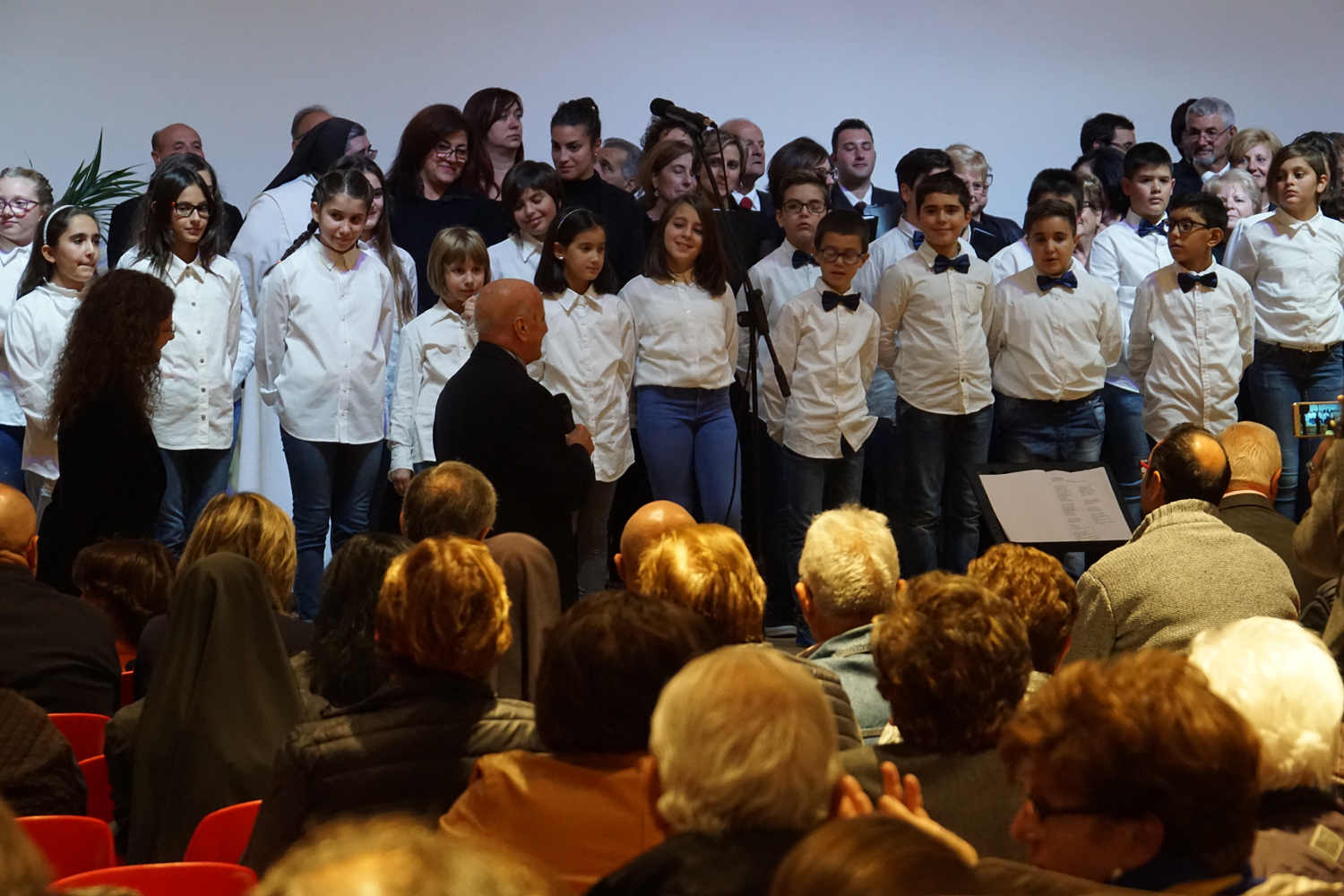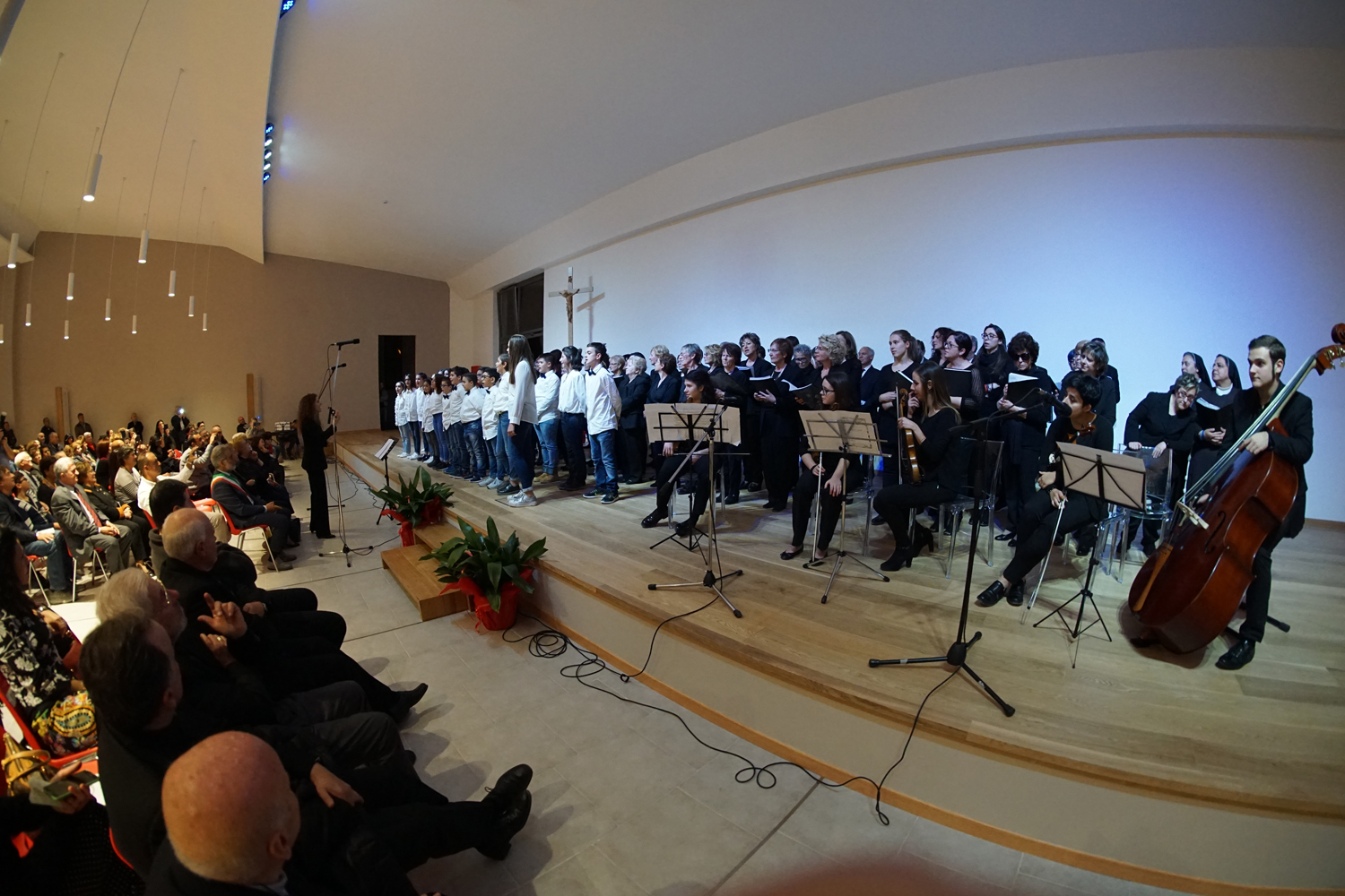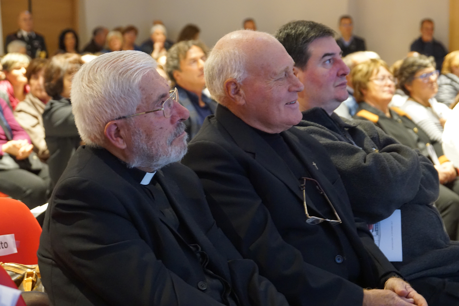 L’ingresso dei convenuti è avvenuto attraverso il bel giardino interno, dal quale prendono luce le aule per il catechismo e le altre attività, disposte su due ali. Un corridoio centrale conduce nel grande salone già sperimentato con i due incontri pastorali diocesani dello scorso settembre e dello scorso anno. Ad accogliere il corteo il canto del coro diocesano, rafforzato da una piccola compagine strumentale di archi e fiati, affidata a giovani e talentuosi musicisti.
