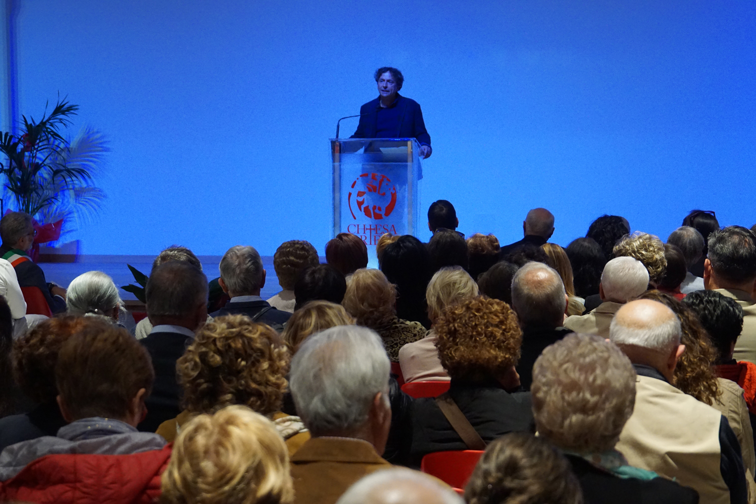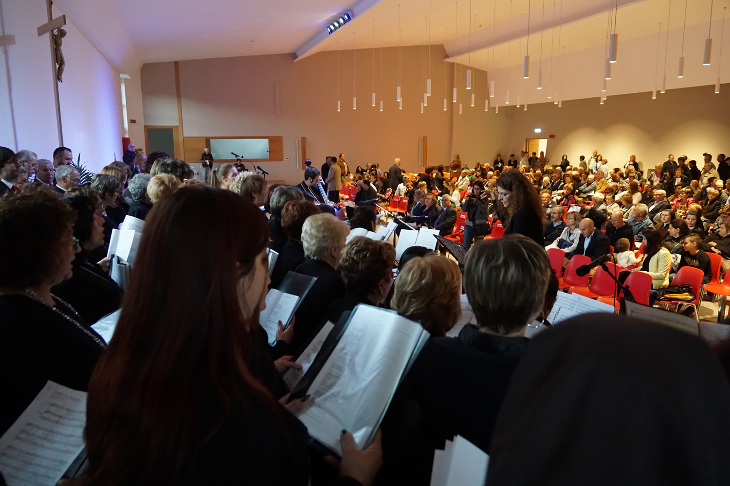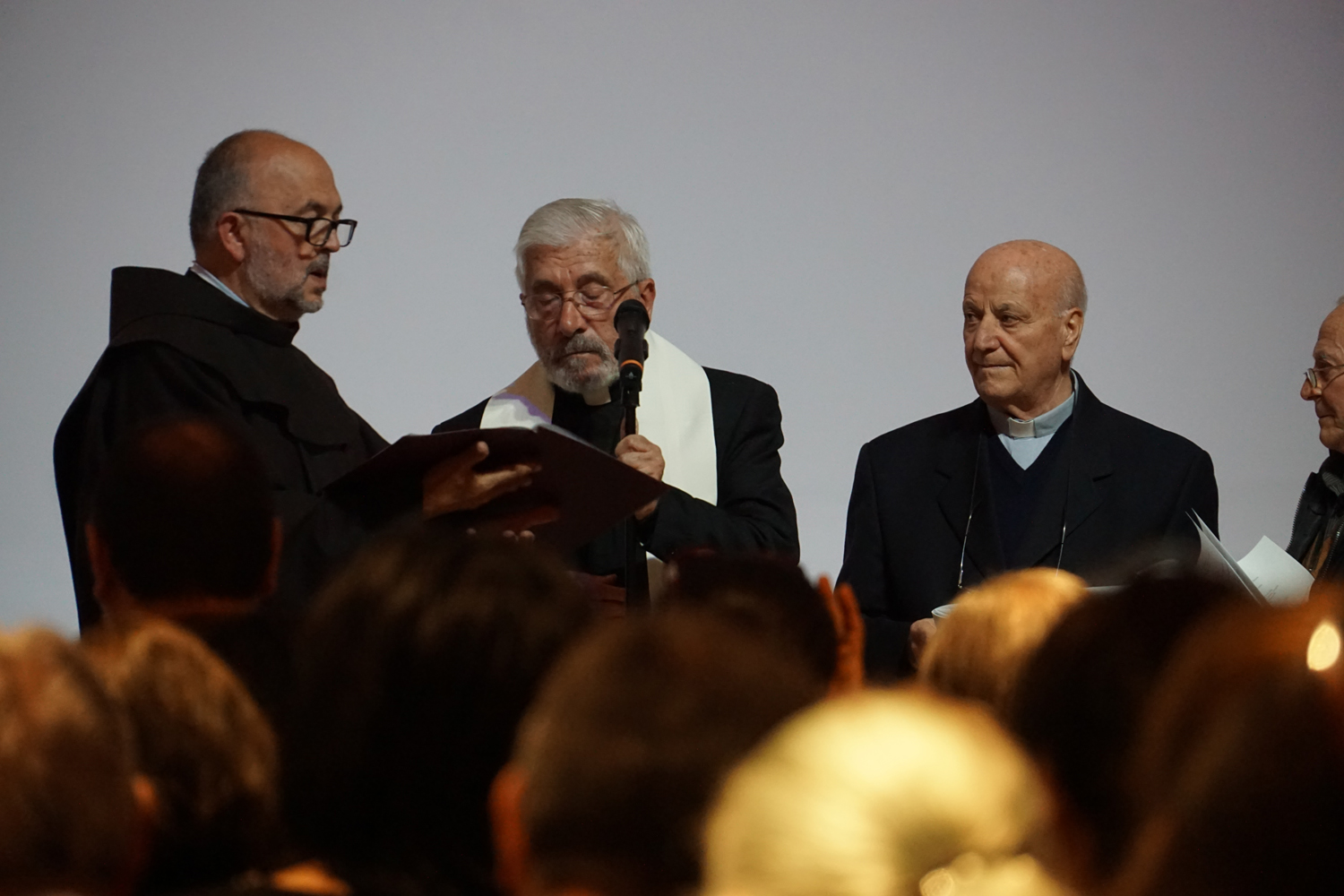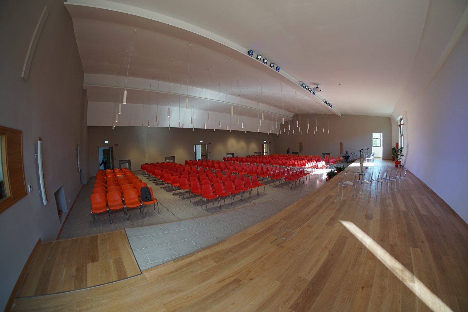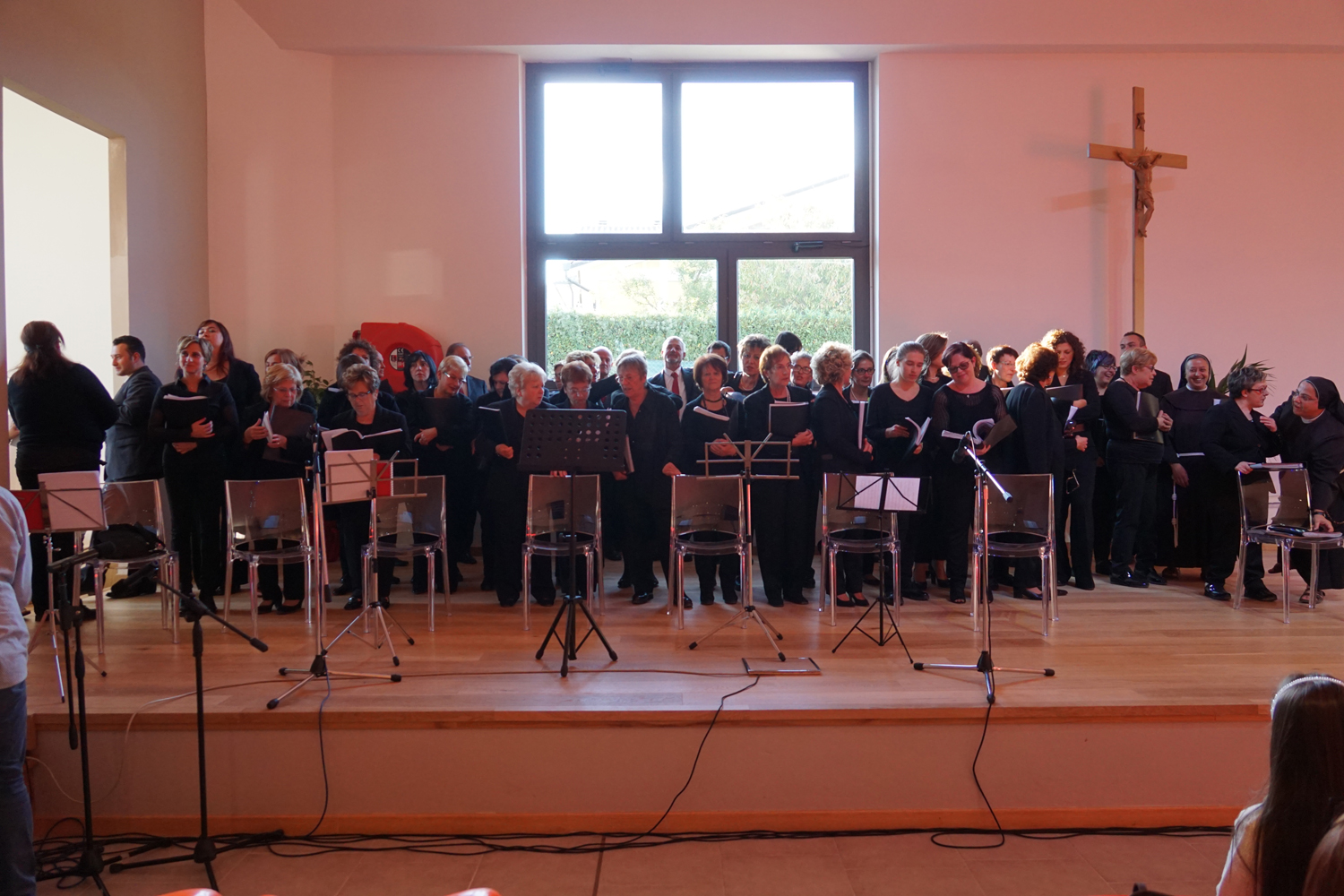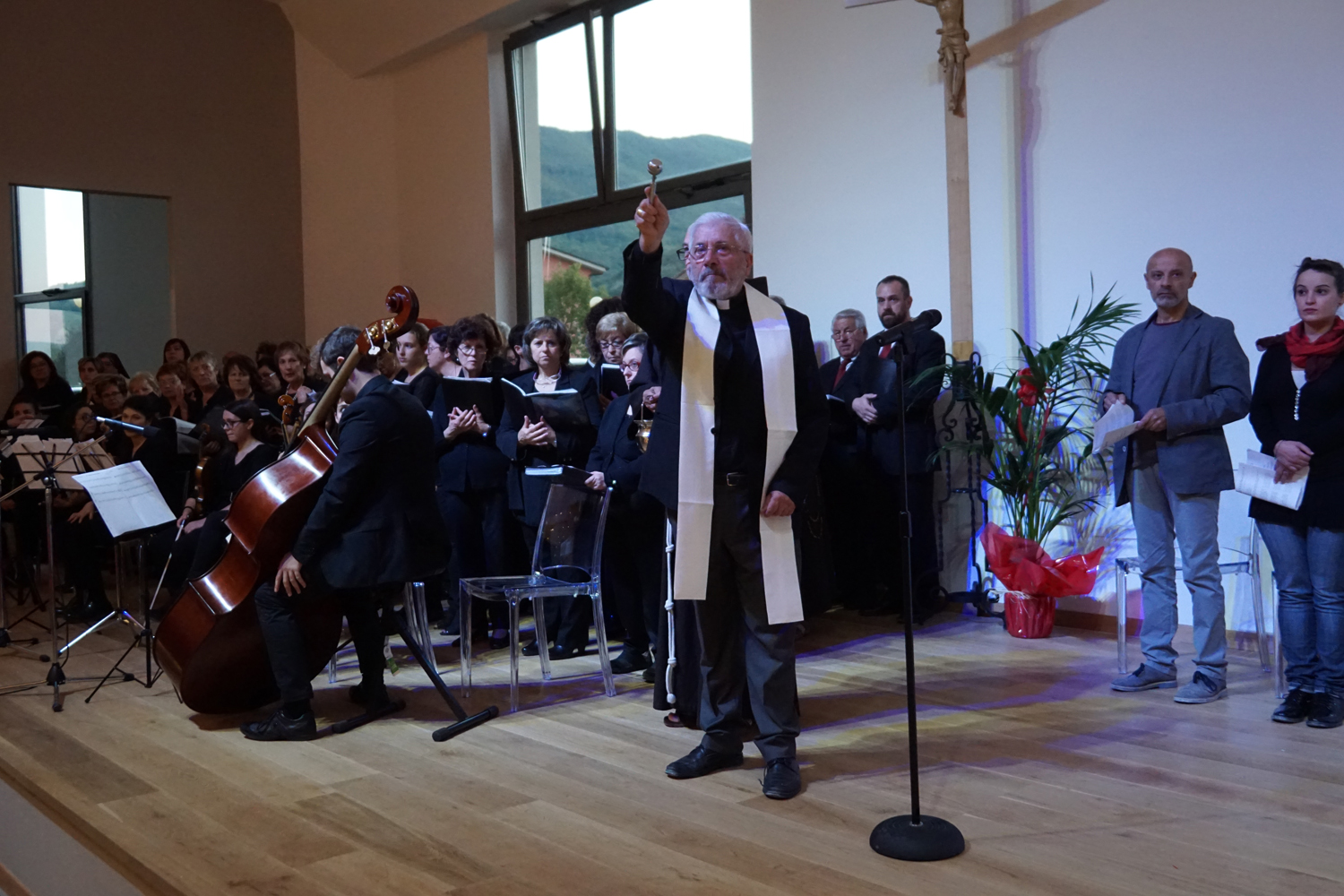 L’ingresso dei convenuti è avvenuto attraverso il bel giardino interno, dal quale prendono luce le aule per il catechismo e le altre attività, disposte su due ali. Un corridoio centrale conduce nel grande salone già sperimentato con i due incontri pastorali diocesani dello scorso settembre e dello scorso anno. Ad accogliere il corteo il canto del coro diocesano, rafforzato da una piccola compagine strumentale di archi e fiati, affidata a giovani e talentuosi musicisti.