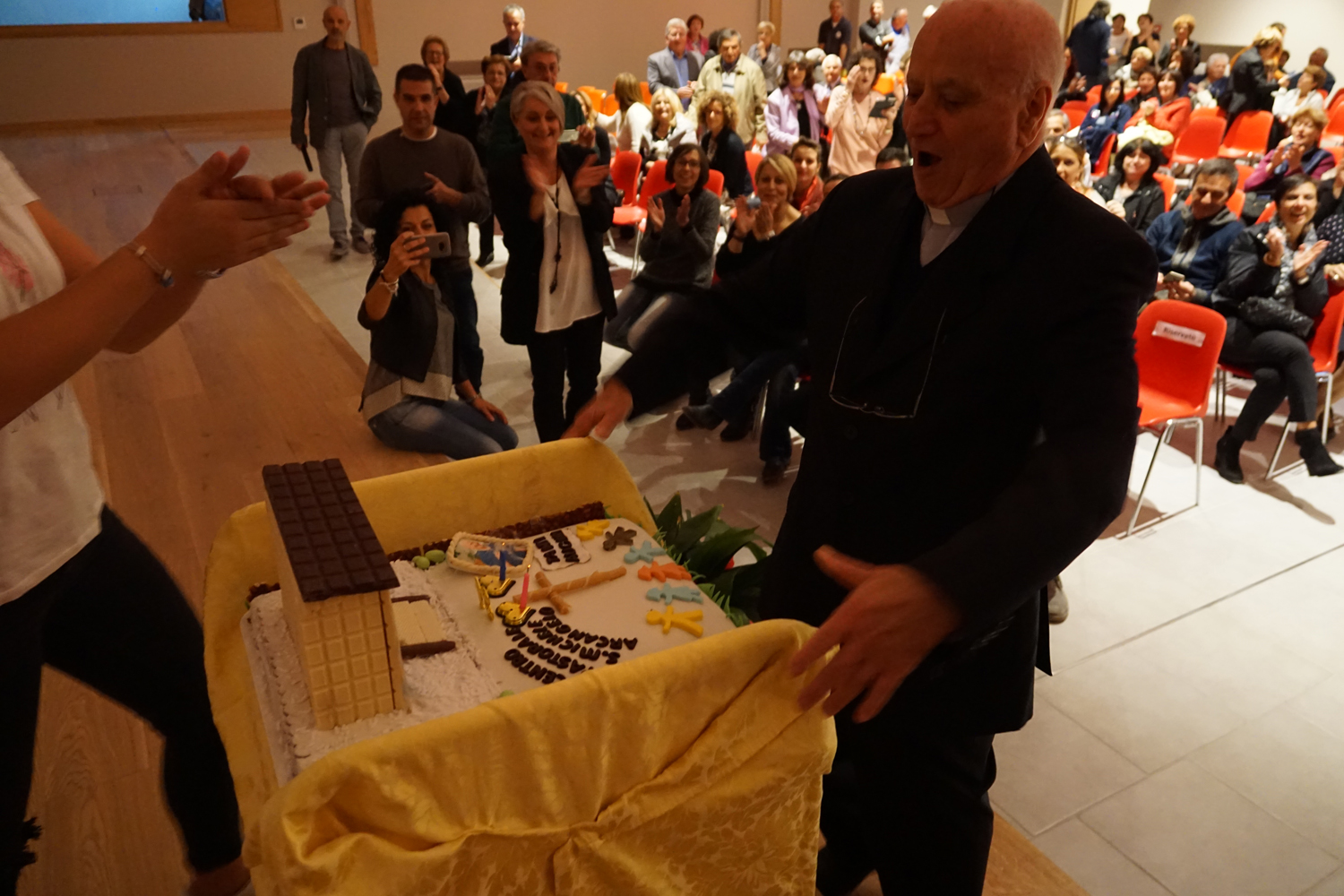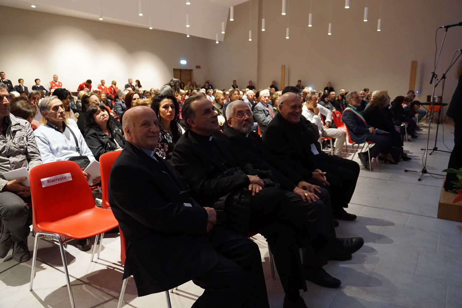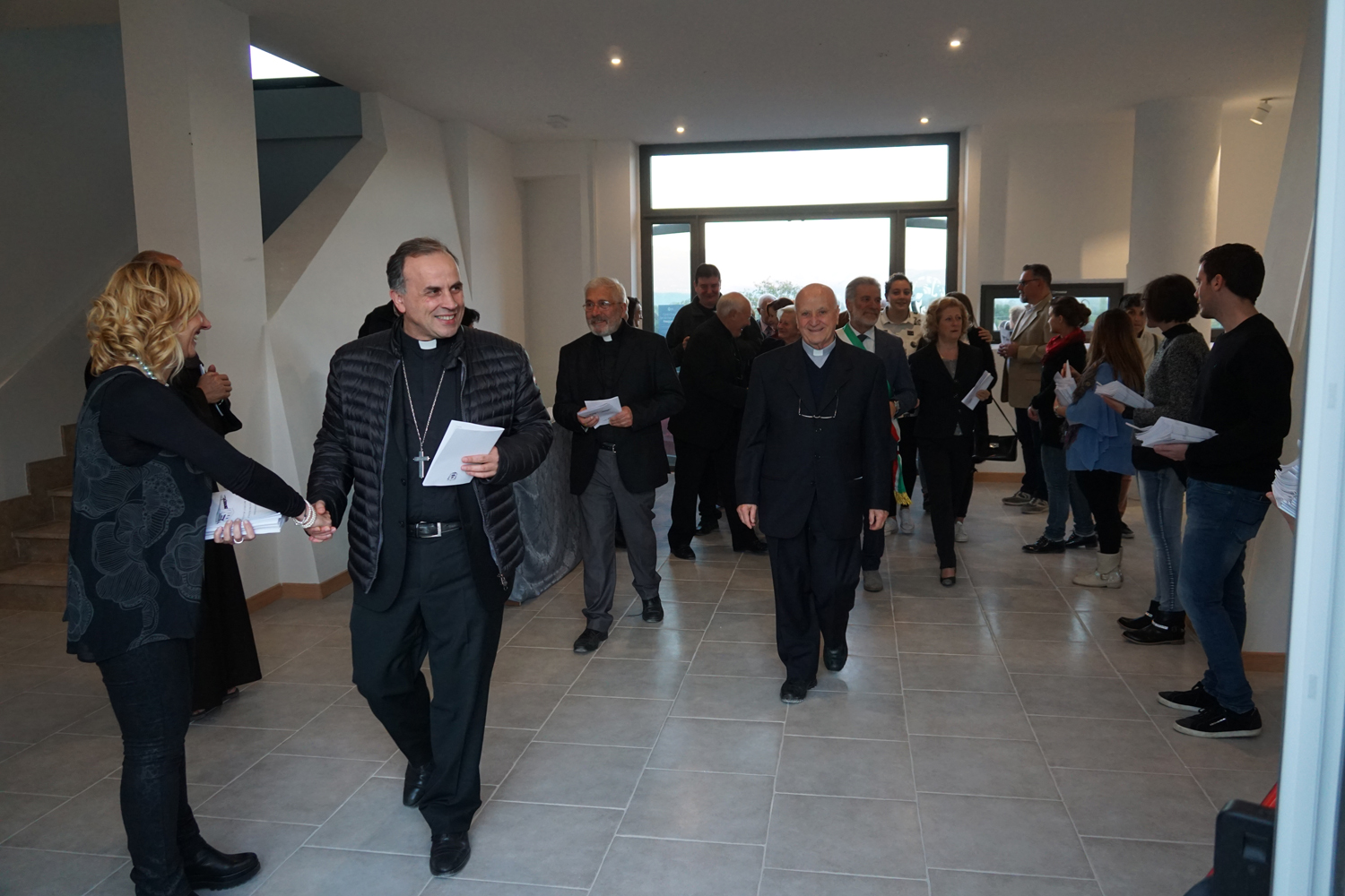 Nel salone gremito di popolo, il vescovo Domenico ha presieduto il rito di benedizione del centro, lasciando a mons Lucarelli, coadiuvato da padre Ezio Casella, direttore dell’Ufficio Liturgico diocesano, il gesto dell’aspersione.