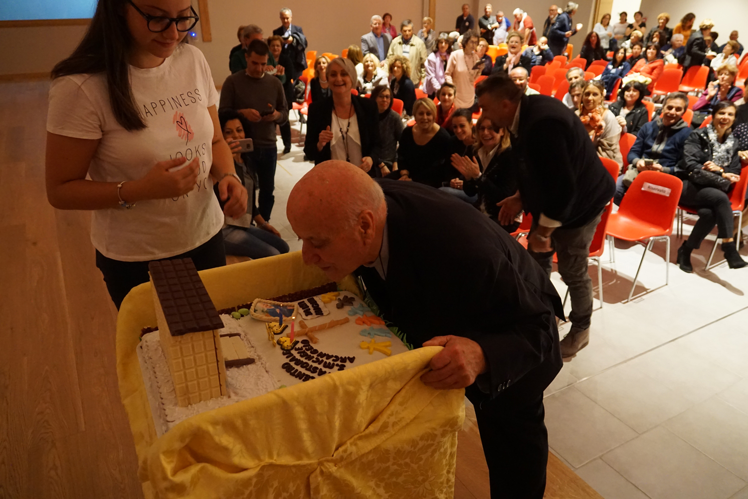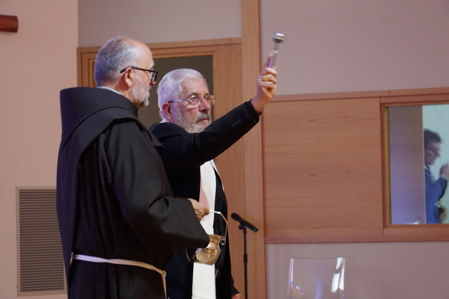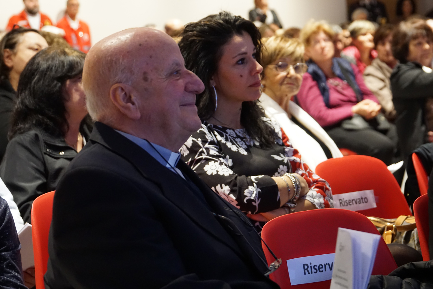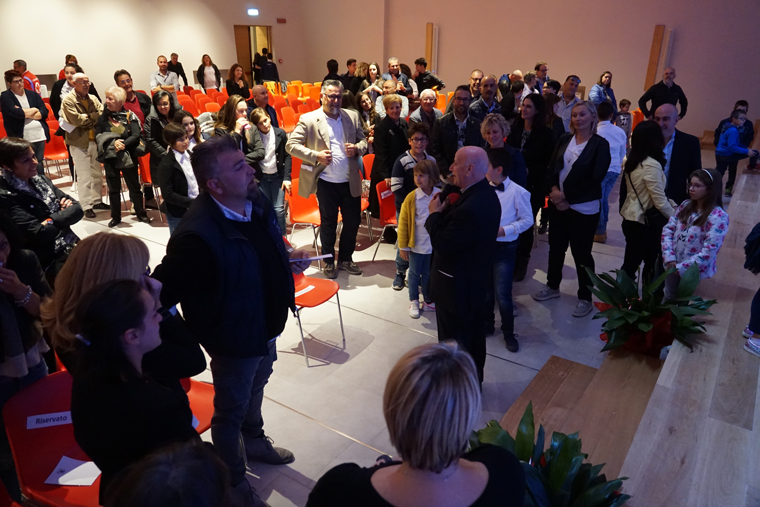 Nel salone gremito di popolo, il vescovo Domenico ha presieduto il rito di benedizione del centro, lasciando a mons Lucarelli, coadiuvato da padre Ezio Casella, direttore dell’Ufficio Liturgico diocesano, il gesto dell’aspersione.