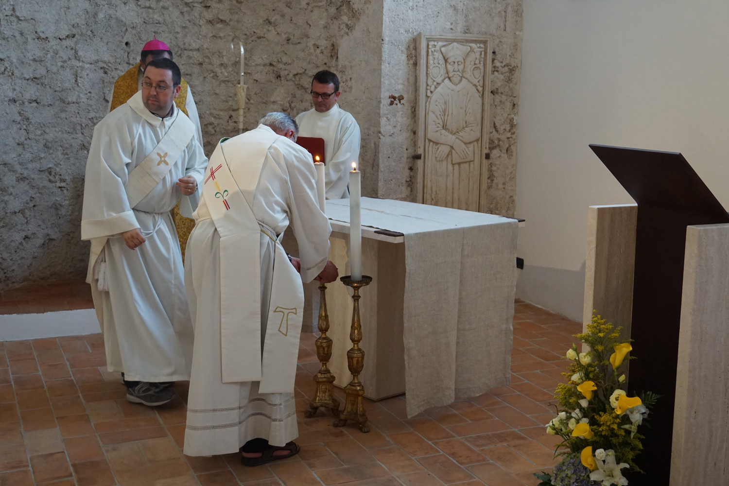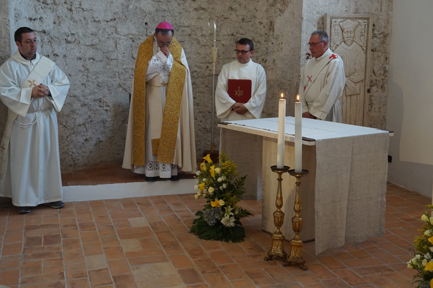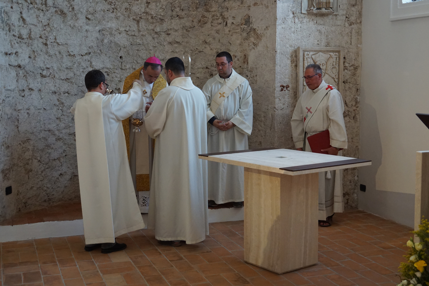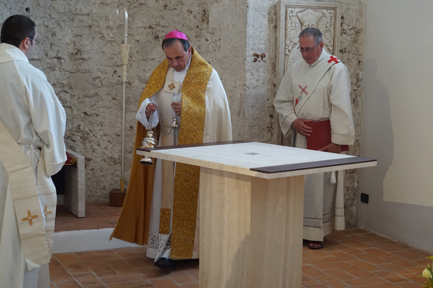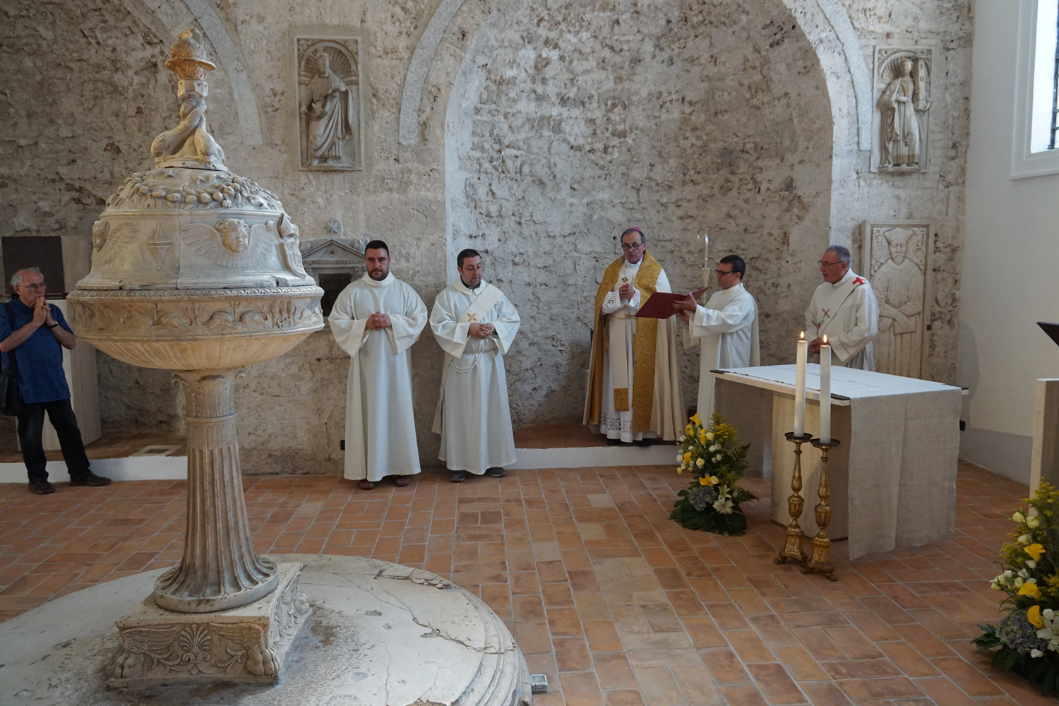 Nell’omelia proposta in occasione della benedizione dei nuovi arredi sacri, che l’Ufficio Liturgico già mesi fa aveva pensato di programmare opportunamente per il 24 giugno, solennità della Natività del titolare san Giovanni Battista, il vescovo Domenico ha presentato il ritorno a nuova vita del battistero come «una fenditura nella roccia della Cattedrale, proprio nel portico che costituisce anche architettonicamente il punto di congiunzione tra la piazza e la chiesa». Un chiaro riferimento alle letture scelte per la celebrazione (1Pt 2, 4-10; Lc 6, 47-49), tutte incentrate sul motivo del Cristo «pietra viva».