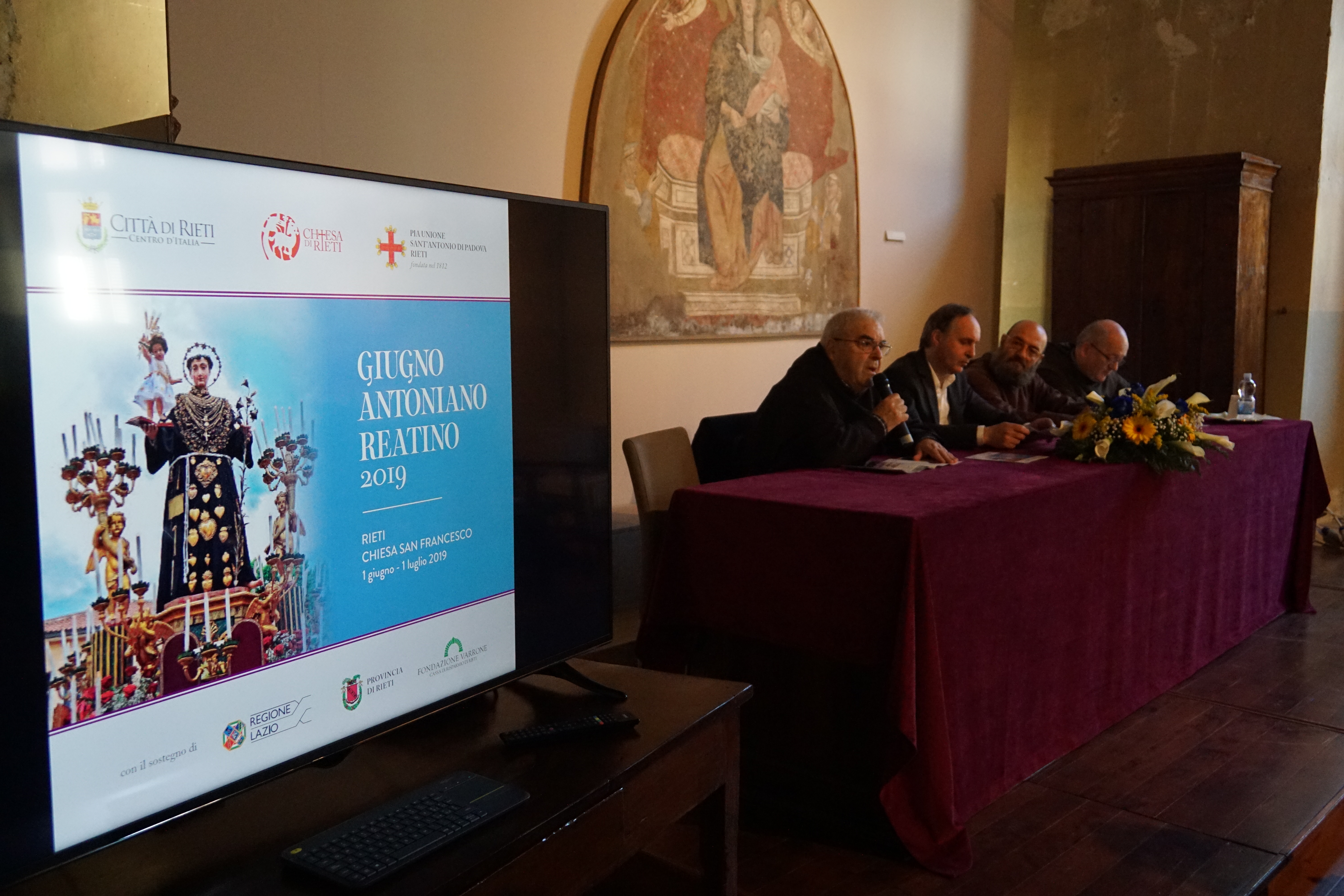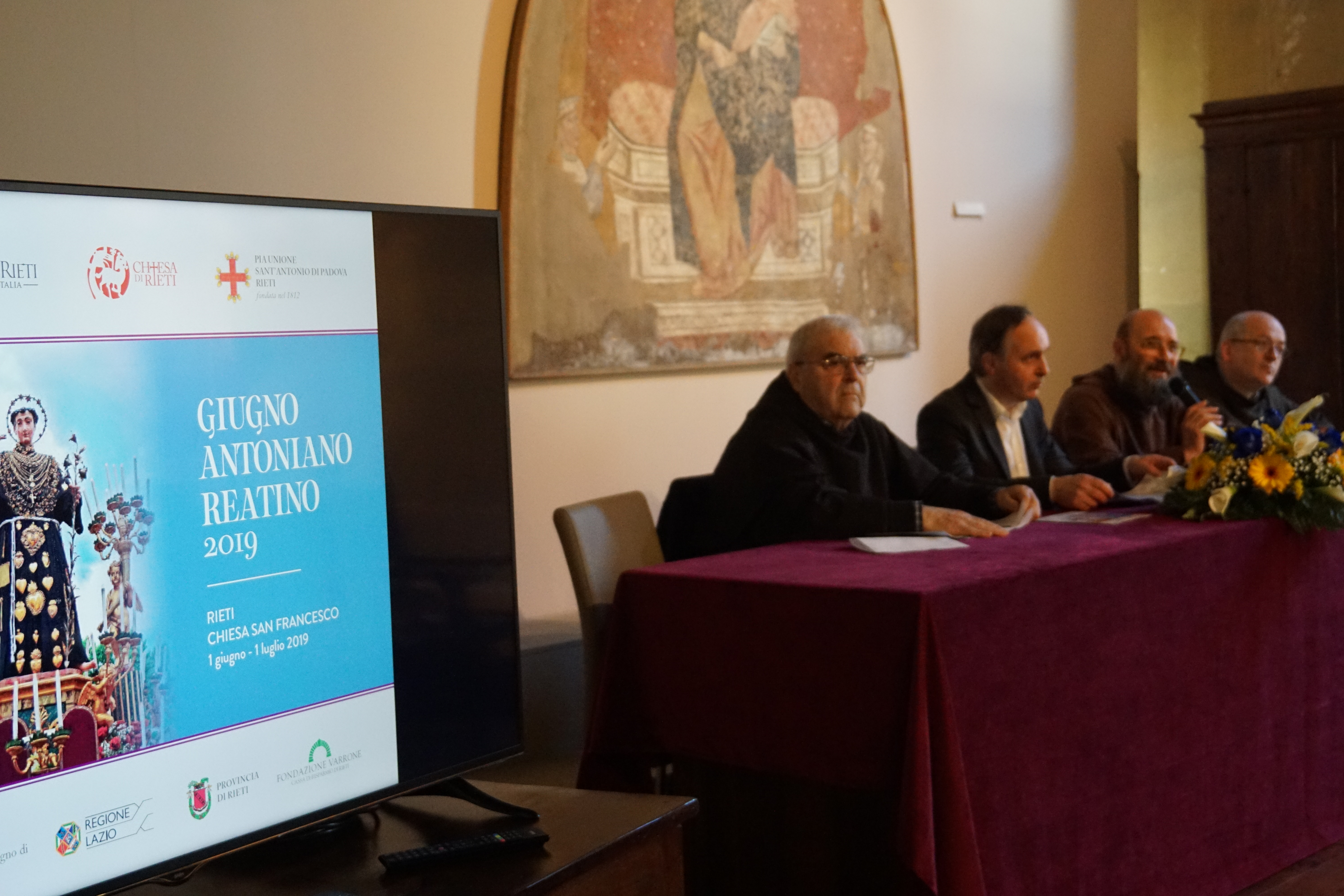 Si è tenuta venerdì 24 maggio presso il salone di Palazzo Papale la conferenza stampa di presentazione del Giugno Antoniano 2019, alla presenza del vescovo Domenico, di padre Antonio Maria Tofanelli, padre Luigi Faraglia e padre Marcello Bonforte della fraternità interobbedenziale di San Rufo, e del priore della Pia Unione Sant’Antonio di Padova di Rieti, Marino Flammini.