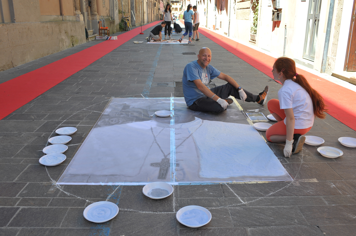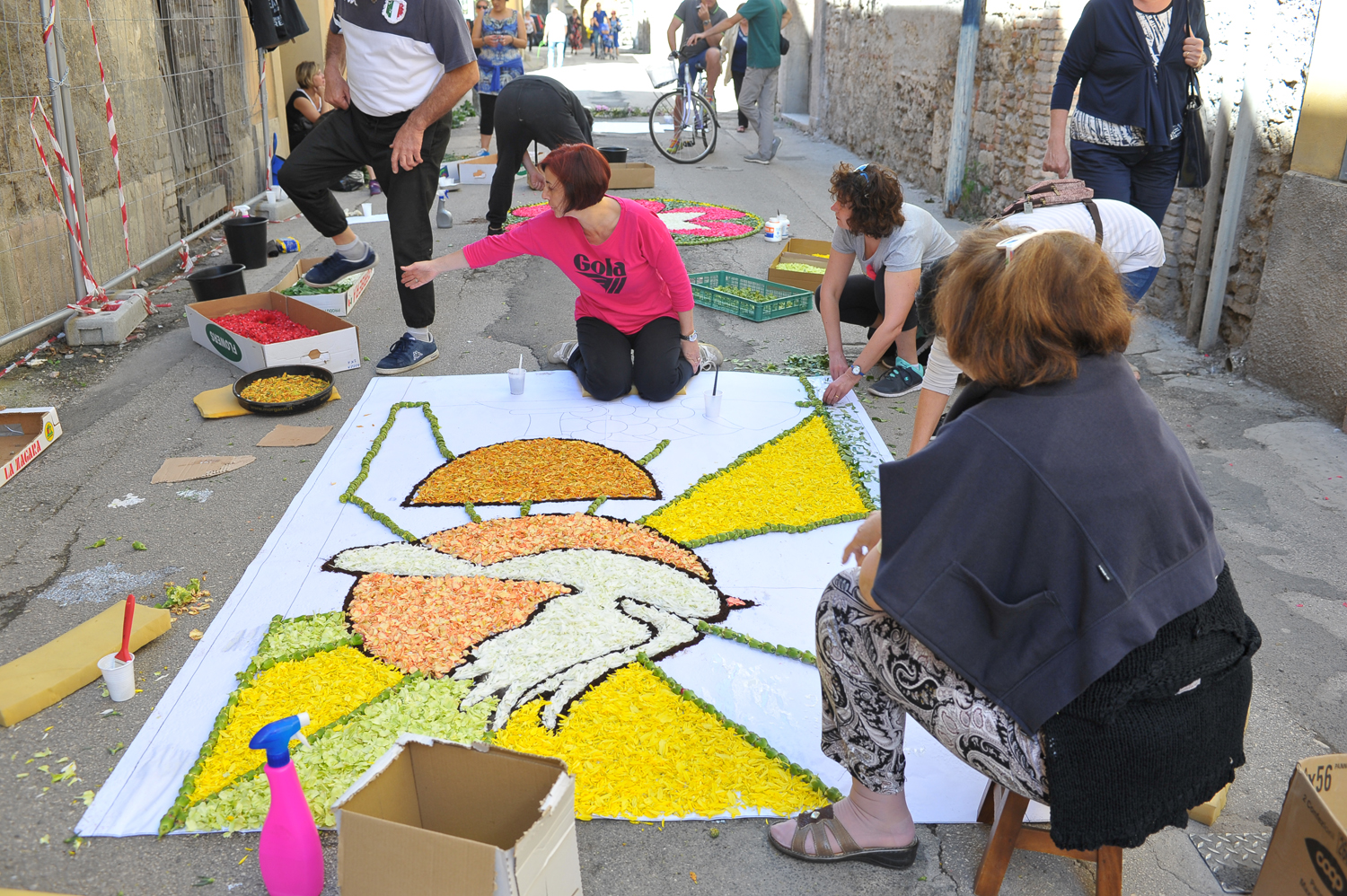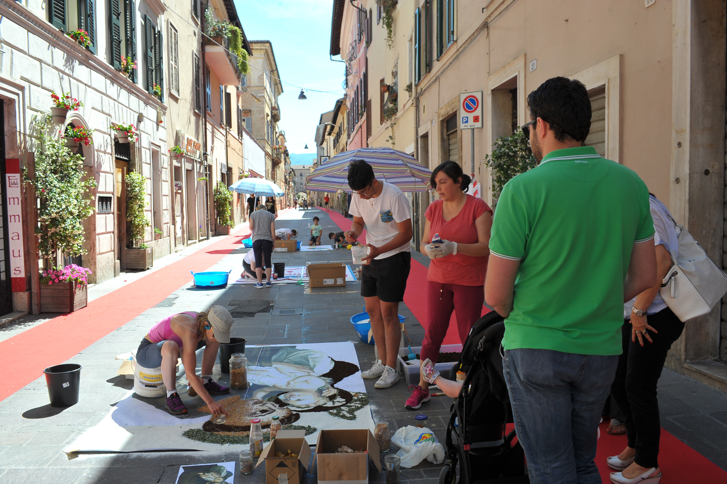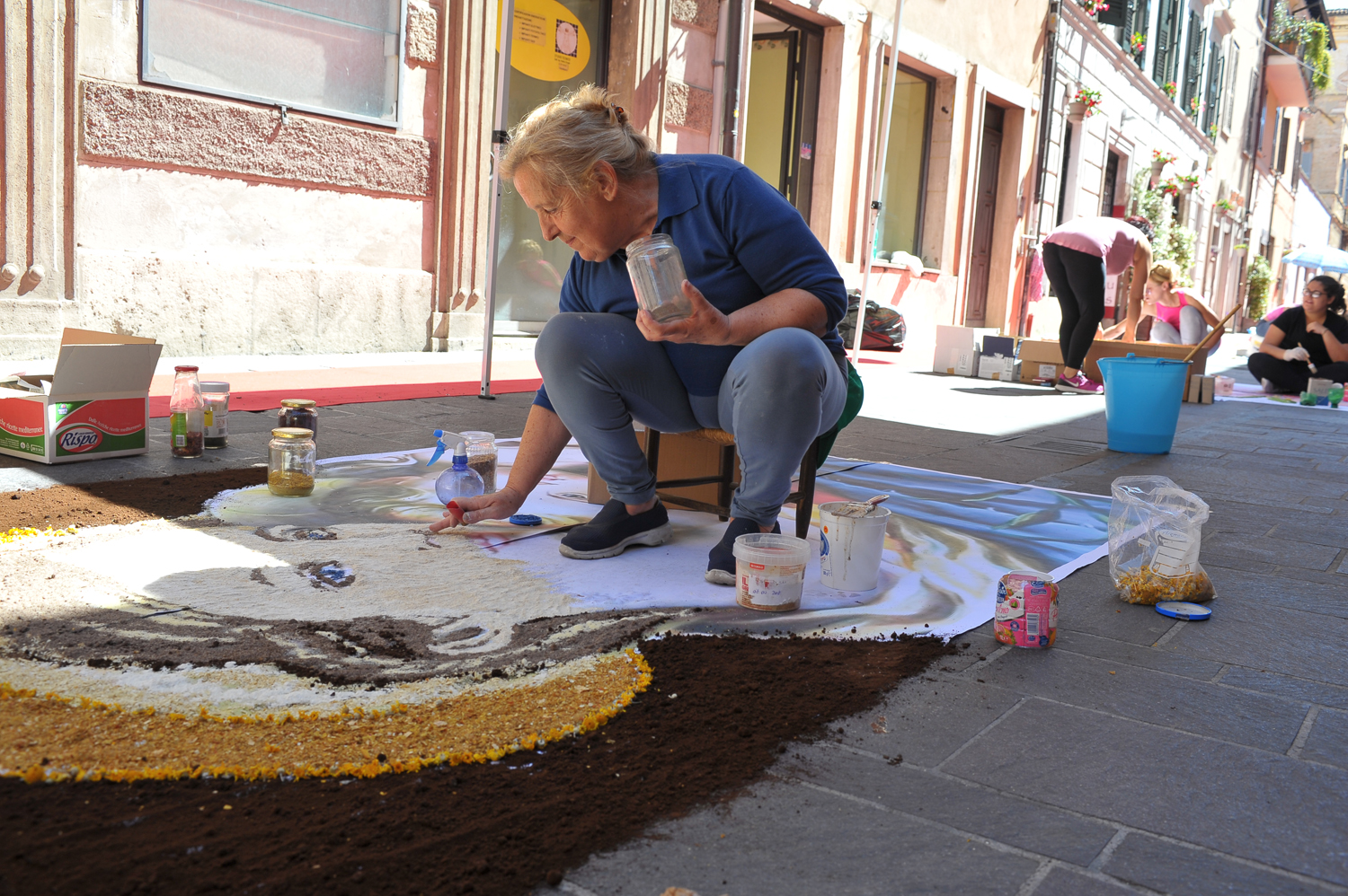 Da Porta Conca a Porta d’Arce, da Porta Romana a via San Francesco, i cittadini sono scesi in strada fin dalle primissime ore del mattino per creare vere e proprie opere d’arte fatte di petali e non solo. Molti gli “attrezzi del mestiere” utilizzati e affinati negli anni, dalla segatura ai fondi di caffè, dal sale alle polveri dorate, alle miscele di colla e acqua e zucchero utilizzate rispettivamente per tenere fermi i fiori in caso di folate di vento e per mantenerli freschi nonostante il sole.