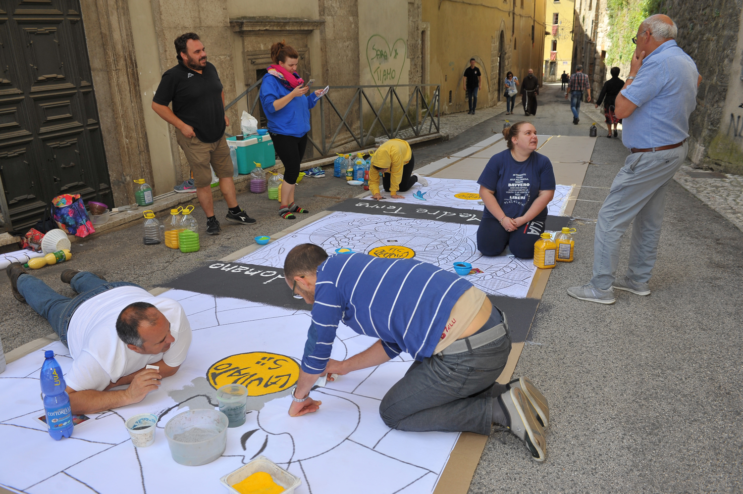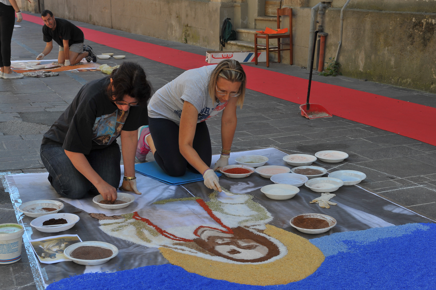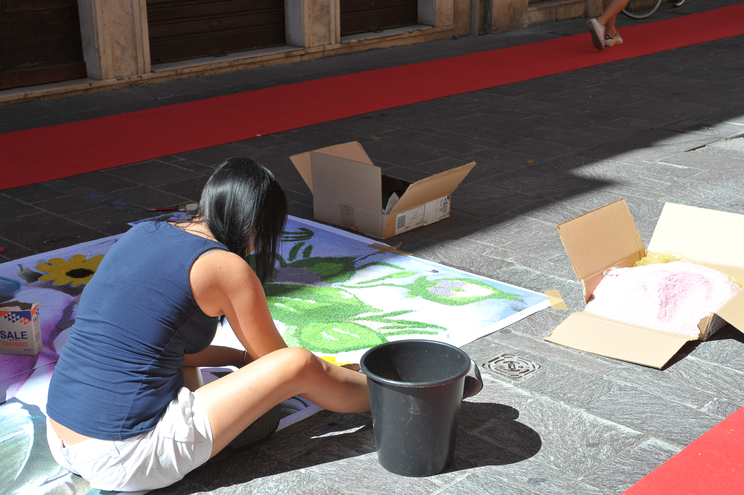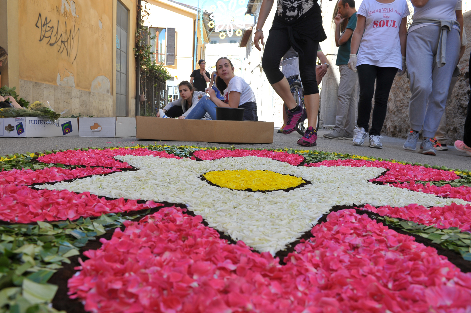 Da Porta Conca a Porta d’Arce, da Porta Romana a via San Francesco, i cittadini sono scesi in strada fin dalle primissime ore del mattino per creare vere e proprie opere d’arte fatte di petali e non solo. Molti gli “attrezzi del mestiere” utilizzati e affinati negli anni, dalla segatura ai fondi di caffè, dal sale alle polveri dorate, alle miscele di colla e acqua e zucchero utilizzate rispettivamente per tenere fermi i fiori in caso di folate di vento e per mantenerli freschi nonostante il sole.