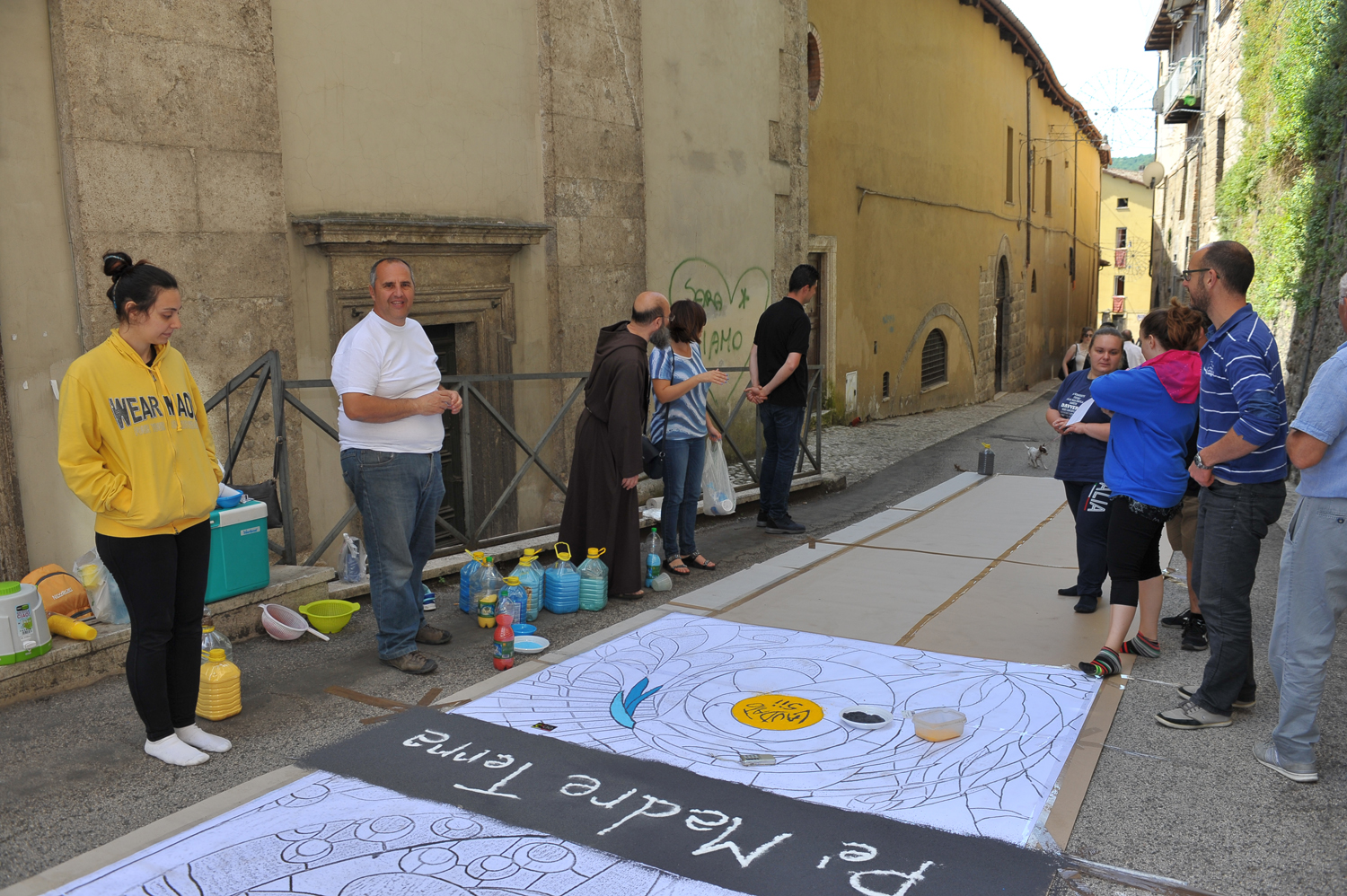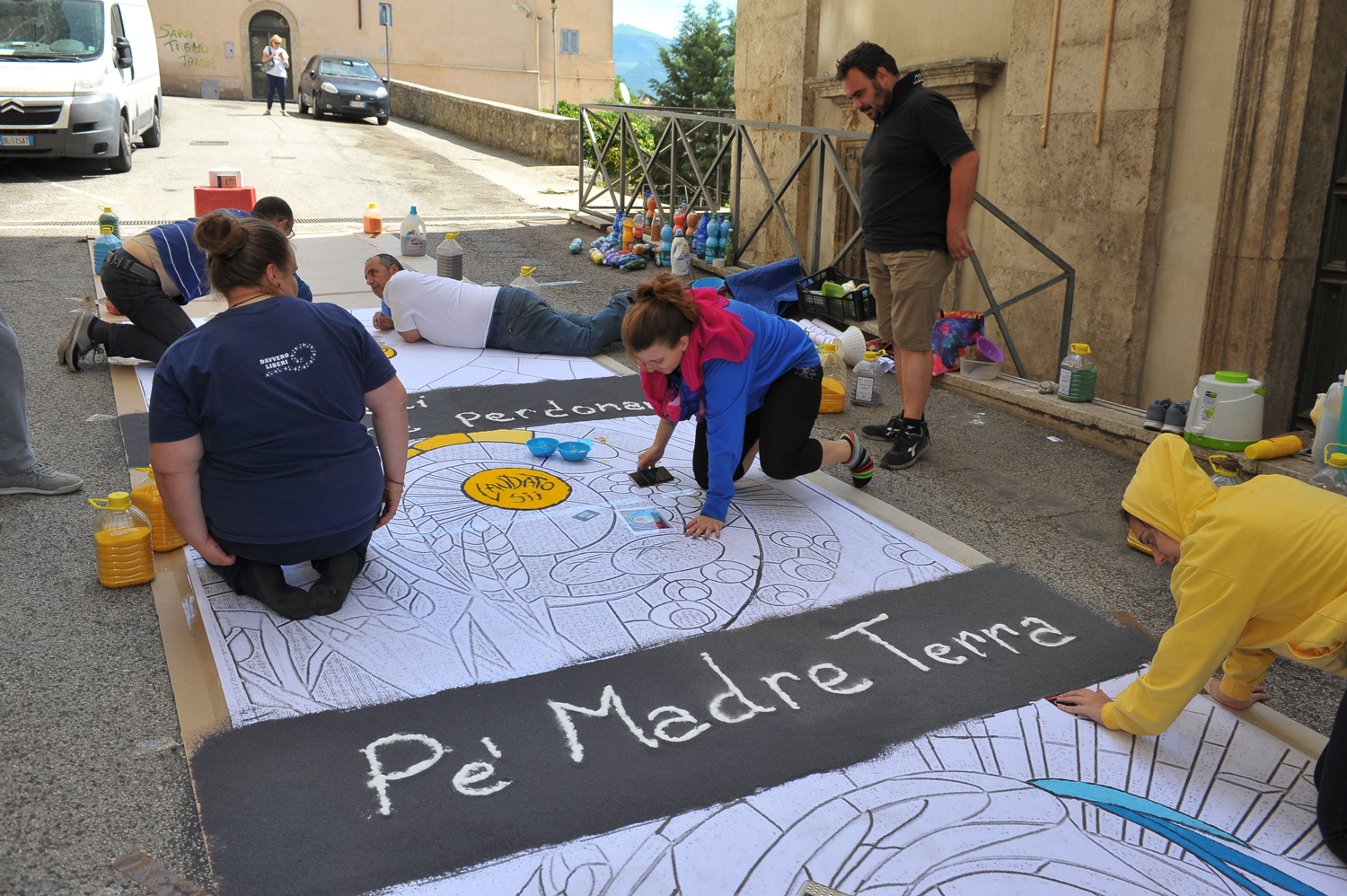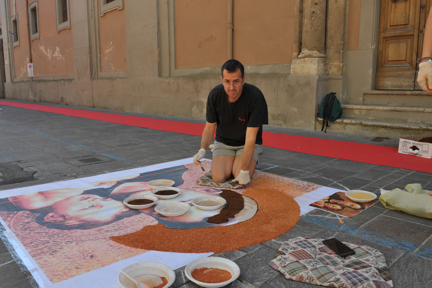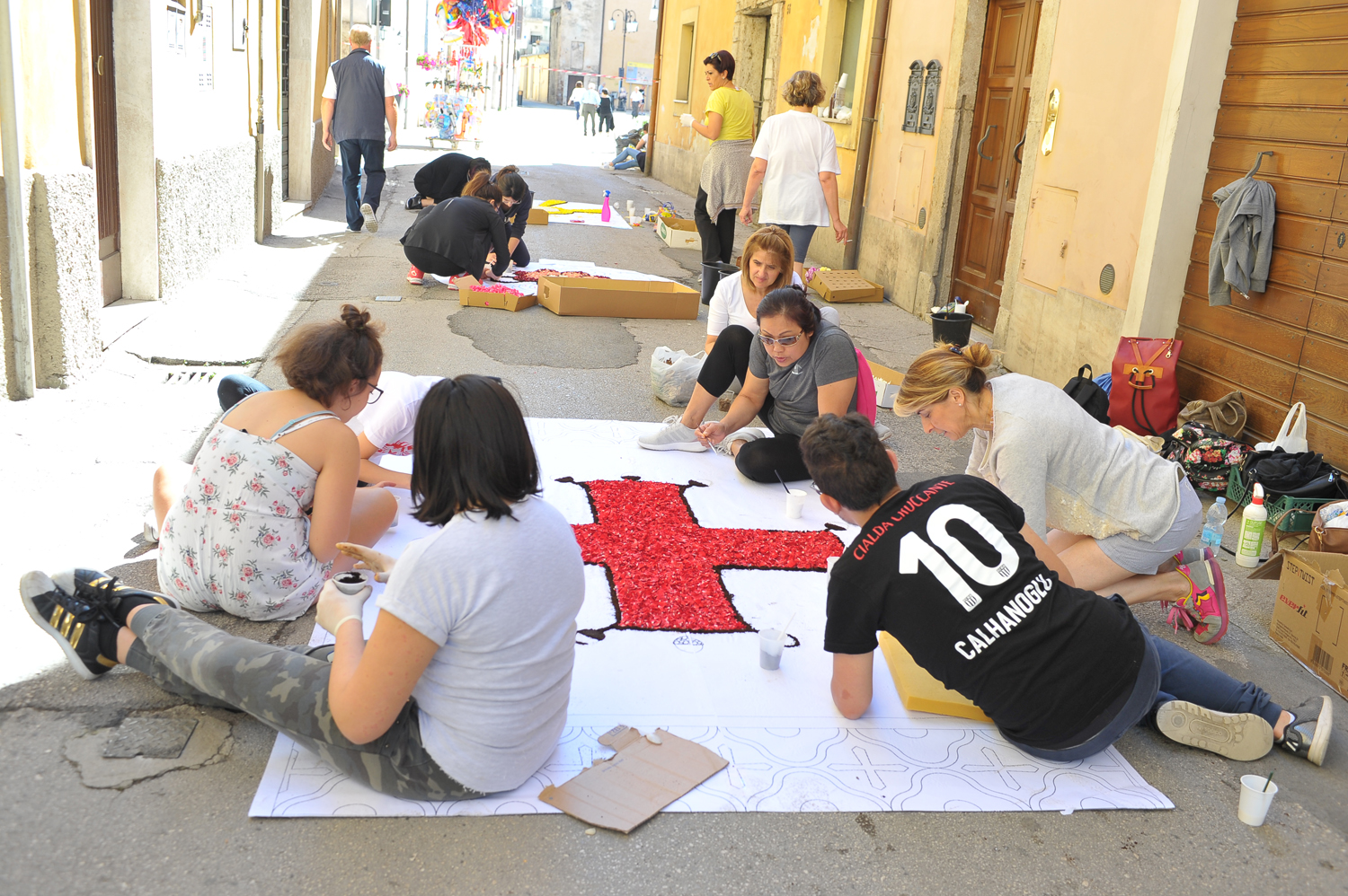 Da Porta Conca a Porta d’Arce, da Porta Romana a via San Francesco, i cittadini sono scesi in strada fin dalle primissime ore del mattino per creare vere e proprie opere d’arte fatte di petali e non solo. Molti gli “attrezzi del mestiere” utilizzati e affinati negli anni, dalla segatura ai fondi di caffè, dal sale alle polveri dorate, alle miscele di colla e acqua e zucchero utilizzate rispettivamente per tenere fermi i fiori in caso di folate di vento e per mantenerli freschi nonostante il sole.