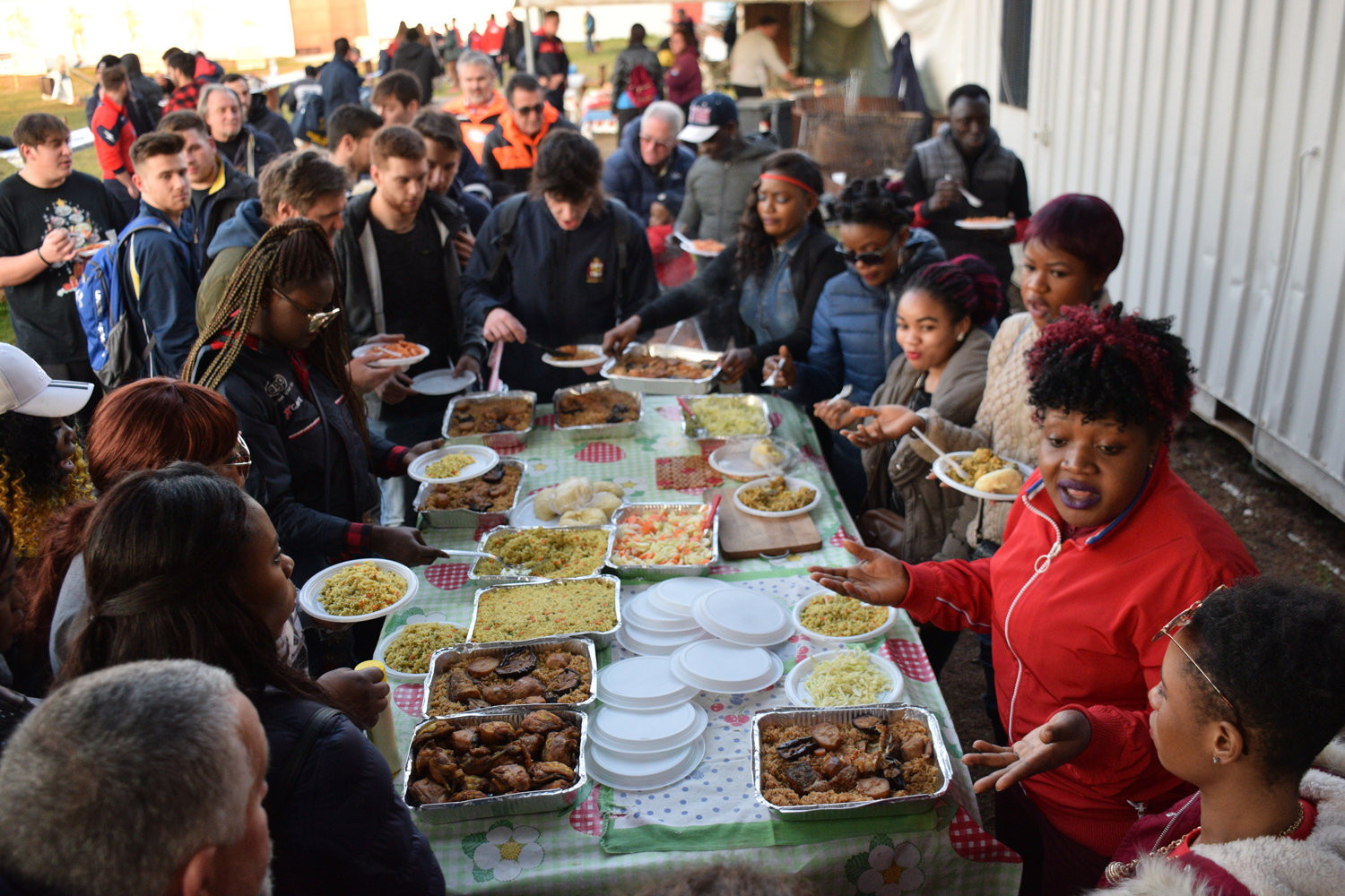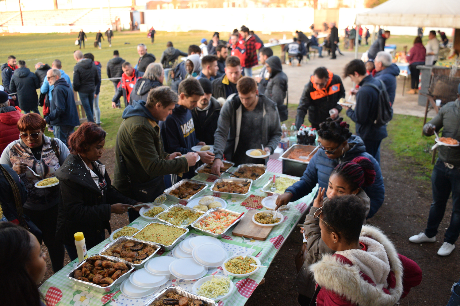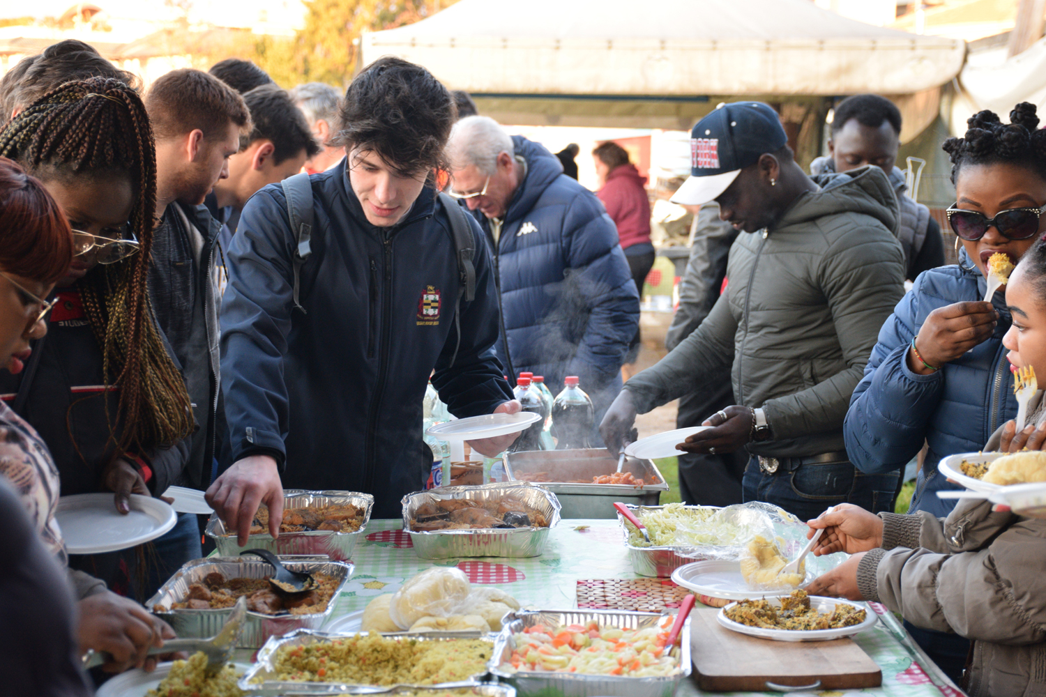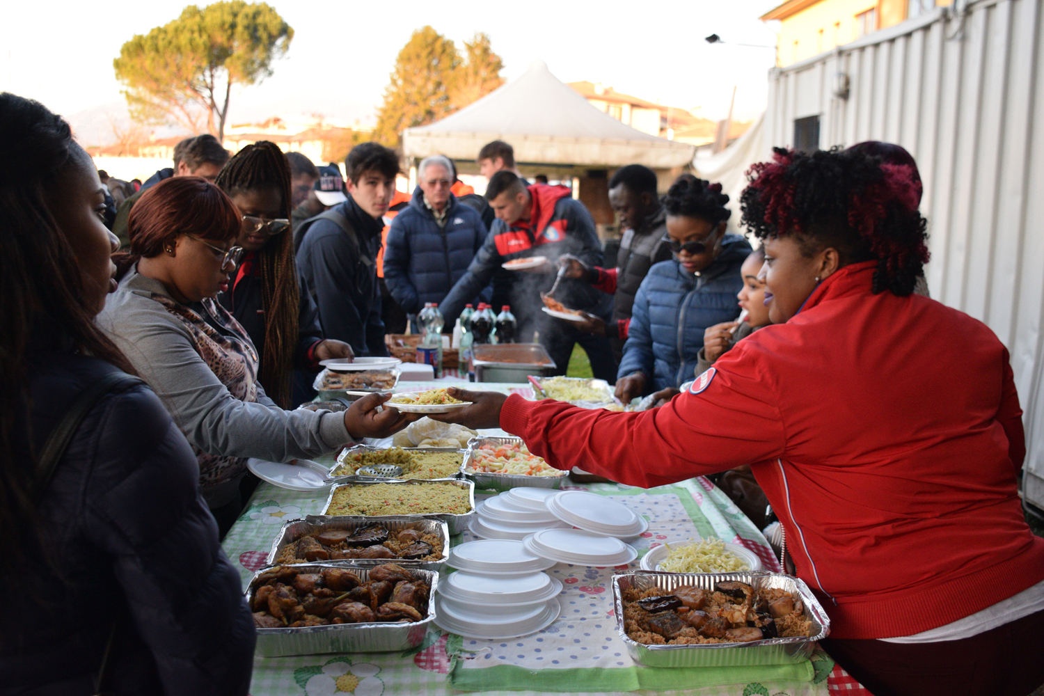 Finita la partita è stato l’ormai famoso Terzo Tempo, che maggiormente identifica lo spirito di questo sport fondato sul rispetto per l’avversario, a trasformarsi in un incredibile e partecipato momento di festa e scoperta dell’altro. Oltre 10 giovani ragazze ospiti del centro d’accoglienza de “Il Volo” hanno preparato e offerto agli oltre 500 partecipanti (giocatori delle due squadre, tifosi, Autorità e cittadini) un variegato menù multiculturale. Piatti tipici della cultura nigeriana (bankoo, fried rice, melon soup, pandyam, rigra), ma anche piatti tipici del territorio, che i rifugiati hanno studiato durante un corso di cucina realizzato lo scorso novembre presso il Circolo Arci Gallo Brillo di Rieti.