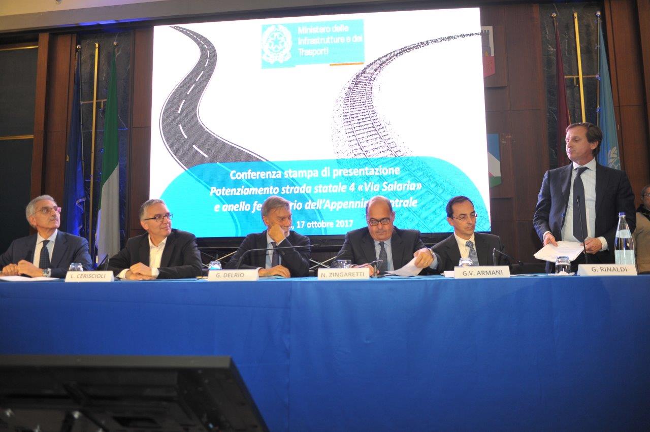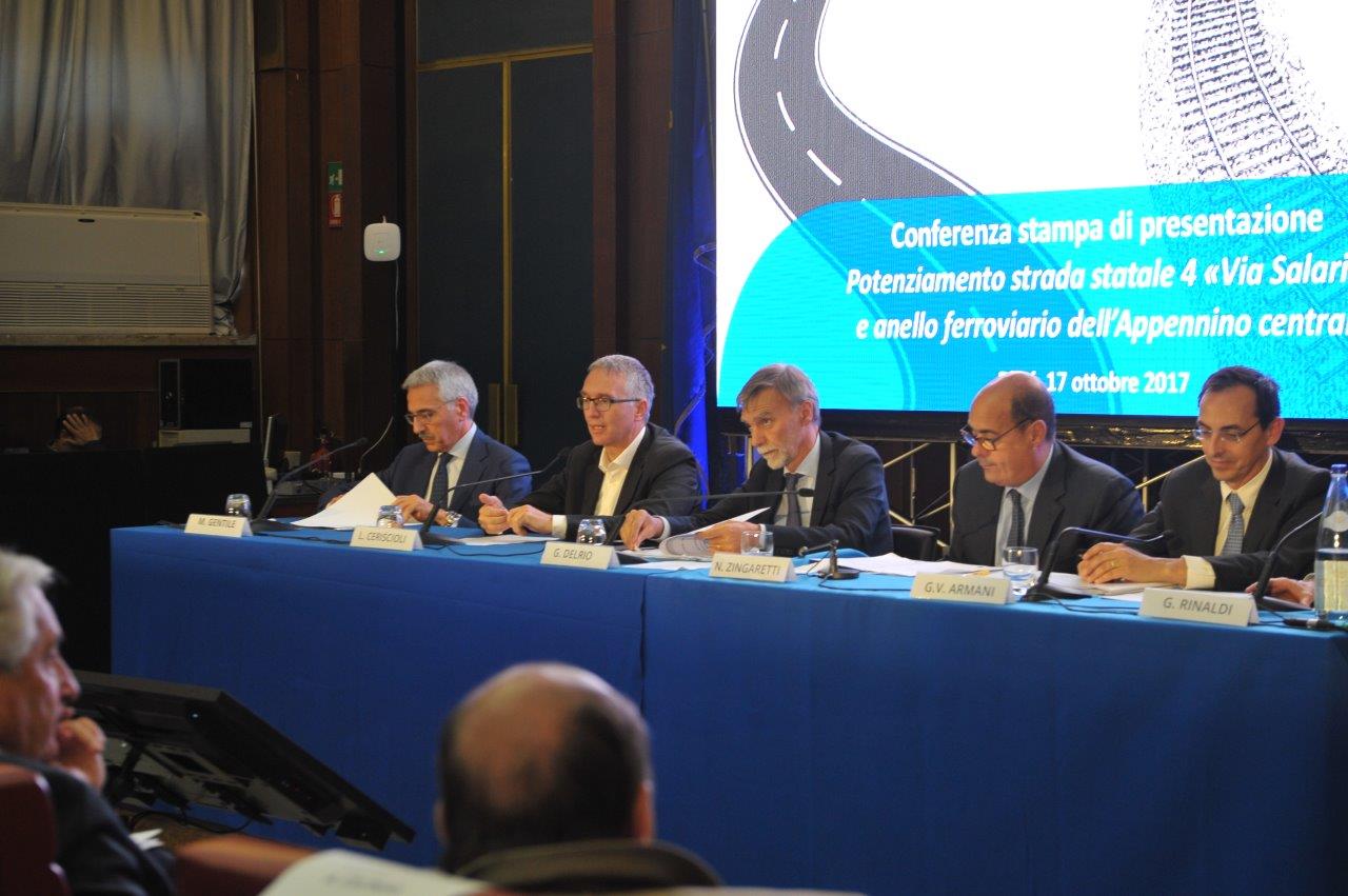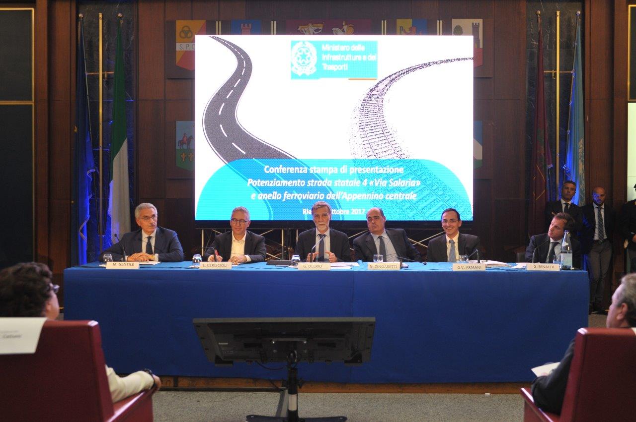 Sono quelli presentati nella mattina del 17 ottobre dal ministro delle Infrastrutture e dei Trasporti, Graziano Delrio, affiancato da Vittorio Armani, presidente e amministratore delegato di Anas, e Maurizio Gentile, amministratore delegato e direttore generale di Rete Ferroviaria Italiana, che hanno rispettivamente approfondito quanto sarà fatto per l’ammodernamento della via Salaria, «da Roma ad Ascoli Piceno», e per la mobilità su rotaia, grazie al potenziamento dell’infrastruttura esistente e alla costruzione di una nuova linea fra Rieti e Passo Corese.