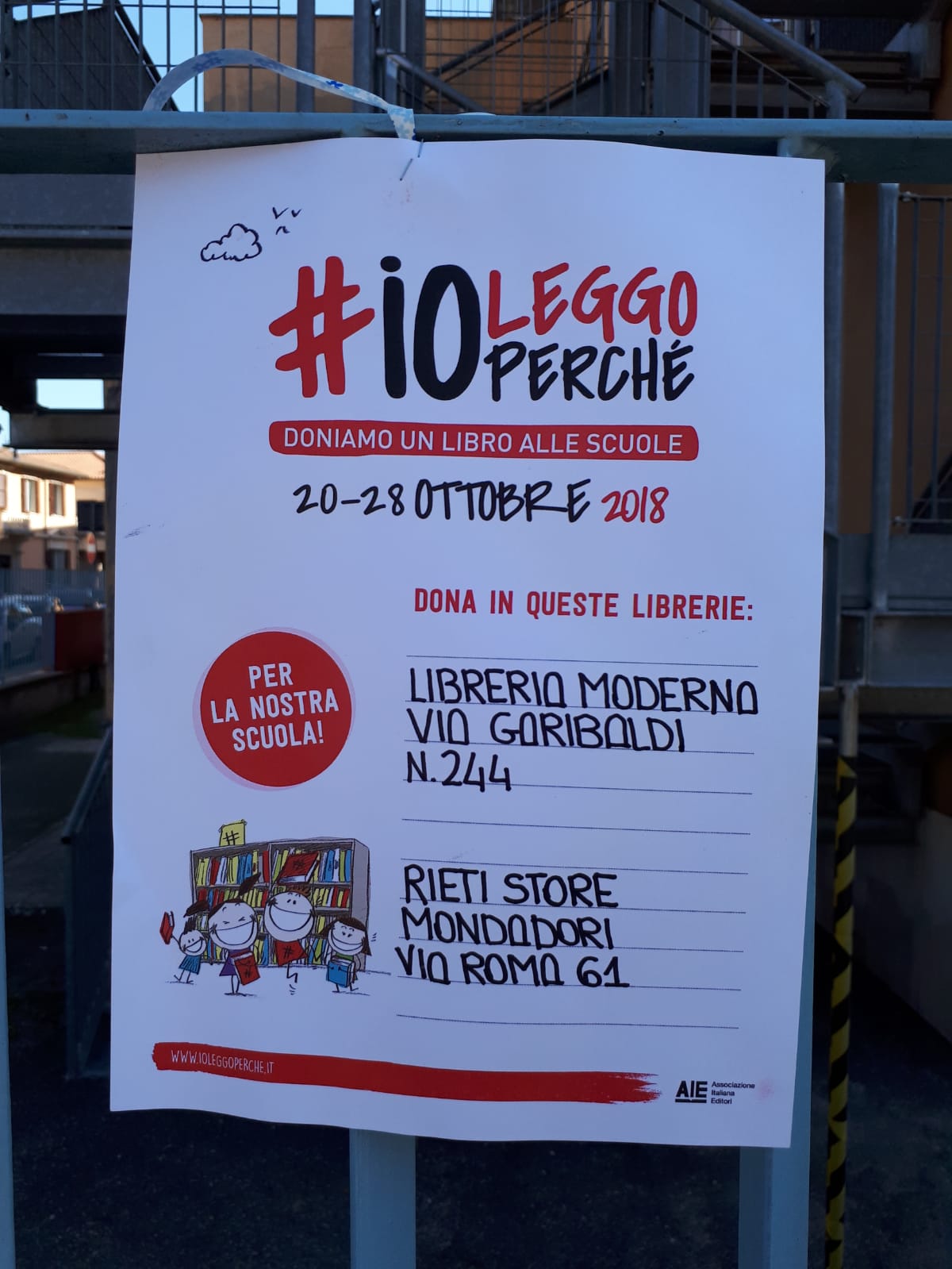 Scopo della manifestazione: richiamare l’importanza e la bellezza della lettura e promuovere l’iniziativa degli editori italiani “Io leggo perché”, invitando a recarsi alle librerie aderenti per una particolare forma di solidarietà educativa e culturale che consiste nell’acquistare un libro da inviare in dono alle biblioteche scolastiche. I reatini possono recarsi alla libreria Mondadori Bookstore Rieti (ex Gulliver, in via Roma) o alla libreria Moderna (Caffè letterario, in via Garibaldi), chiedere la lista dei titoli suggeriti dalla scuola – ma si può scegliere qualunque altro testo – ed effettuare la donazione (i volumi donati saranno consegnati dalle librerie stesse alle scuole, con il nominativo di chi dona, se non preferisce restare anonimo). C’è tempo fino al 28 ottobre per partecipare all’iniziativa.