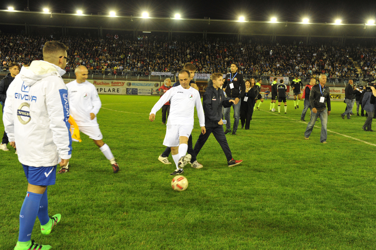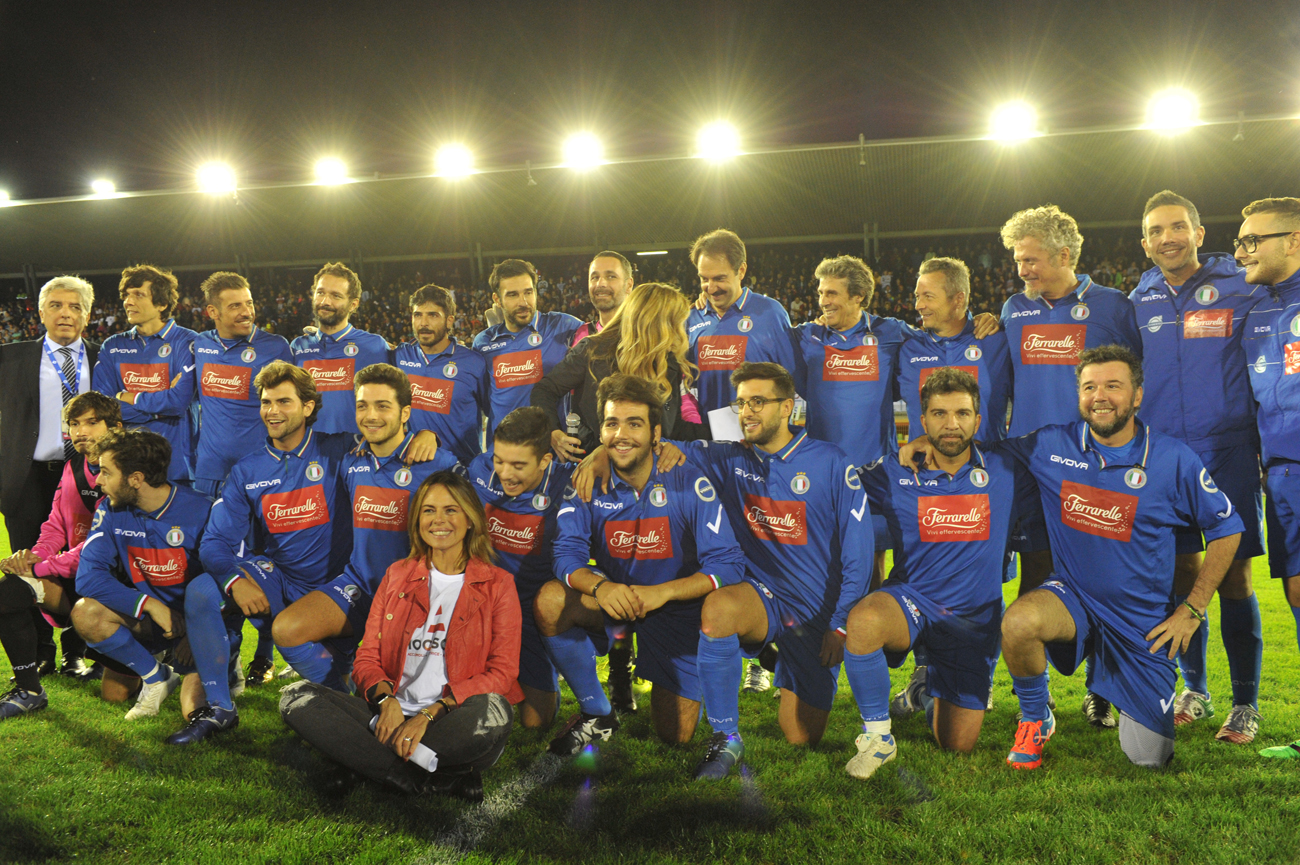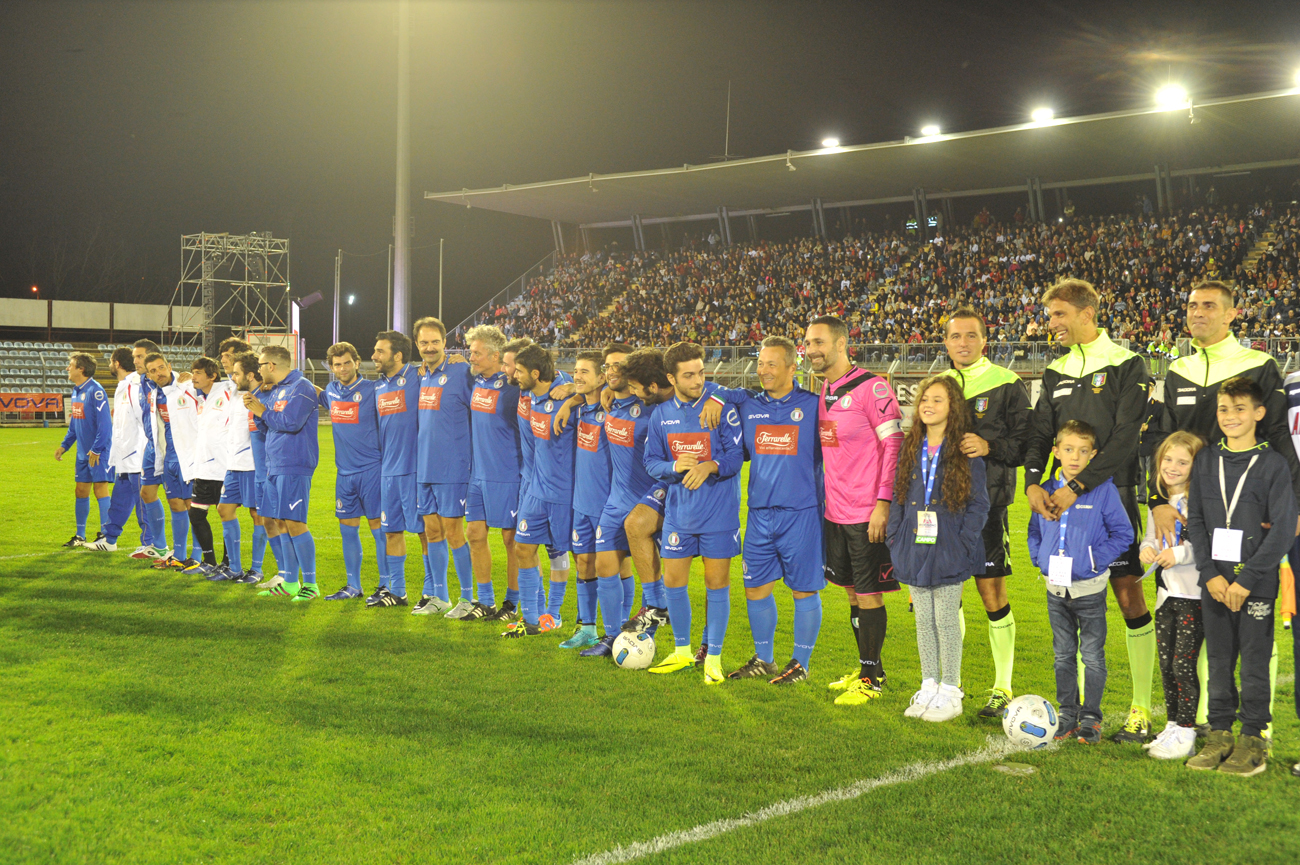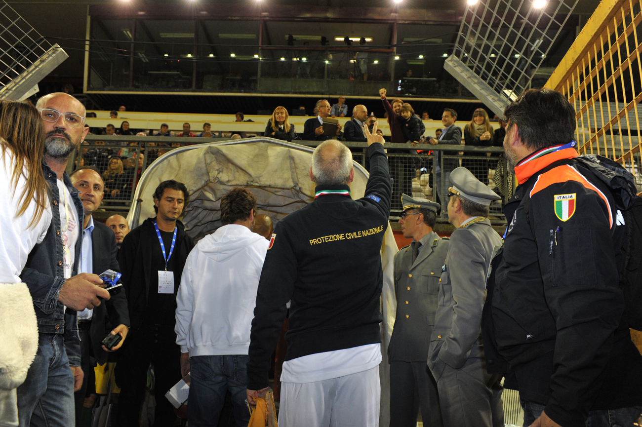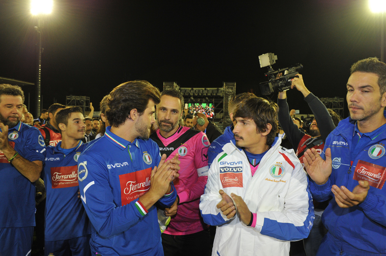 L’appuntamento è stato aperto dal canto di Andrea Bocelli, registrato il giorno prima tra le macerie di Amatrice, in contrappunto al testo francescano letto da Raoul Bova. Poi la discesa in campo delle squadre, con l’inno nazionale suonato dalla banda della Polizia di Stato, il “Sì!” all’unisono del pubblico.