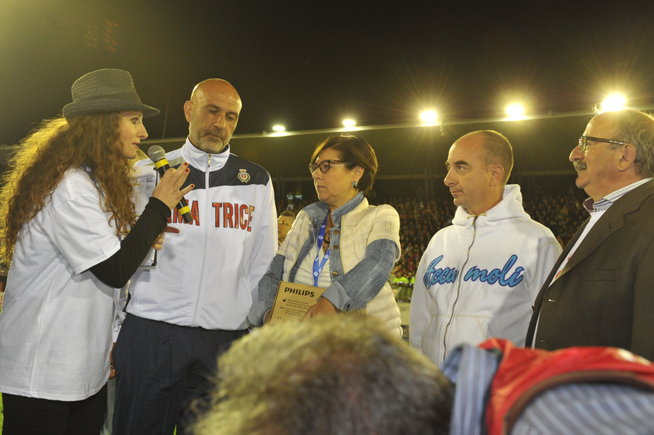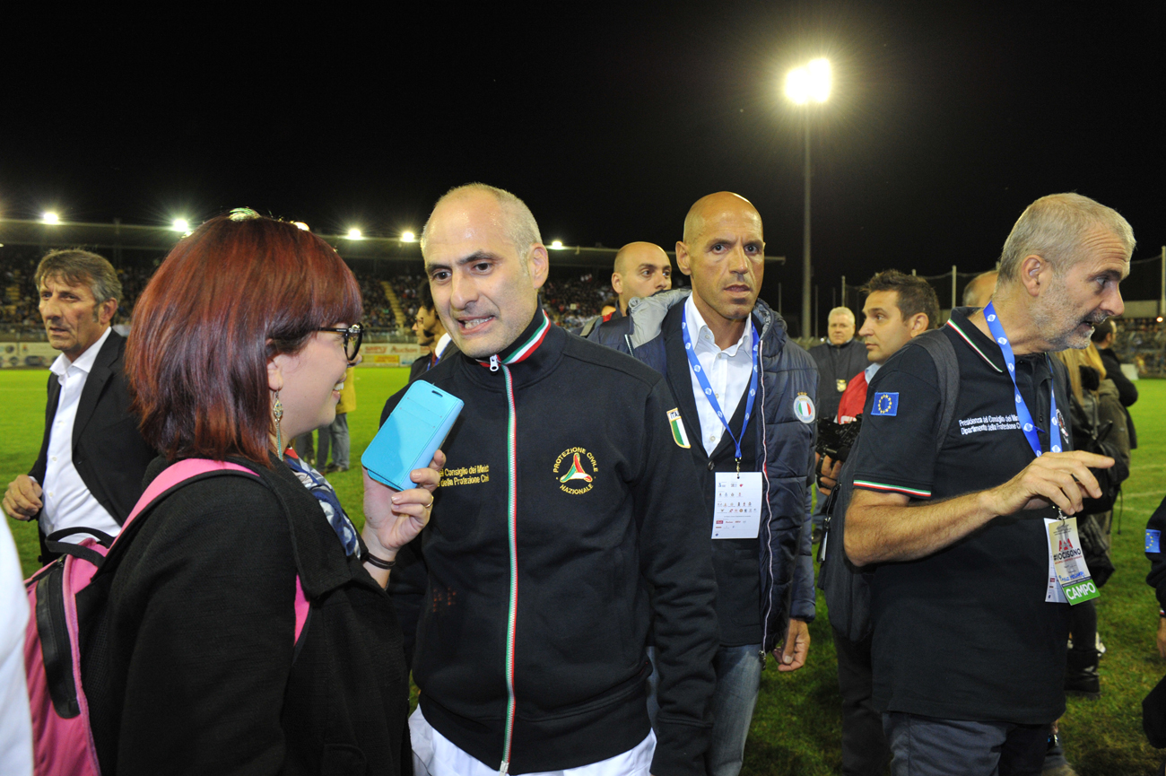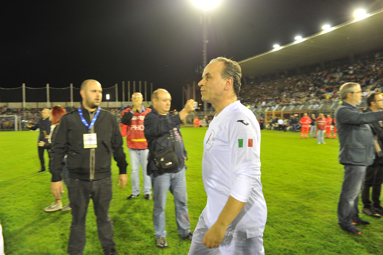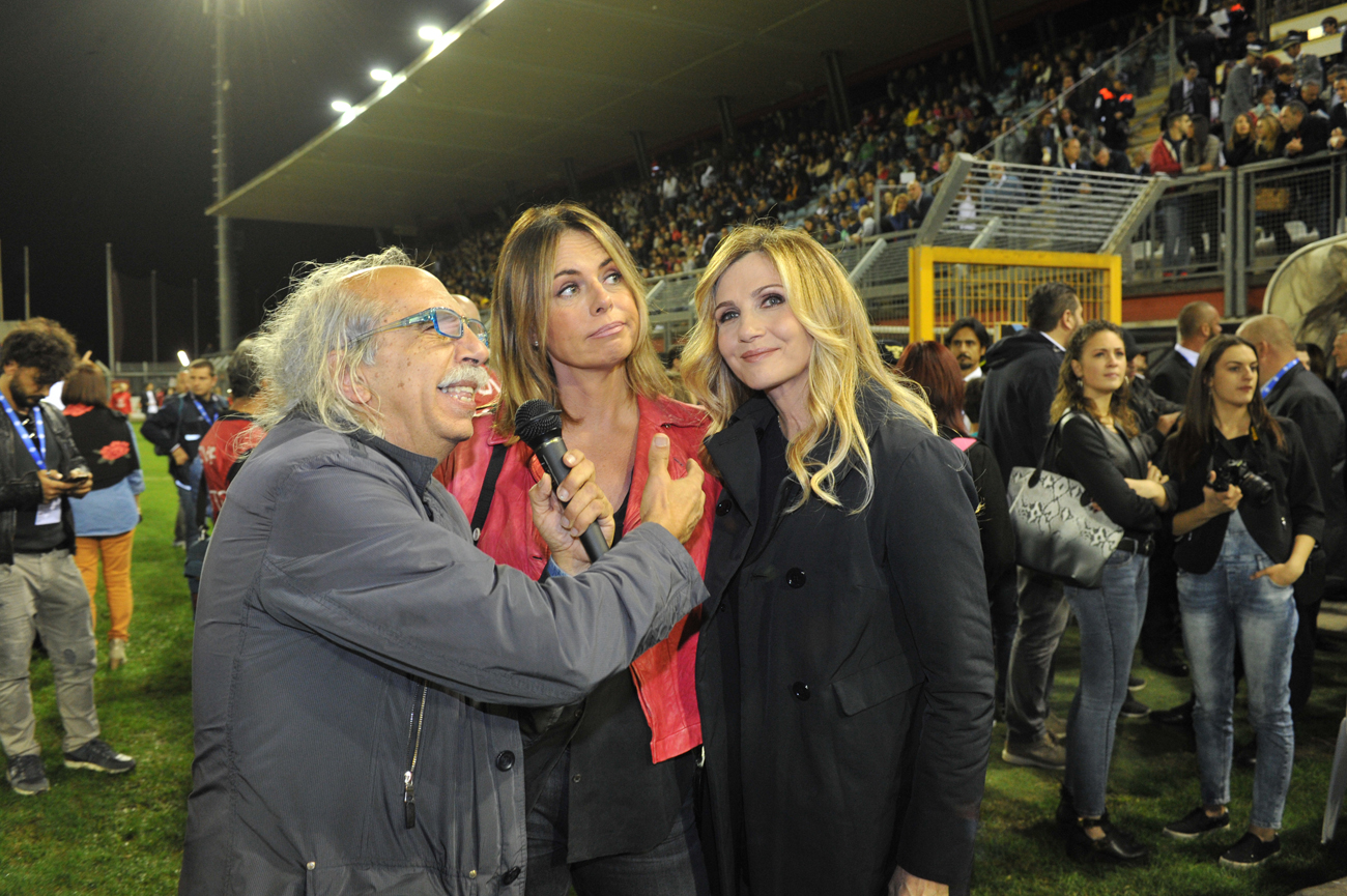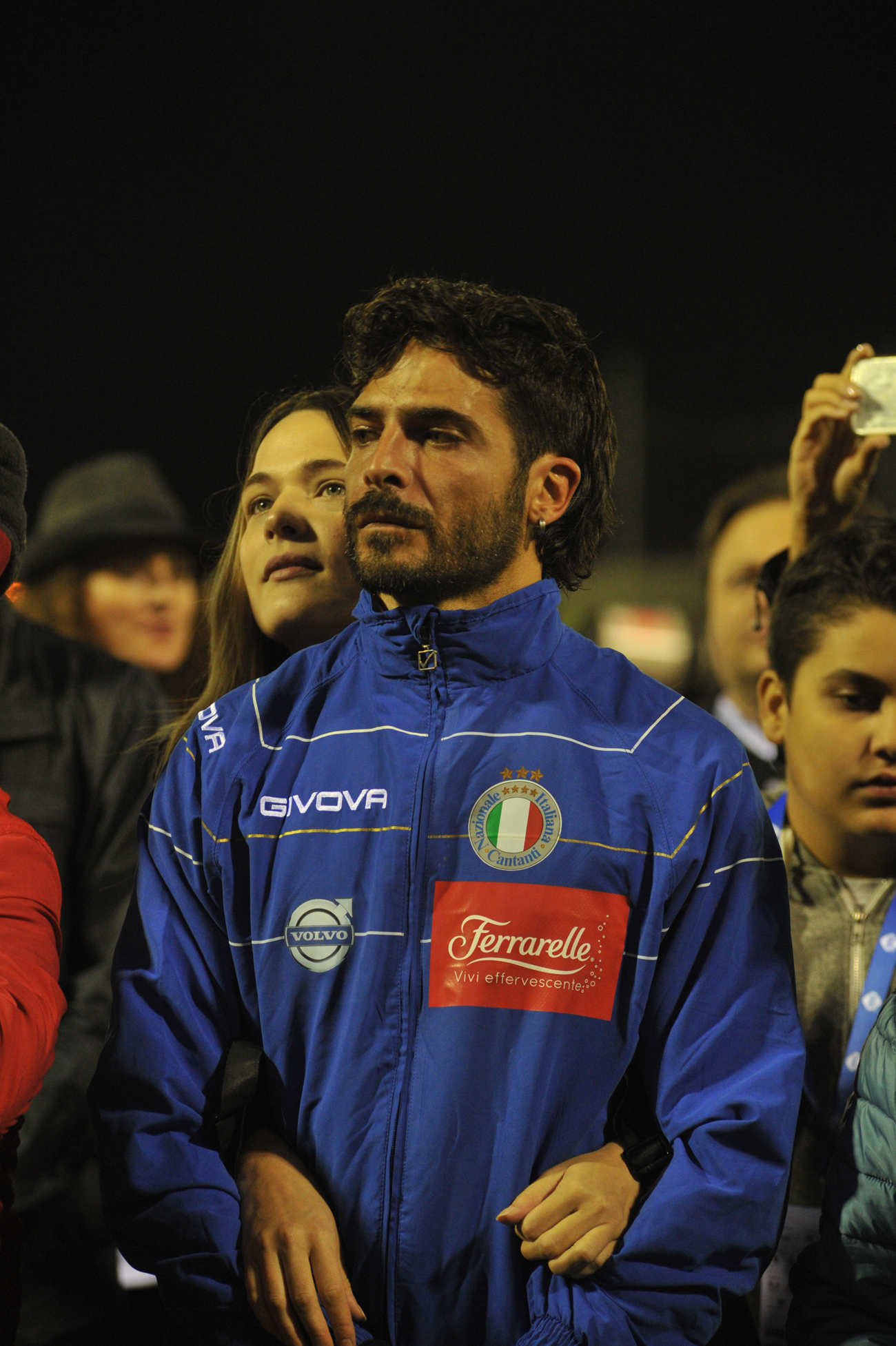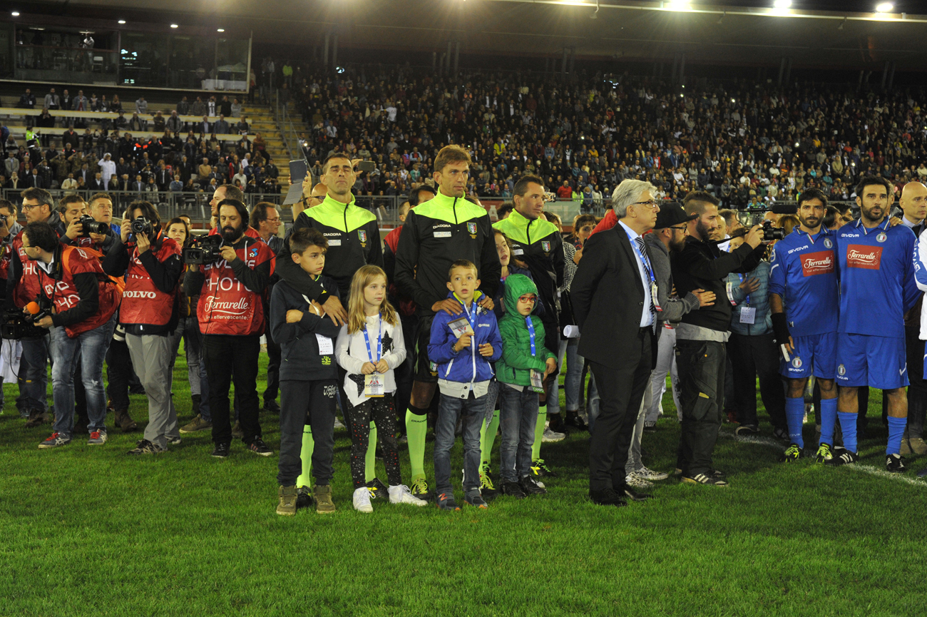 L’appuntamento è stato aperto dal canto di Andrea Bocelli, registrato il giorno prima tra le macerie di Amatrice, in contrappunto al testo francescano letto da Raoul Bova. Poi la discesa in campo delle squadre, con l’inno nazionale suonato dalla banda della Polizia di Stato, il “Sì!” all’unisono del pubblico.