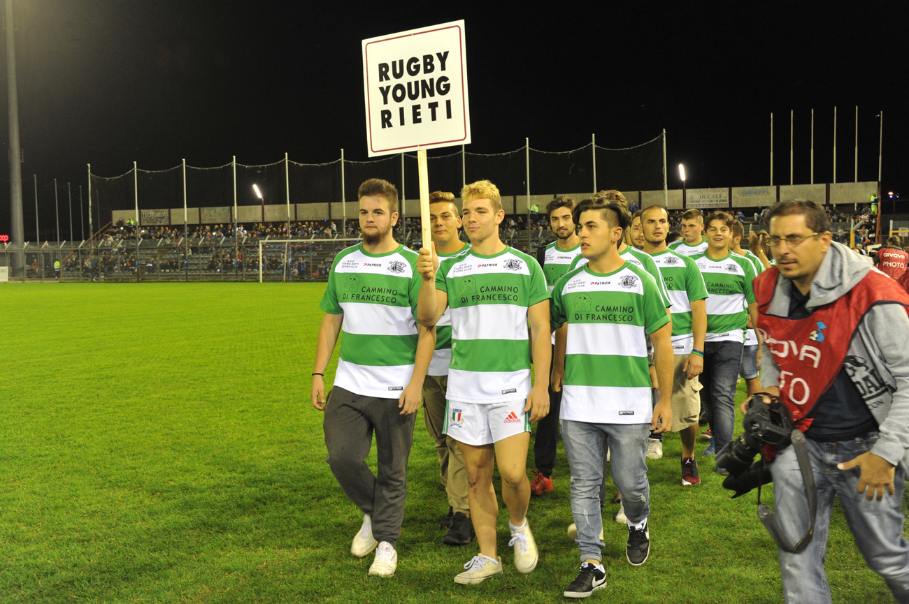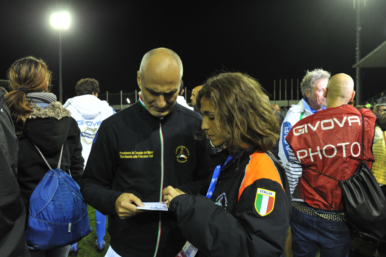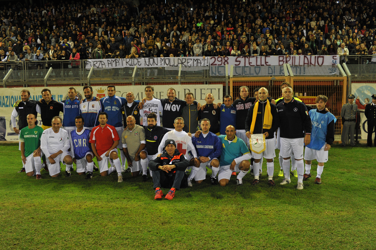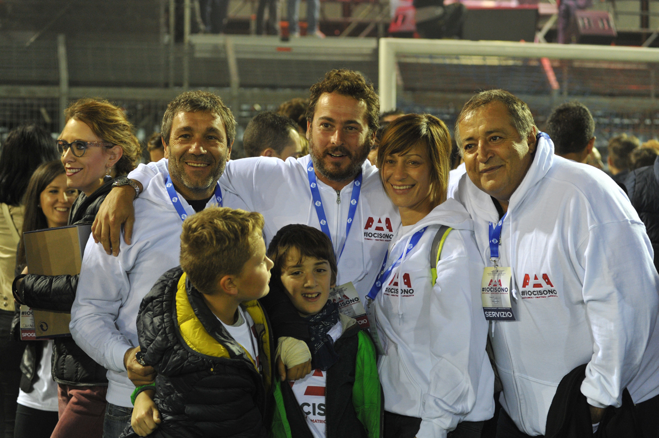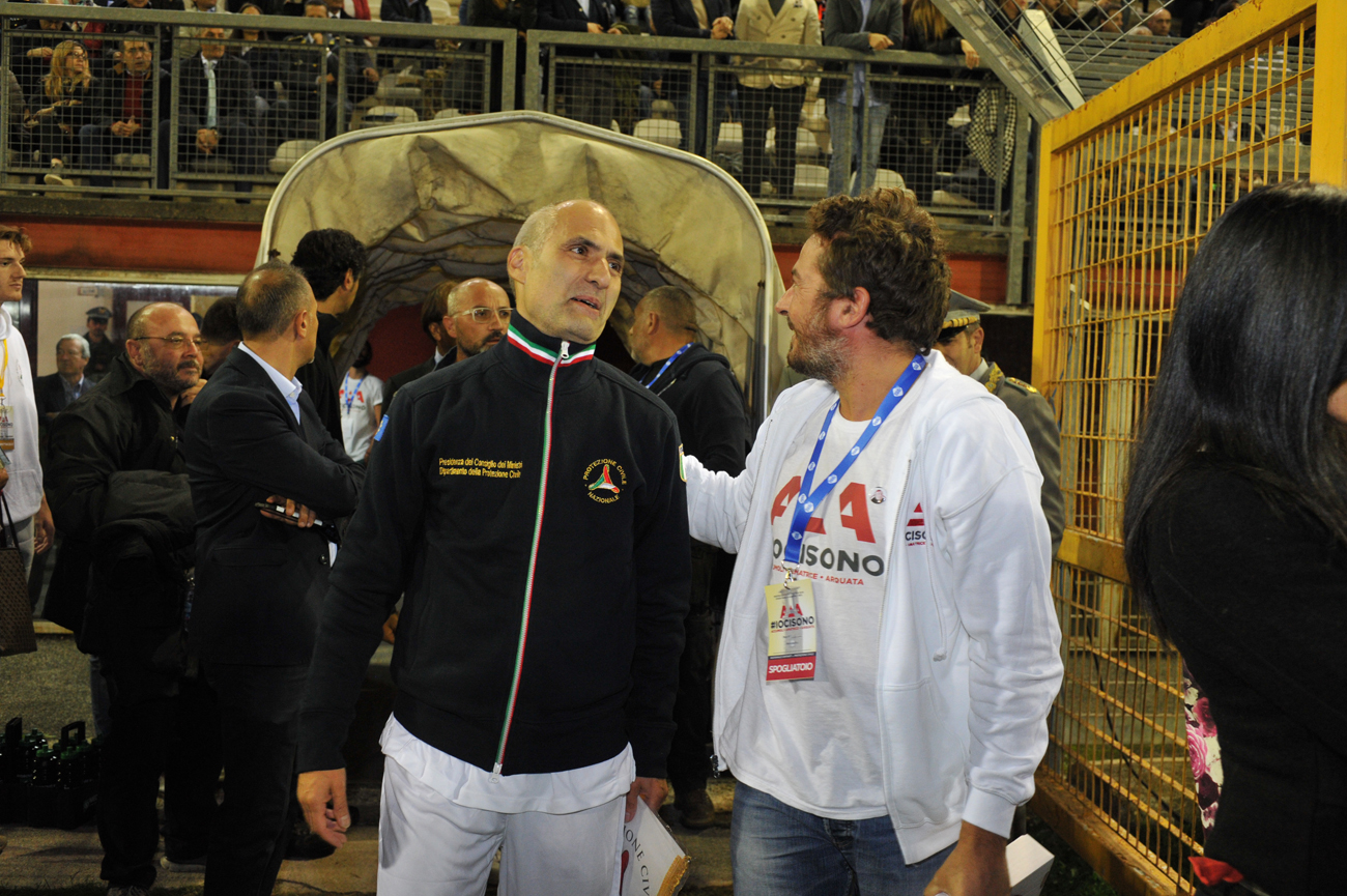 L’appuntamento è stato aperto dal canto di Andrea Bocelli, registrato il giorno prima tra le macerie di Amatrice, in contrappunto al testo francescano letto da Raoul Bova. Poi la discesa in campo delle squadre, con l’inno nazionale suonato dalla banda della Polizia di Stato, il “Sì!” all’unisono del pubblico.
