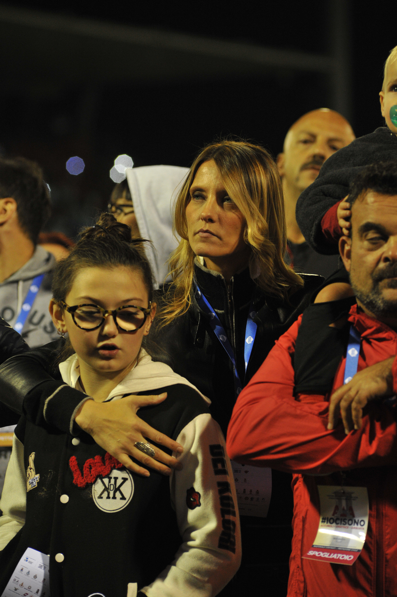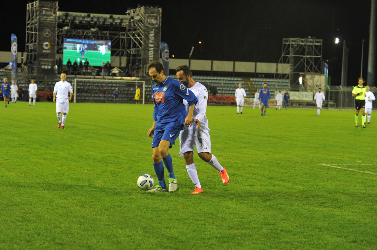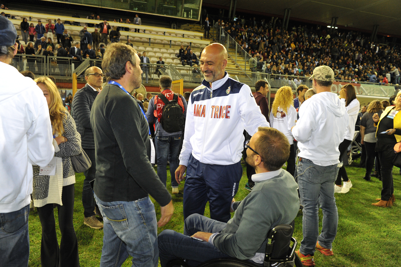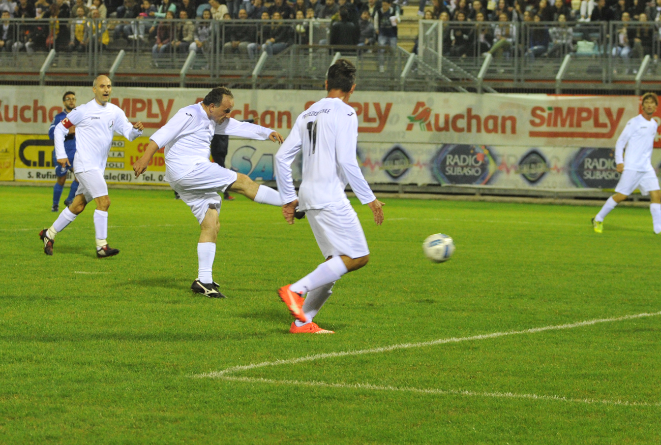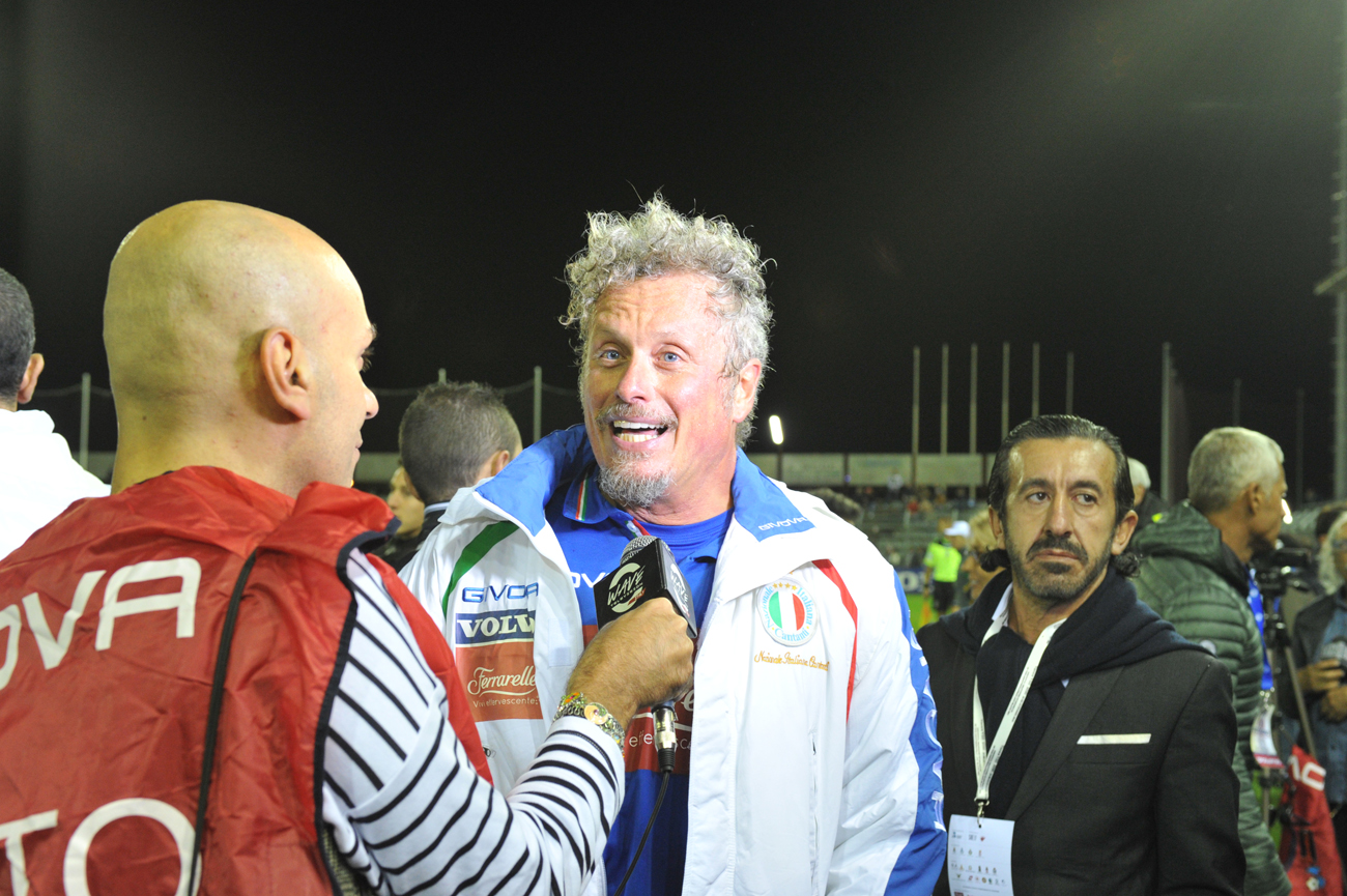 L’appuntamento è stato aperto dal canto di Andrea Bocelli, registrato il giorno prima tra le macerie di Amatrice, in contrappunto al testo francescano letto da Raoul Bova. Poi la discesa in campo delle squadre, con l’inno nazionale suonato dalla banda della Polizia di Stato, il “Sì!” all’unisono del pubblico.