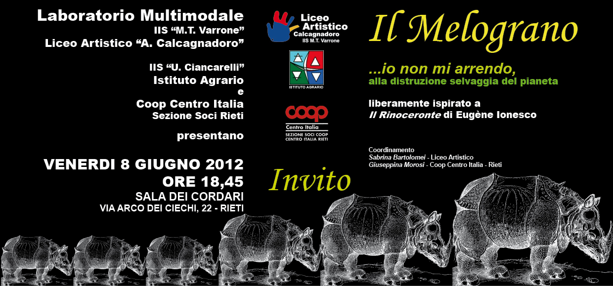Il laboratorio multimodale del Liceo Artistico “A.Calcagnadoro” ha realizzato quest’anno uno spettacolo a sostegno della salvaguardia dell’ambiente, supportato, come lo scorso anno, dalla COOP Centro Italia Sezione Soci di Rieti che, da sempre sensibile a queste problematiche, ha già promosso un interessante convegno sulla lotta alle mafie e alcune giornate di piantumazione di specie arboree.