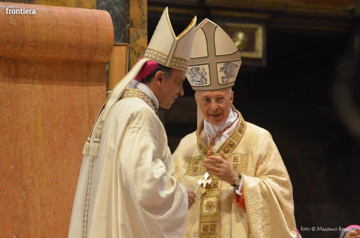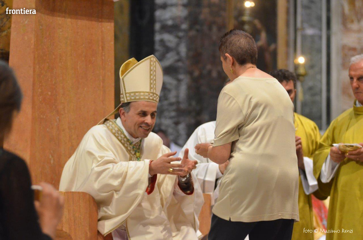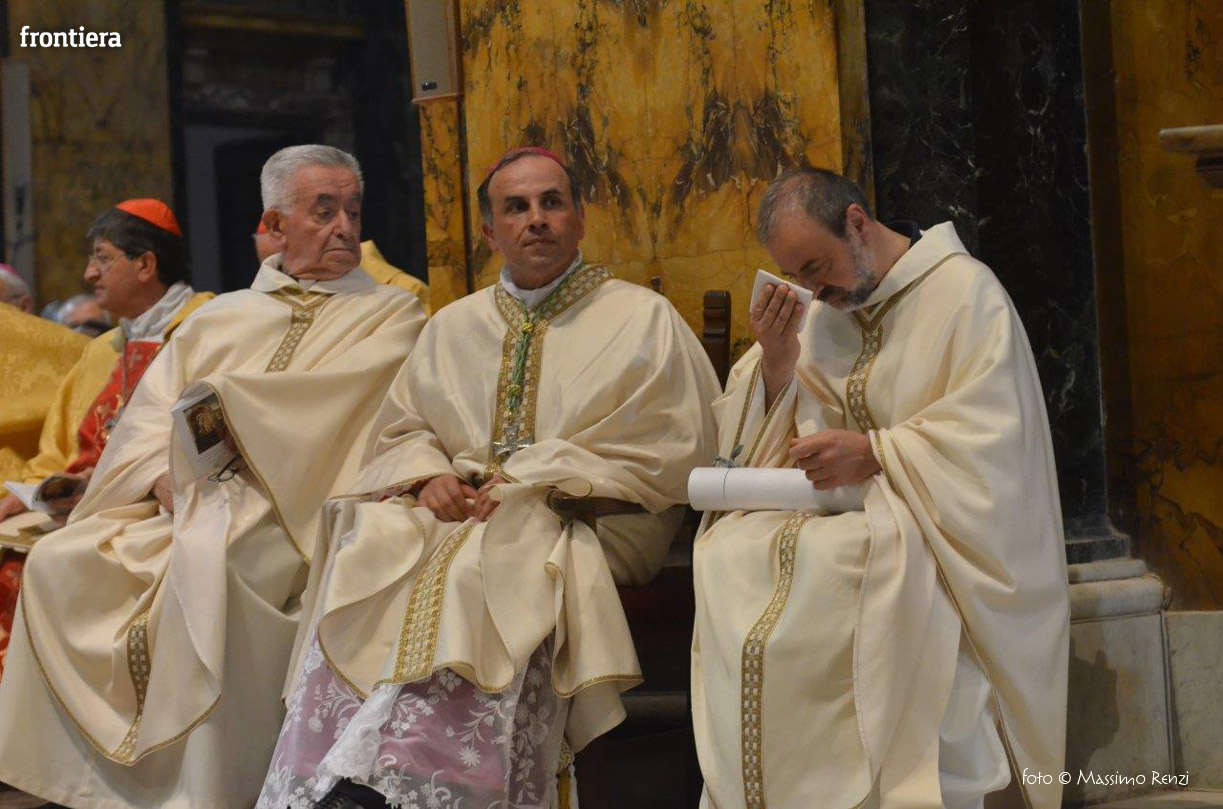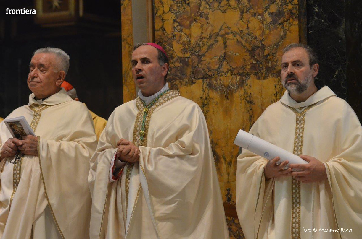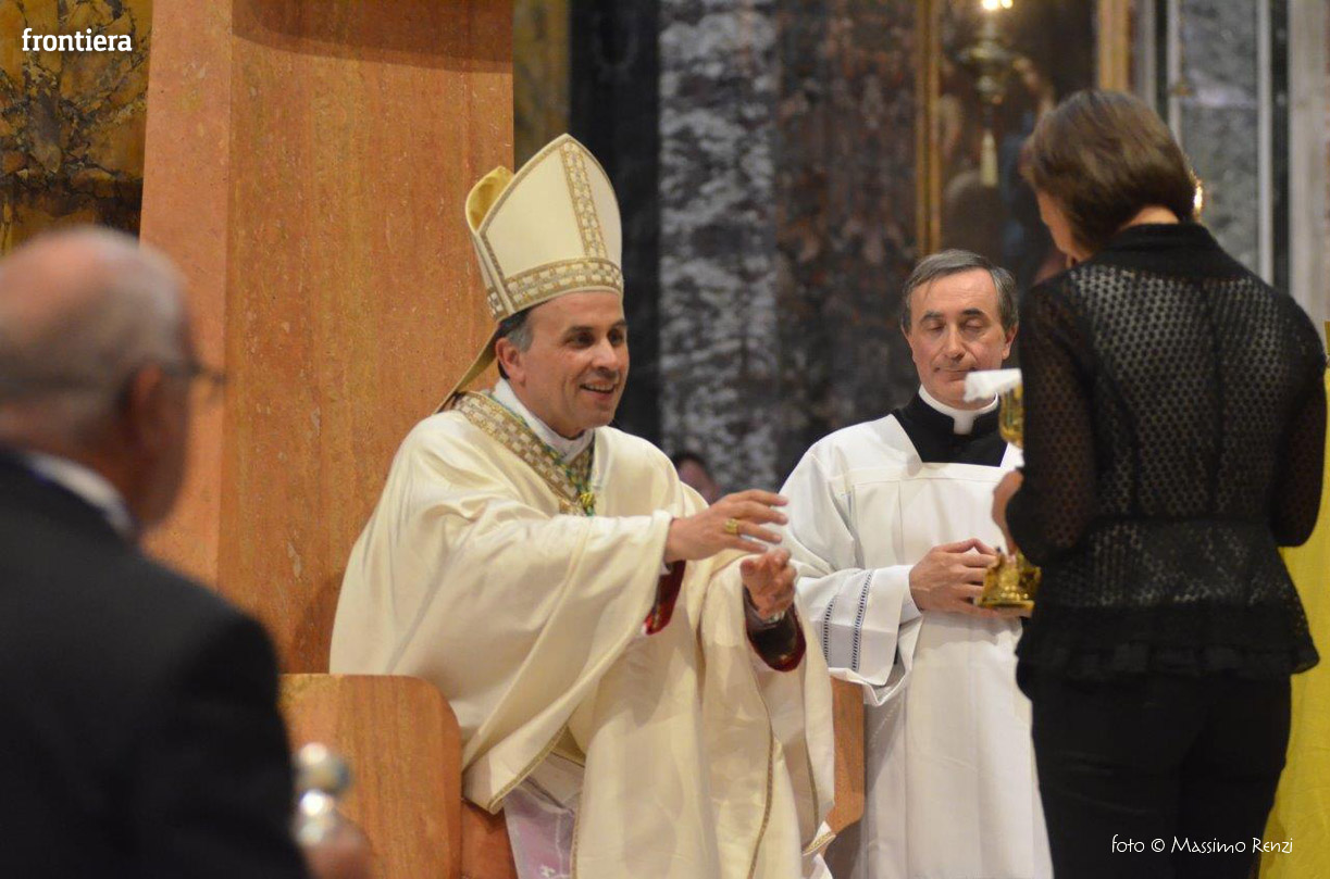 La liturgia festosa e solenne dell’ordinazione di monsignor Pompili si è compiuta senza soluzione di continuità con l’insediamento sulla cattedra, che insieme con il pastorale è simbolo del mandato episcopale che si manifesta nella guida e l’insegnamento dottrinale.