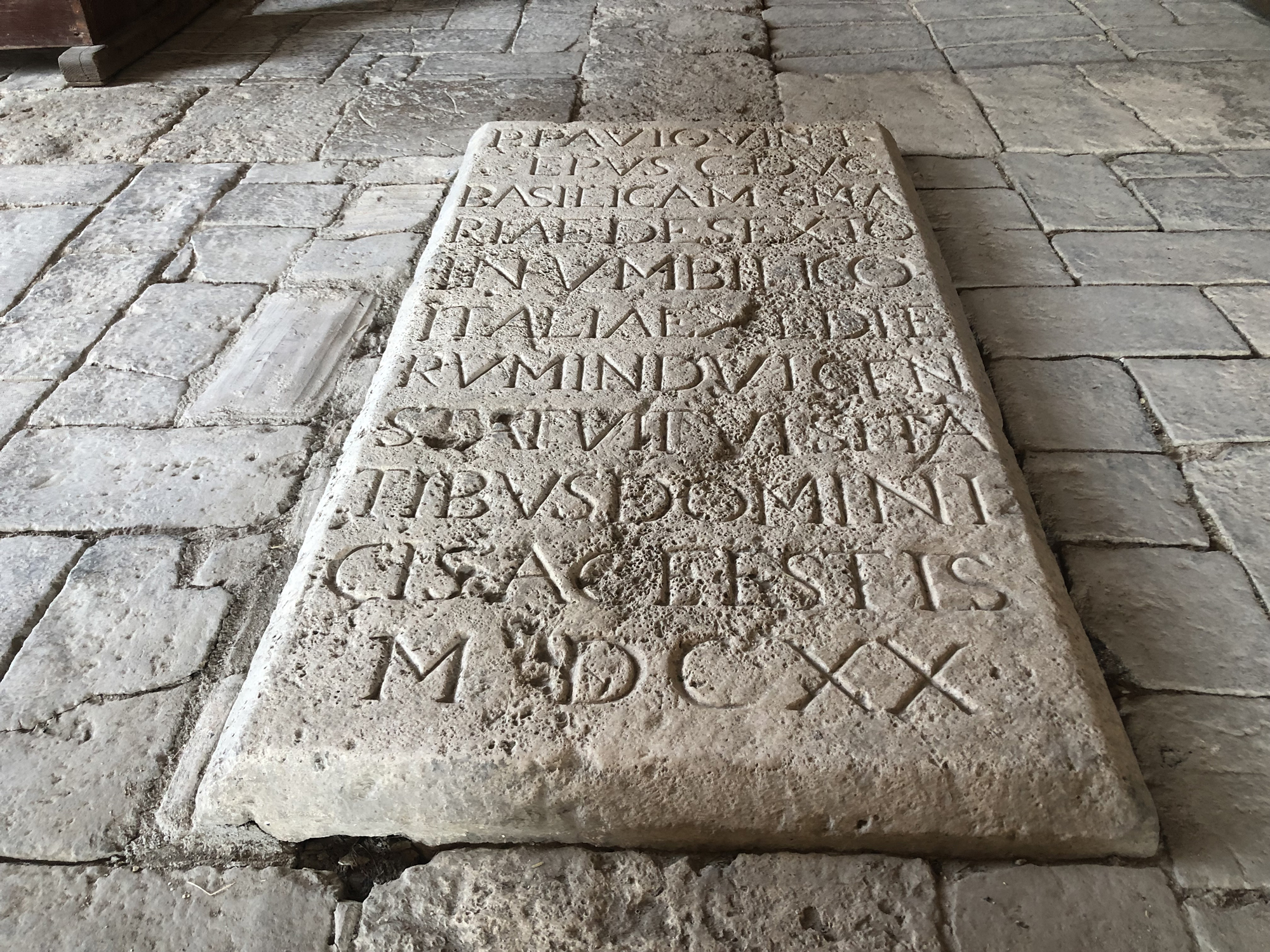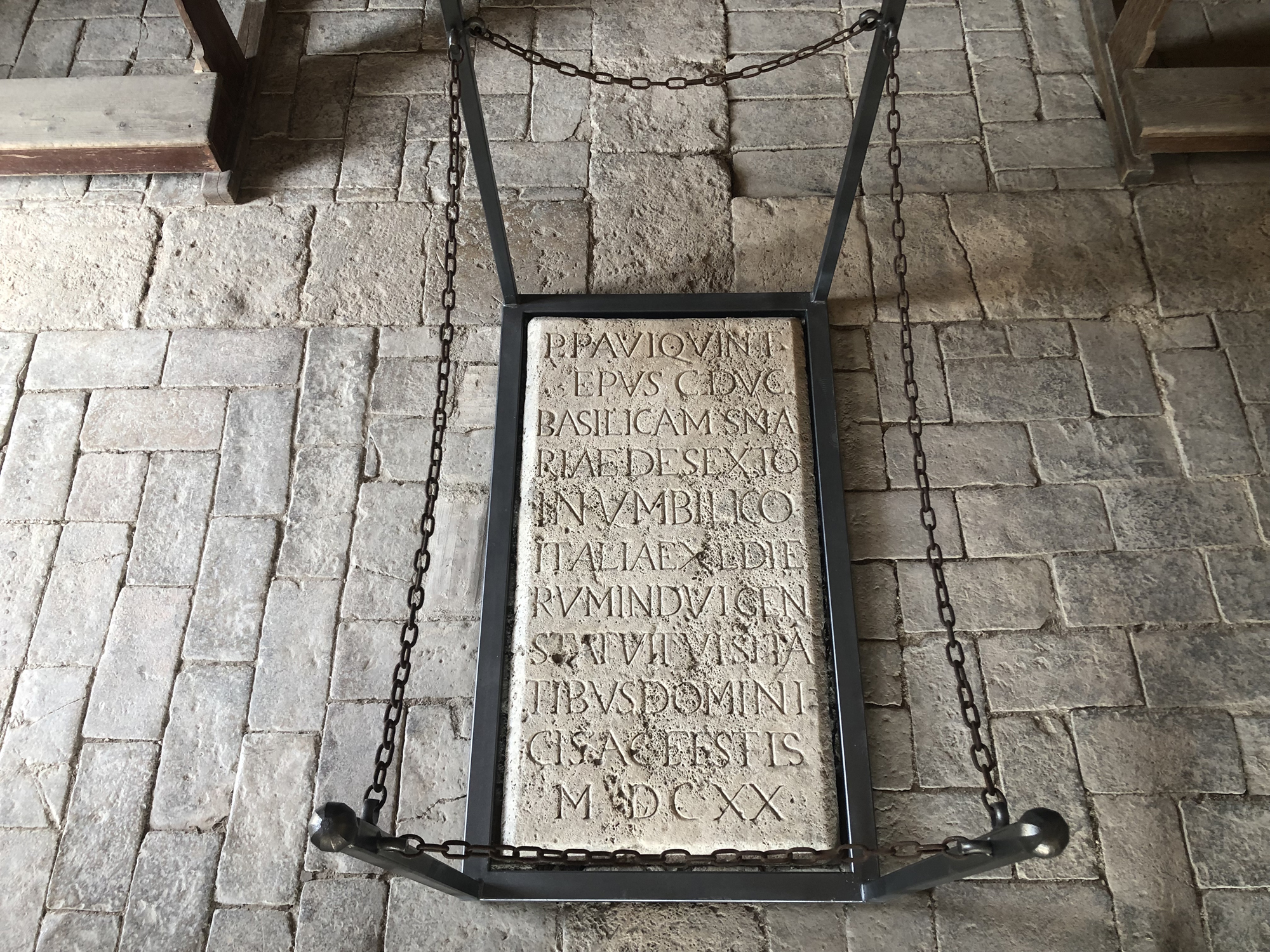 Le incisioni recitano “P. APUL. QUINT. EP.US C.DUCALIS BASILICAM S. MARIAE DE SEXTO IN UMBILICO ITALIAE XL DIERUM INDULG. STAT. VIST. DOM. AC FESTIS A.D. MDCXX”. Ad una prima lettura potrebbe sfuggire il fatto che il vescovo indichi questo luogo come “UMBILICO ITALIAE” ma è un particolare di estrema rilevanza se si pensa che anche in diversi autori latini, come Plinio il Vecchio, si ritrovano le stesse indicazioni geografiche che porterebbero ad individuare in questo territorio il vero centro d’Italia.