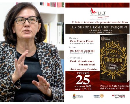 Su invito dell’Associazione di Rieti della LILT (Lega italiana per la lotta contro i timori) venerdì 25 novembre alle ore 17, nella Sala consiliare del Comune la scrittrice Emma Pomilio presenterà il suo ultimo libro, edito da Mondadori “La grande Roma dei Tarquini”.