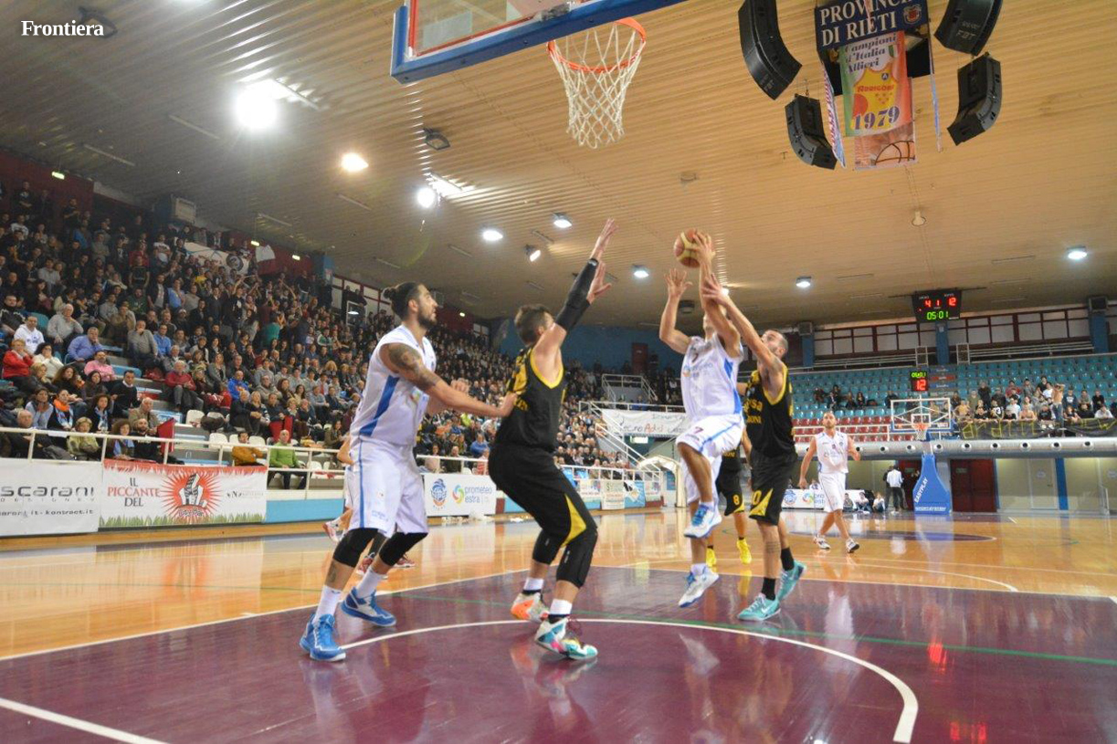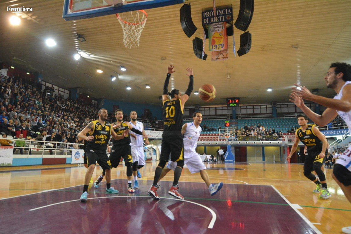 Stanic allora prende in mano la situazione e va a canestro. Spizzichini e Rosignoli e Benedusi con una tripla portano Rieti in vantaggio 13-12 quando mancano 2:52 ed il palas esplode con una pioggia di coriandoli colorati.Rosignoli segna da due (15-12), Montegranaro è costretto a chiamare time out. Poi tra i cori del pubblico entra Feliciangeli ed il primo quarto finisce 22-18 per i nostri.