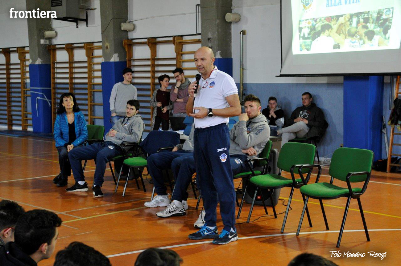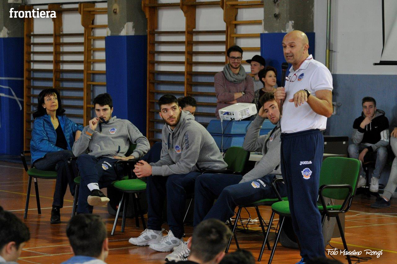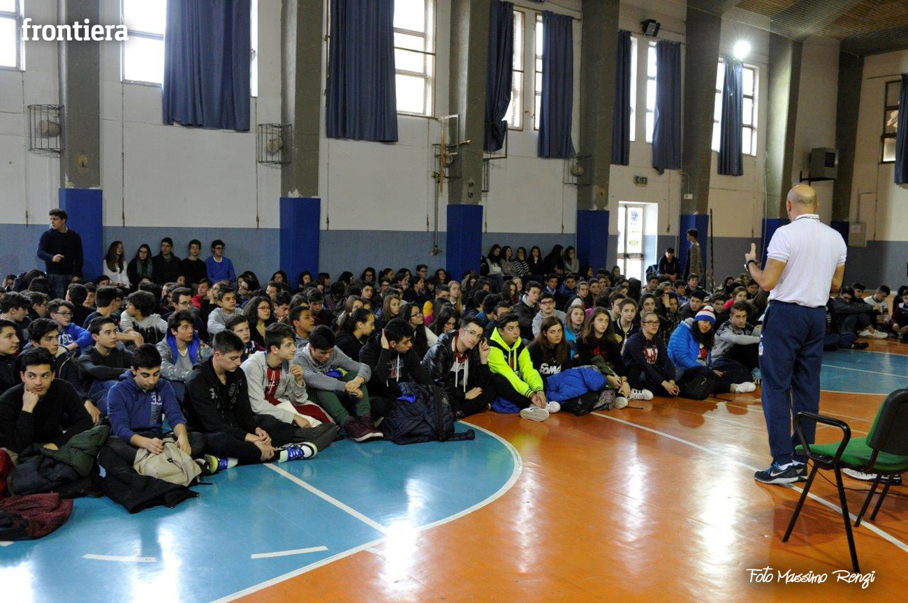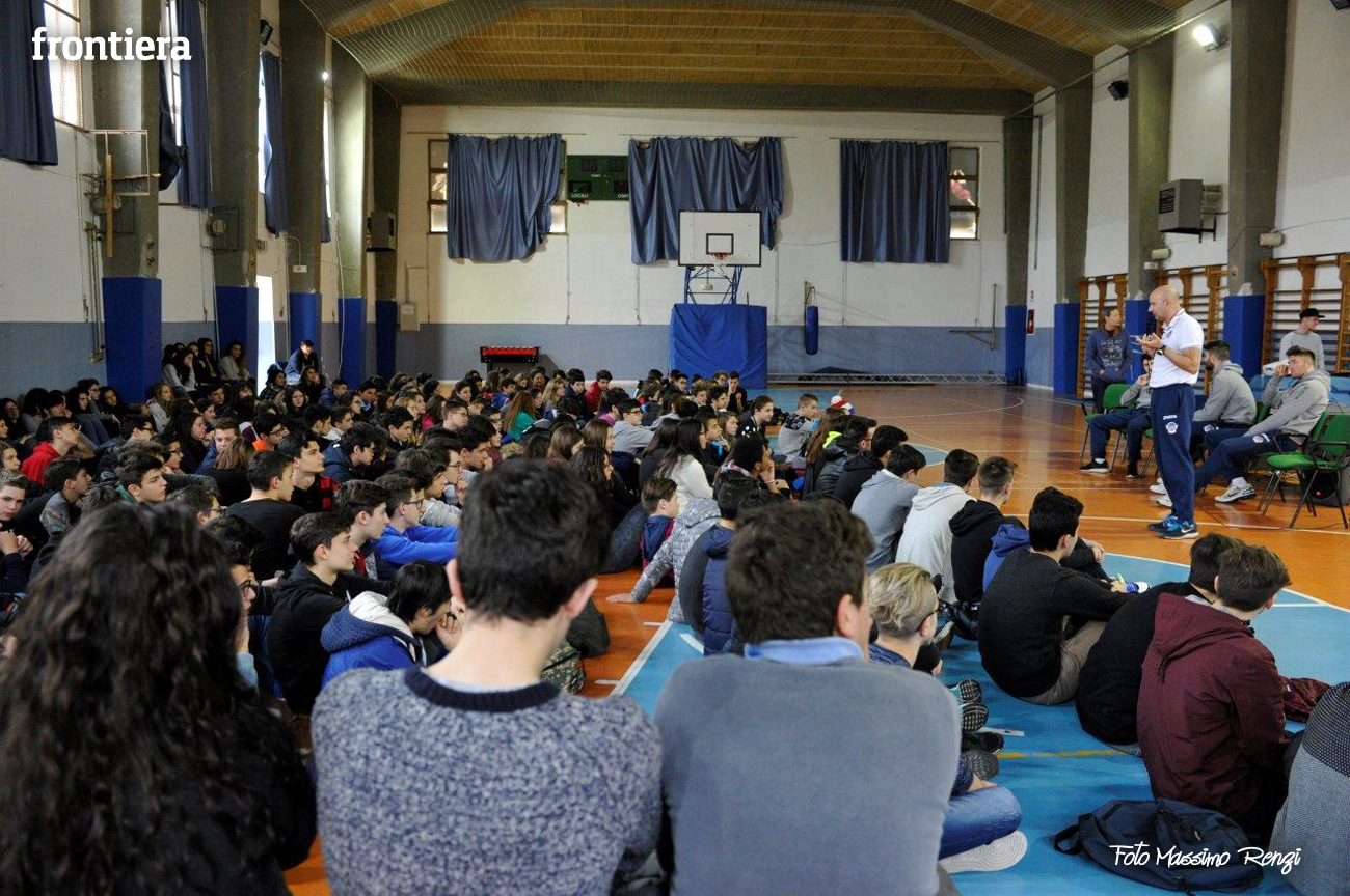 Coach luciano Nunzi, Dalton Pepper, Francesco Veccia e Gianluca Della Rosa hanno incontrato gli studenti del biennio che si erano radunati nella palestra della scuola per partecipare alla presentazione sul tema de “Lo Sport educa alla vita”.