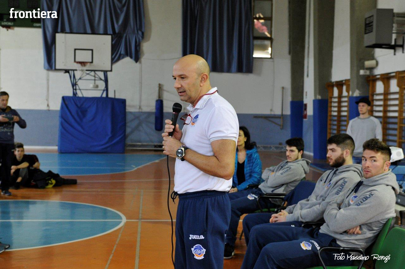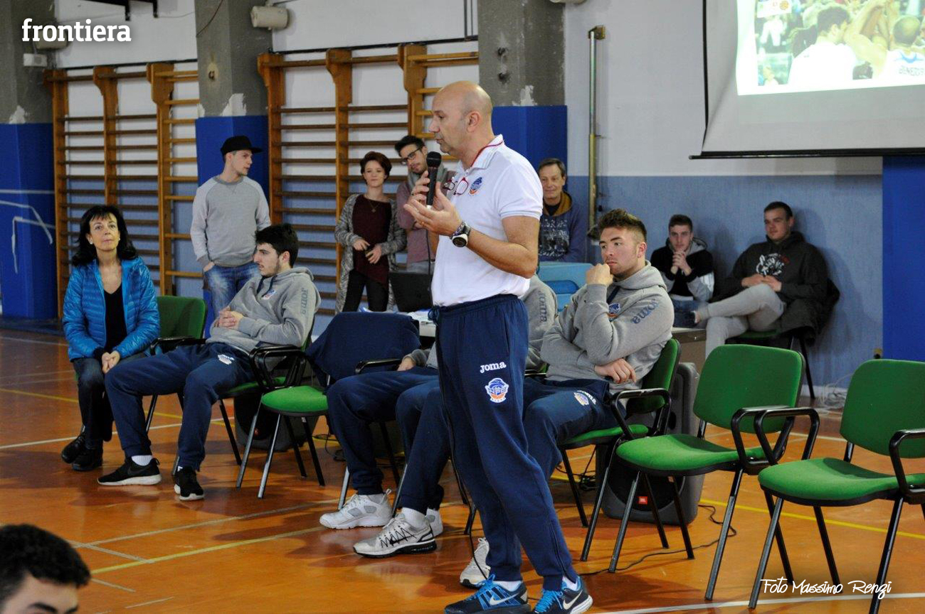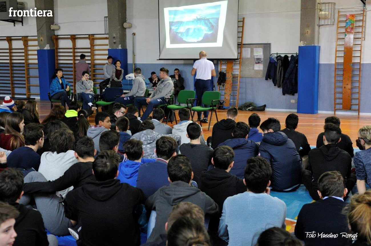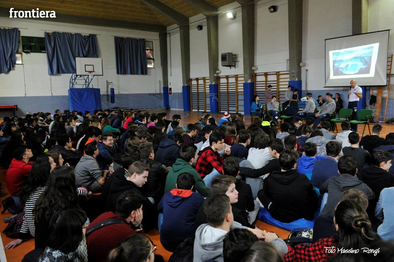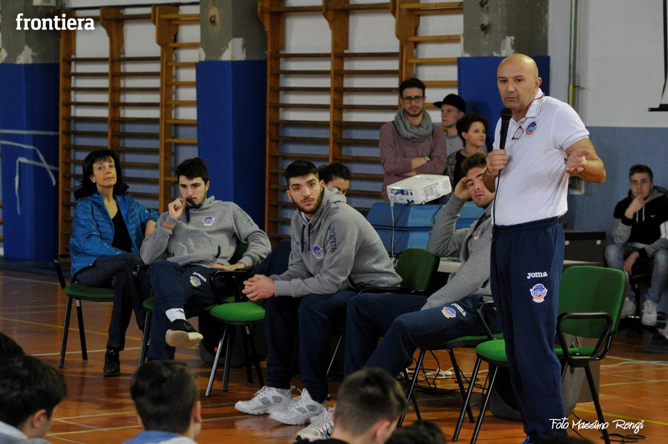 Coach luciano Nunzi, Dalton Pepper, Francesco Veccia e Gianluca Della Rosa hanno incontrato gli studenti del biennio che si erano radunati nella palestra della scuola per partecipare alla presentazione sul tema de “Lo Sport educa alla vita”.