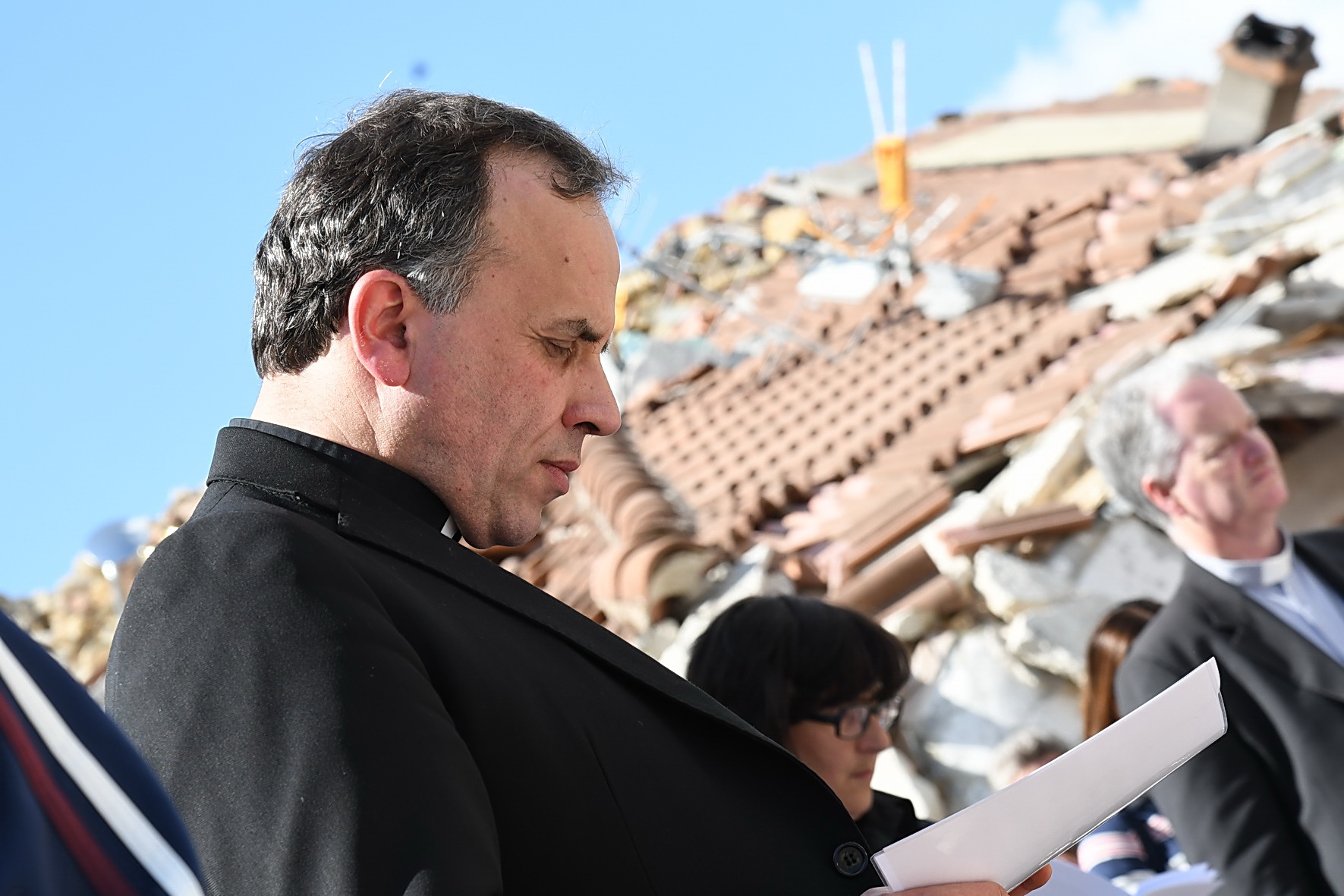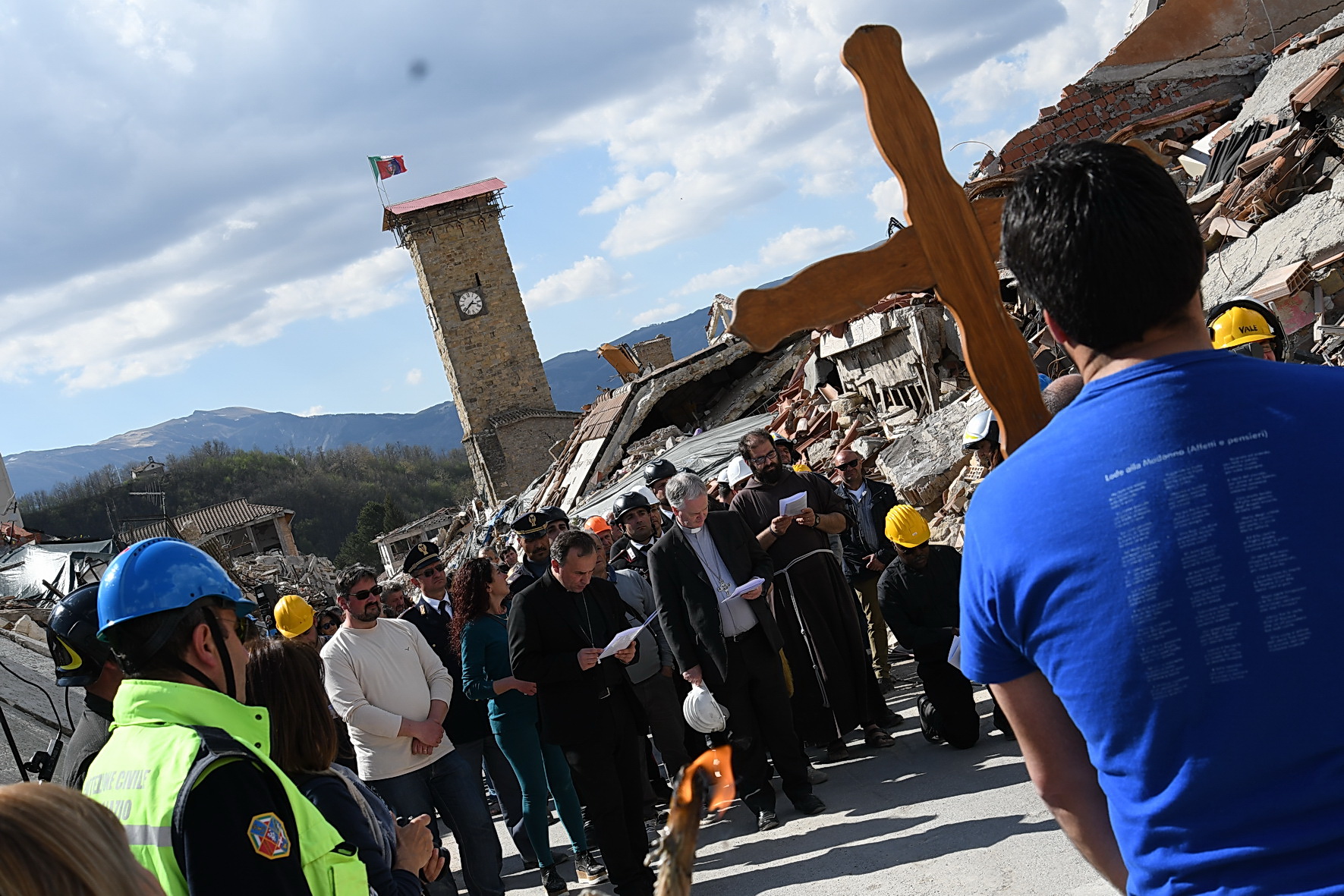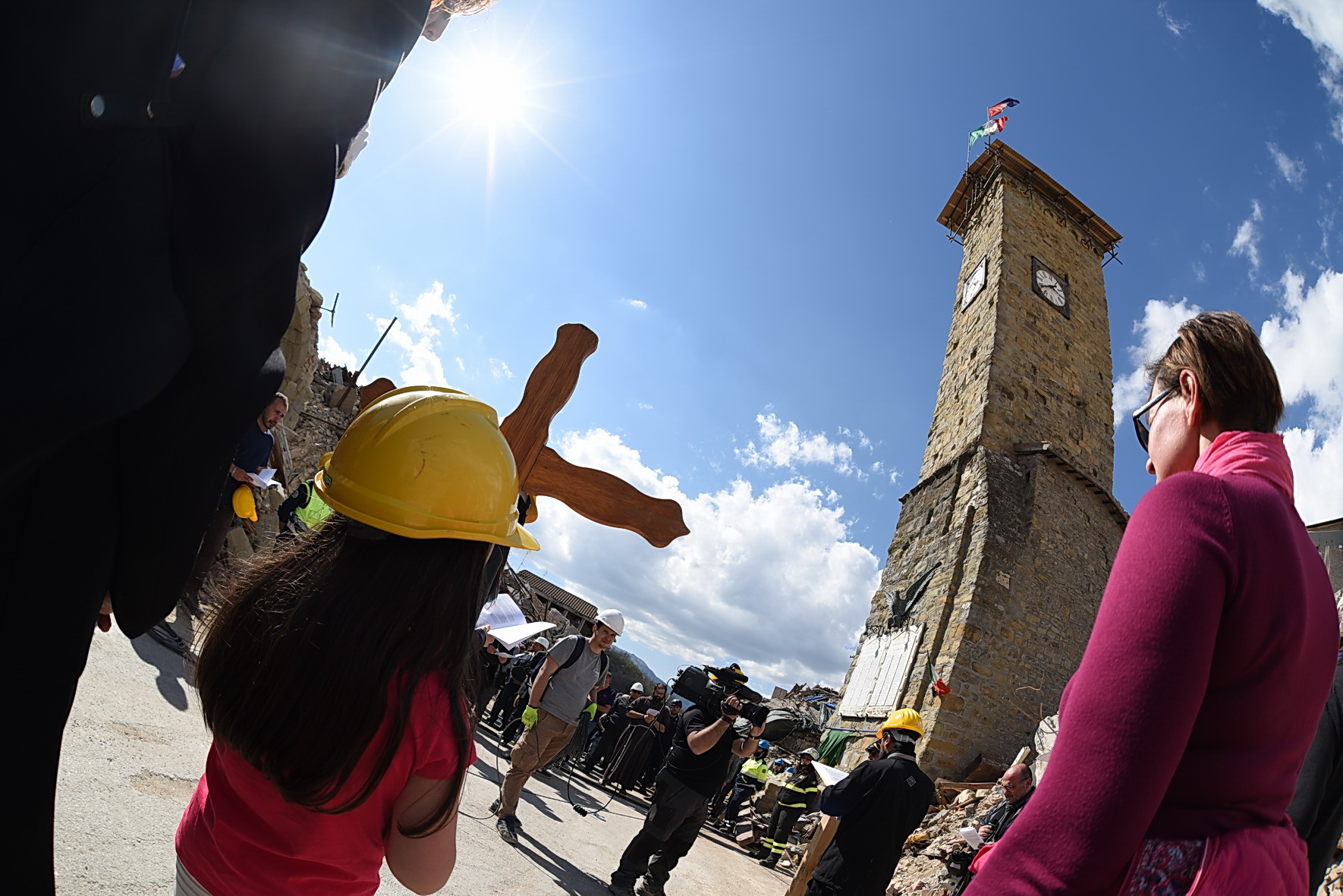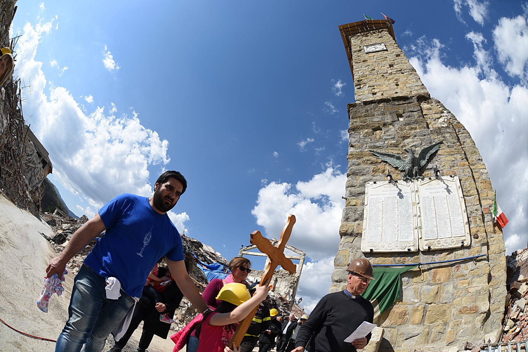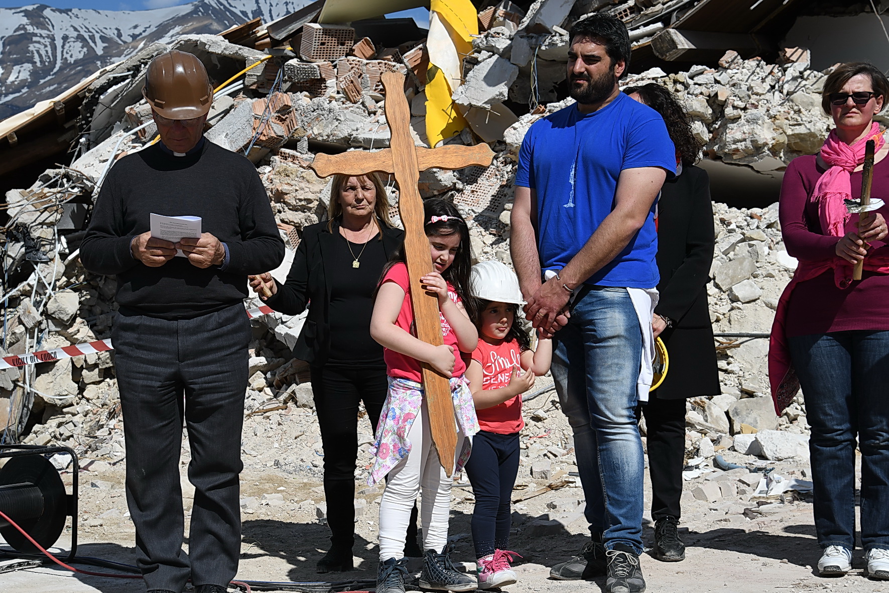 “Nessun male viene da Dio! Dio non vuole il male dei suoi figli, ma lo condivide, solidale con tutte le vittime di ogni ingiustizia”. È cominciata con queste parole la Via Crucis nella zona Rossa di Amatrice: 14 stazioni, comprese tra l’ospedale “Francesco Grifoni”, gravemente lesionato dal sisma del 24 agosto e in via di demolizione, e la Chiesa simbolo di sant’Agostino, di cui resta in piedi solo la parete destra puntellata da un castello di tubi innocenti. Poco più di mille metri per ripercorrere, nel giorno di Venerdì Santo, la passione di questa terra e della sua gente ferita, iniziata il 24 agosto e di cui oggi è impossibile vederne la fine. A portare la Croce, per tutto il tragitto, una famiglia terremotata, tra letture, meditazioni, preghiere e canti. Subito dietro un centinaio di amatriciani, composti, dignitosi nella loro sofferenza, e in mezzo a loro il vescovo di Rieti, mons. Domenico Pompili, mons. Paul Tighe, segretario aggiunto del Pontificio Consiglio della cultura, e il Commissario straordinario per la ricostruzione Vasco Errani. A fare da sfondo il silenzio delle macerie che hanno sepolto persone e luoghi, un tempo familiari, davanti ai quali la comunità dei fedeli si è fermata per meditare le stazioni. Davanti al benzinaio, al supermercato, alla casa delle suore, all’Hotel Roma, alla Torre civica, al ‘Palazzo rosso’ e così via fino a sant’Agostino.