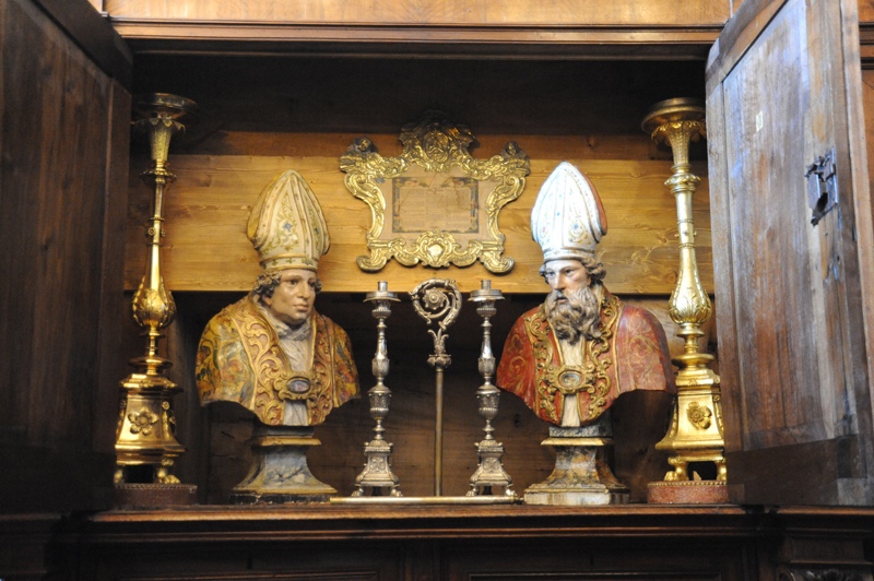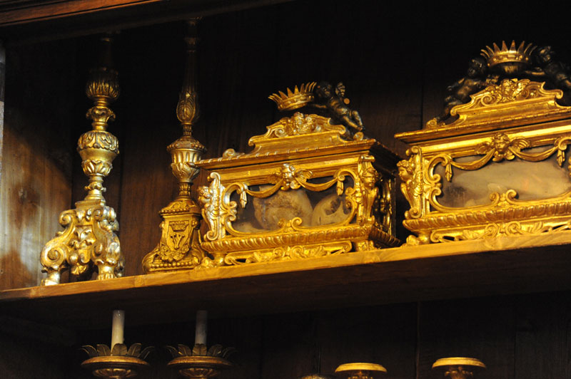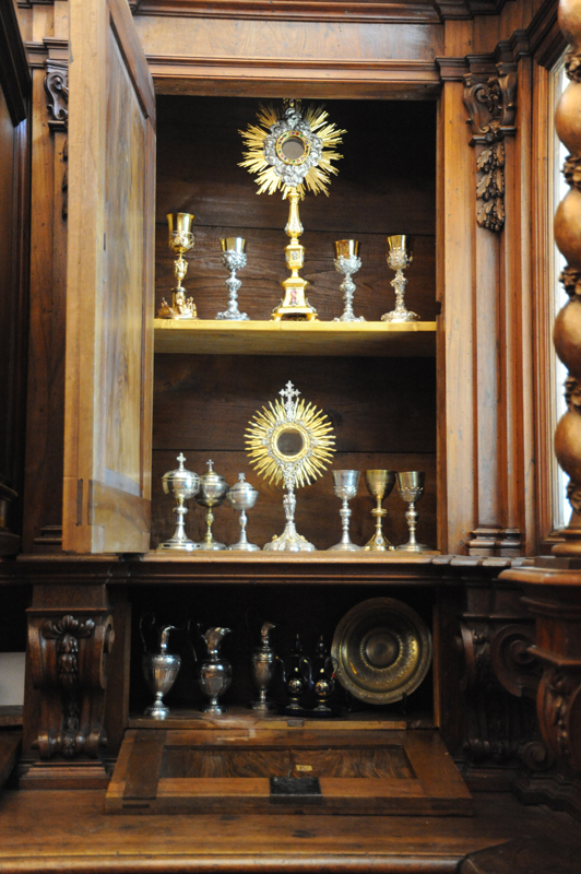 Gli arredi e le suppellettili di uso liturgico sono accuratamente disposti all’interno degli imponenti armadi di noce locale eseguiti nel 1722 dai maestri ebanisti Tiburzio Caprioli e Carlo Fenici.