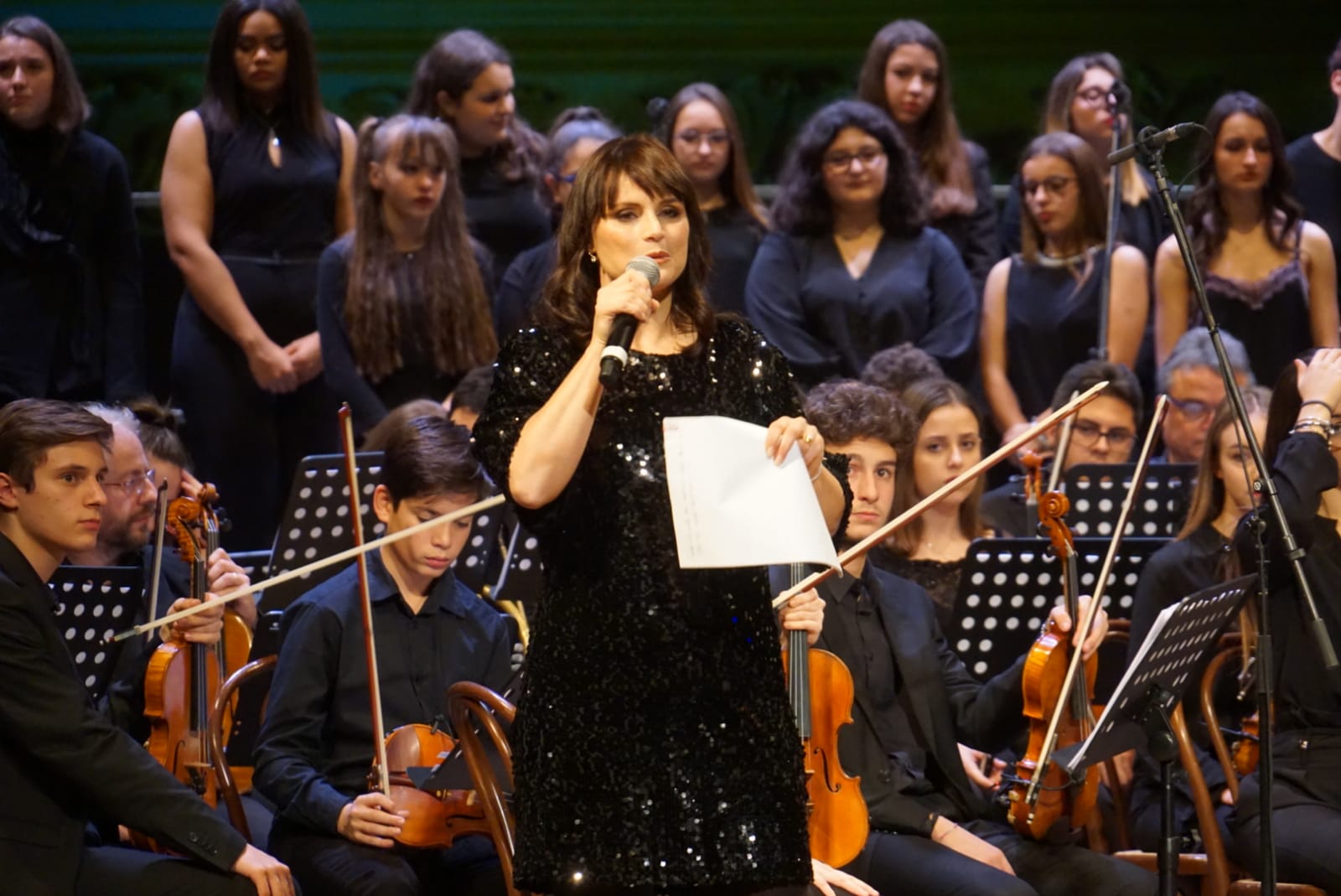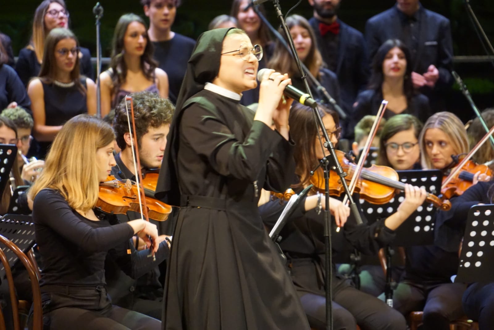 Presentati da Lorena Bianchetti, se li meritano tutti, gli entusiasti applausi del pubblico, i protagonisti del bellissimo spettacolo musicale: gli alunni del Liceo Musicale (assieme a ex allievi e a studenti di licei di Terni e di Roma e del Conservatorio di Perugia). La direzione del maestro Leonardo De Amicis regala un’oretta intensa di emozioni, arricchita dalle voci dei cantanti Michele Zarrillo, suor Cristina, Barbara Cola, Beatrice e poi il tenorino Valerio Monaco.