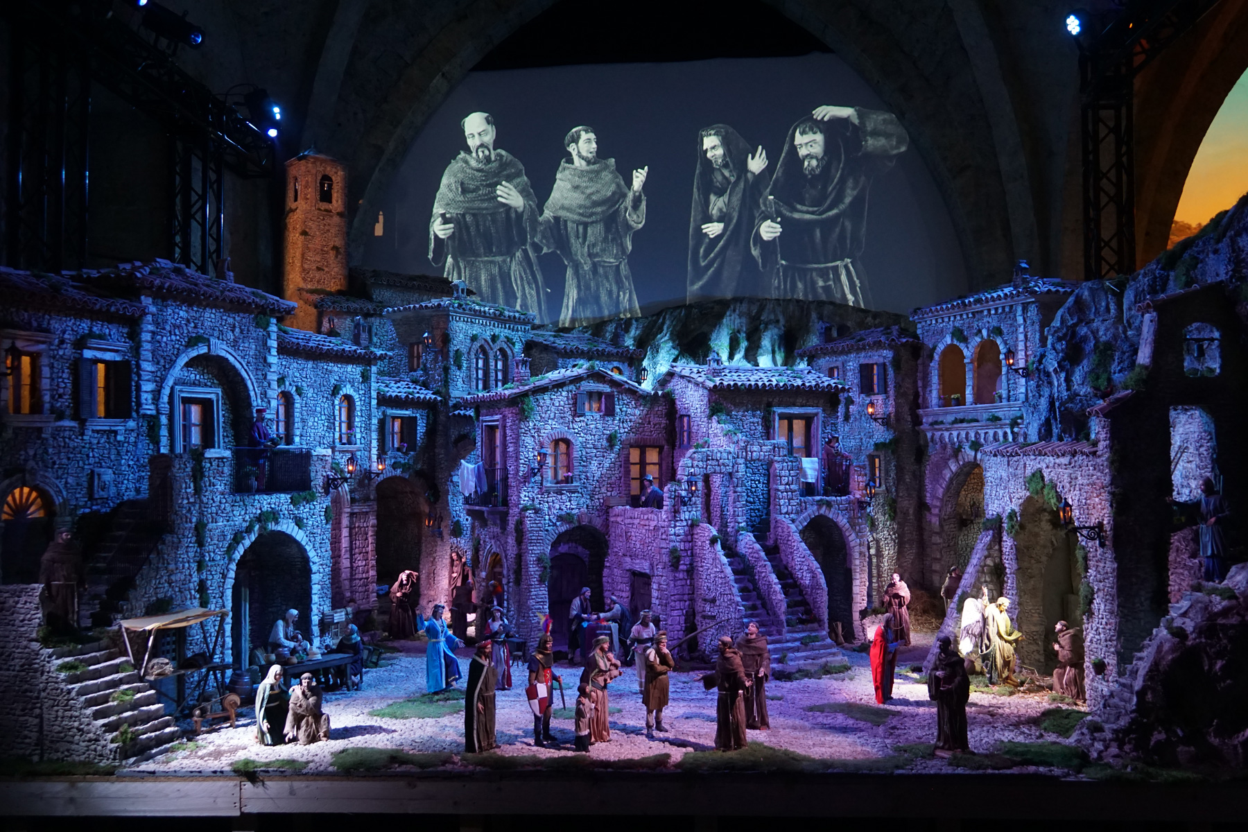 A grande richiesta, quell’istallazione è poi divenuta permanente, e accanto ad essa ecco splendere Dal perdono alla non violenza: così si intitola la nuova monumentale realizzazione del presepista lucano, che stavolta non raffigura la Natività ma il messaggio di perdono e di pace di un altro santuario della valle reatina, quello di Poggio Bustone.