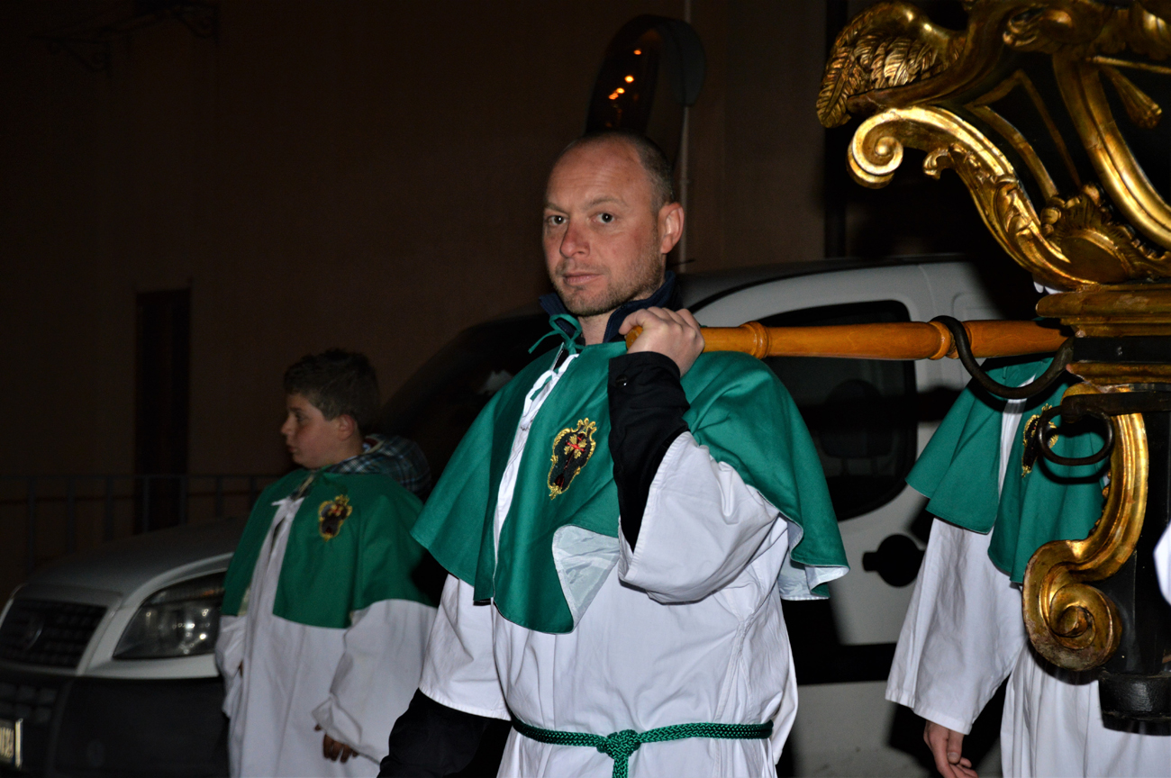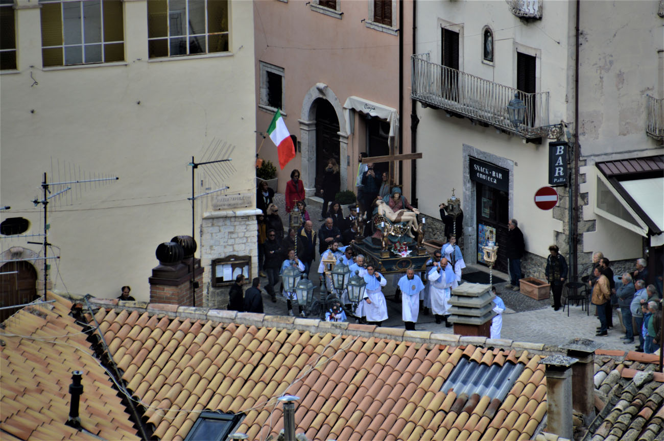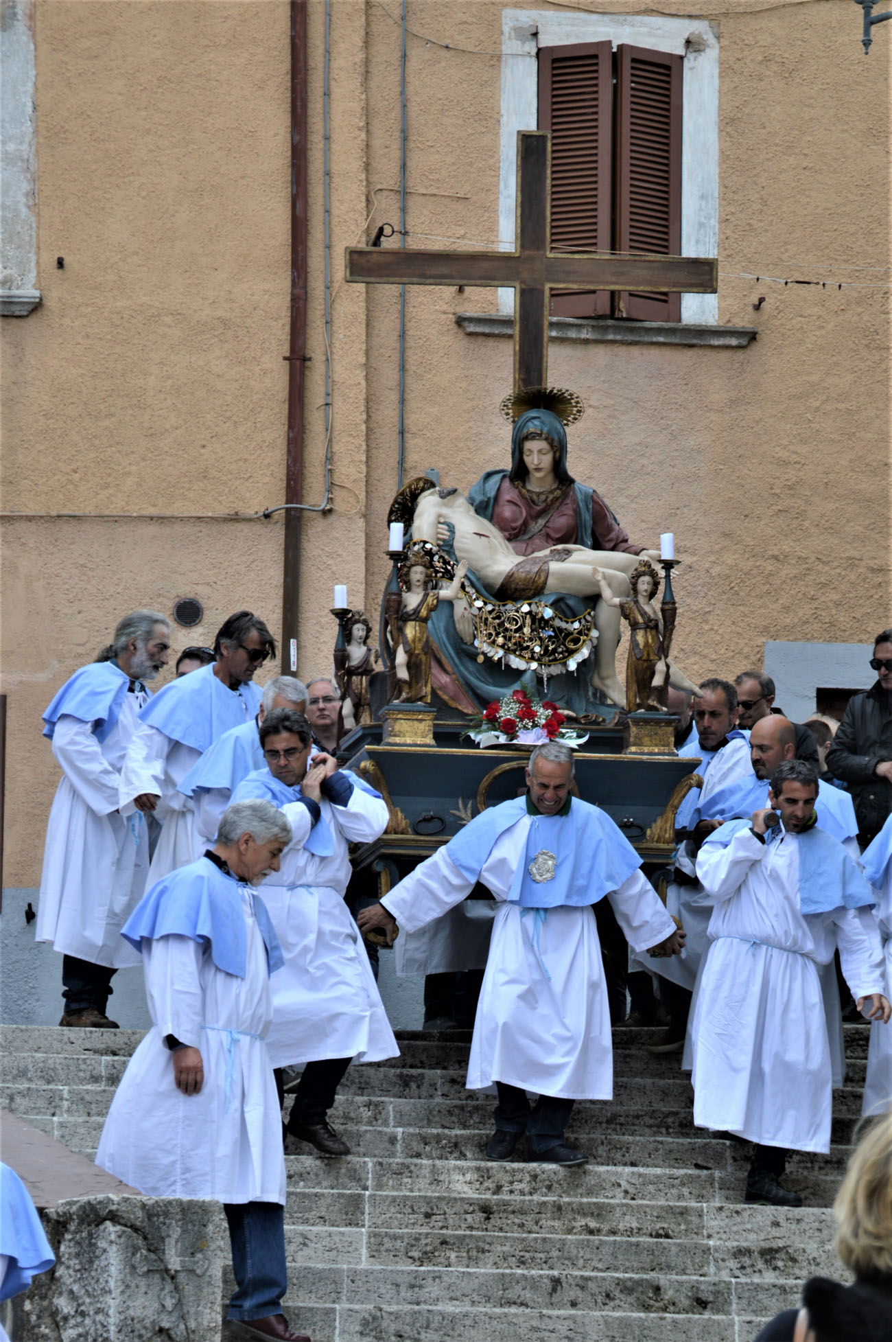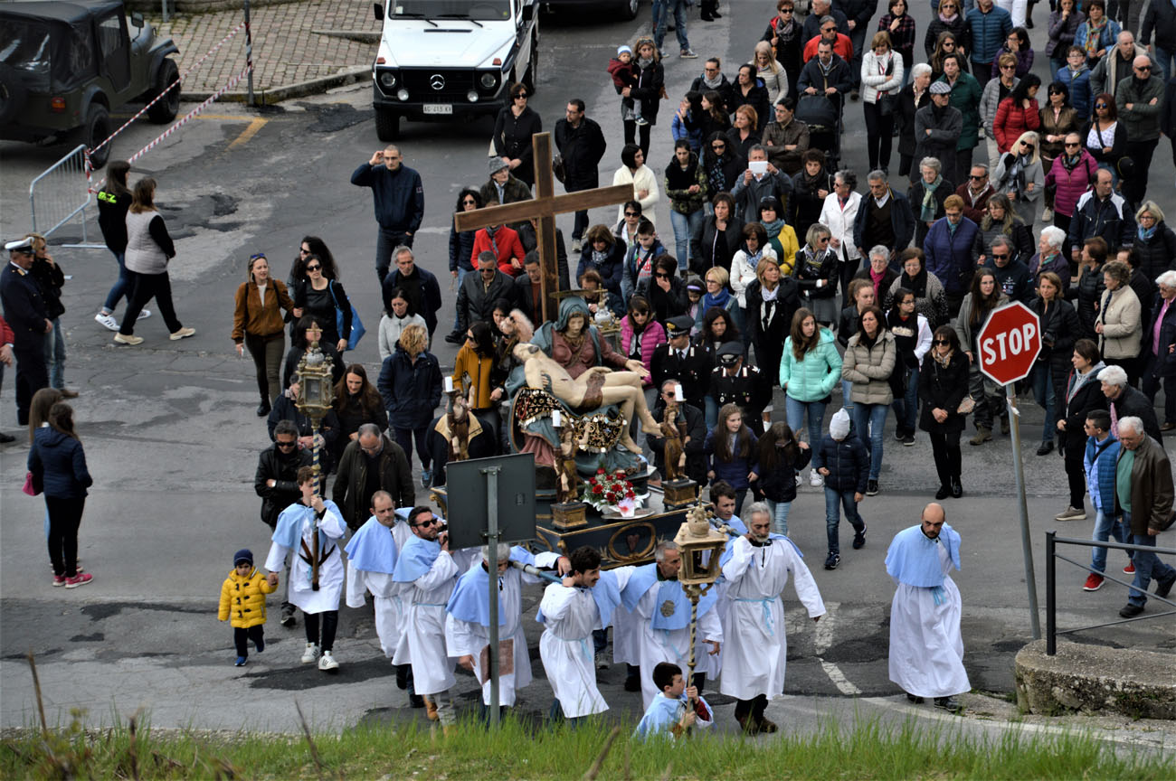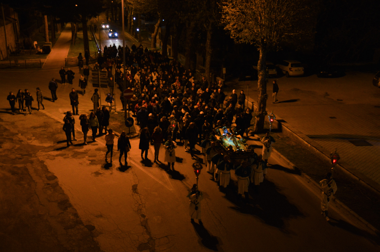 Tornando alle processioni, quella del “Cristo morto” guidata dalla confraternita “Santa Croce”, si è svolta nella notte del Venerdì Santo attraversando le strade cittadine e ritornando alla chiesa di San Francesco, luogo da cui era partita. Emozionante come sempre l’incontro che avviene al termine di questa processione tra la statua del Cristo morto e la sua santissima madre Maria; incontro che in genere avviene nella chiesa di San Pietro e che quest’anno, a causa della non agibilità della stessa, si è celebrato in piazza 7 Aprile, dinanzi alla sede comunale.