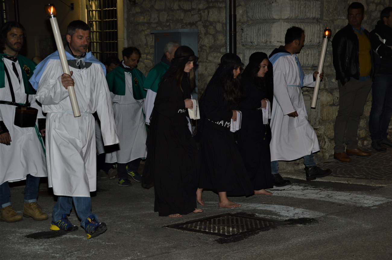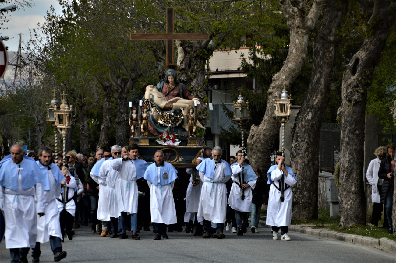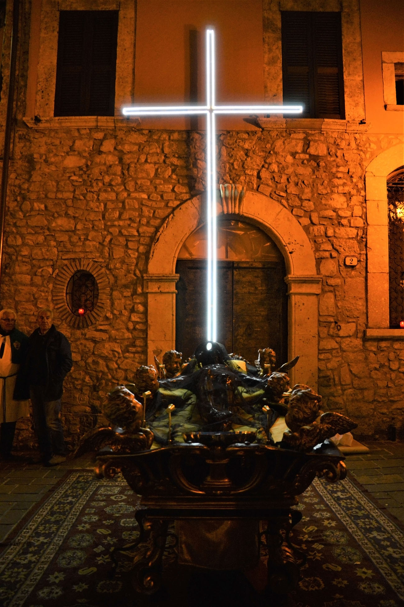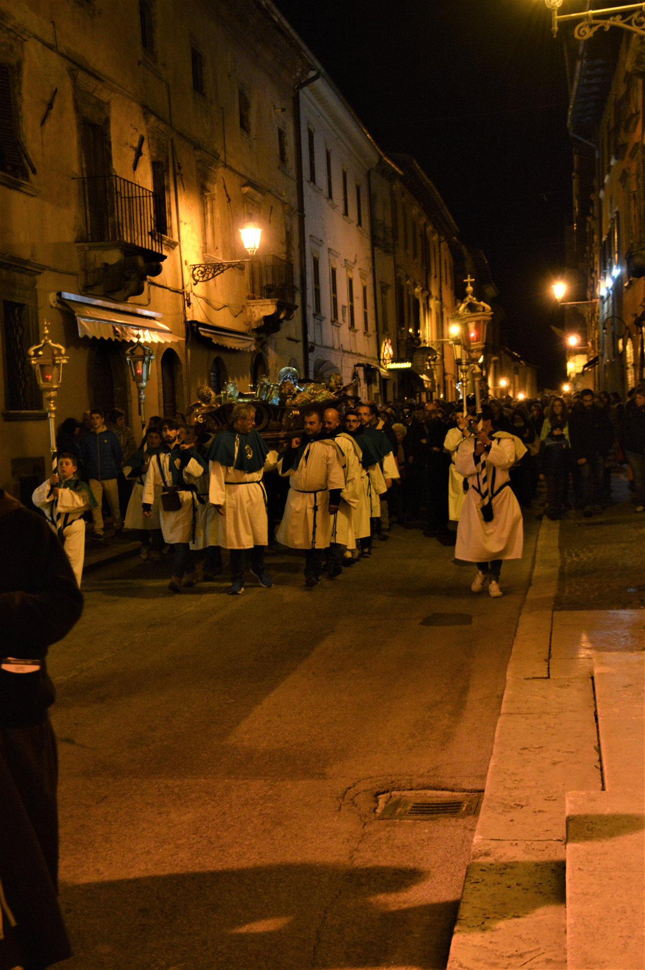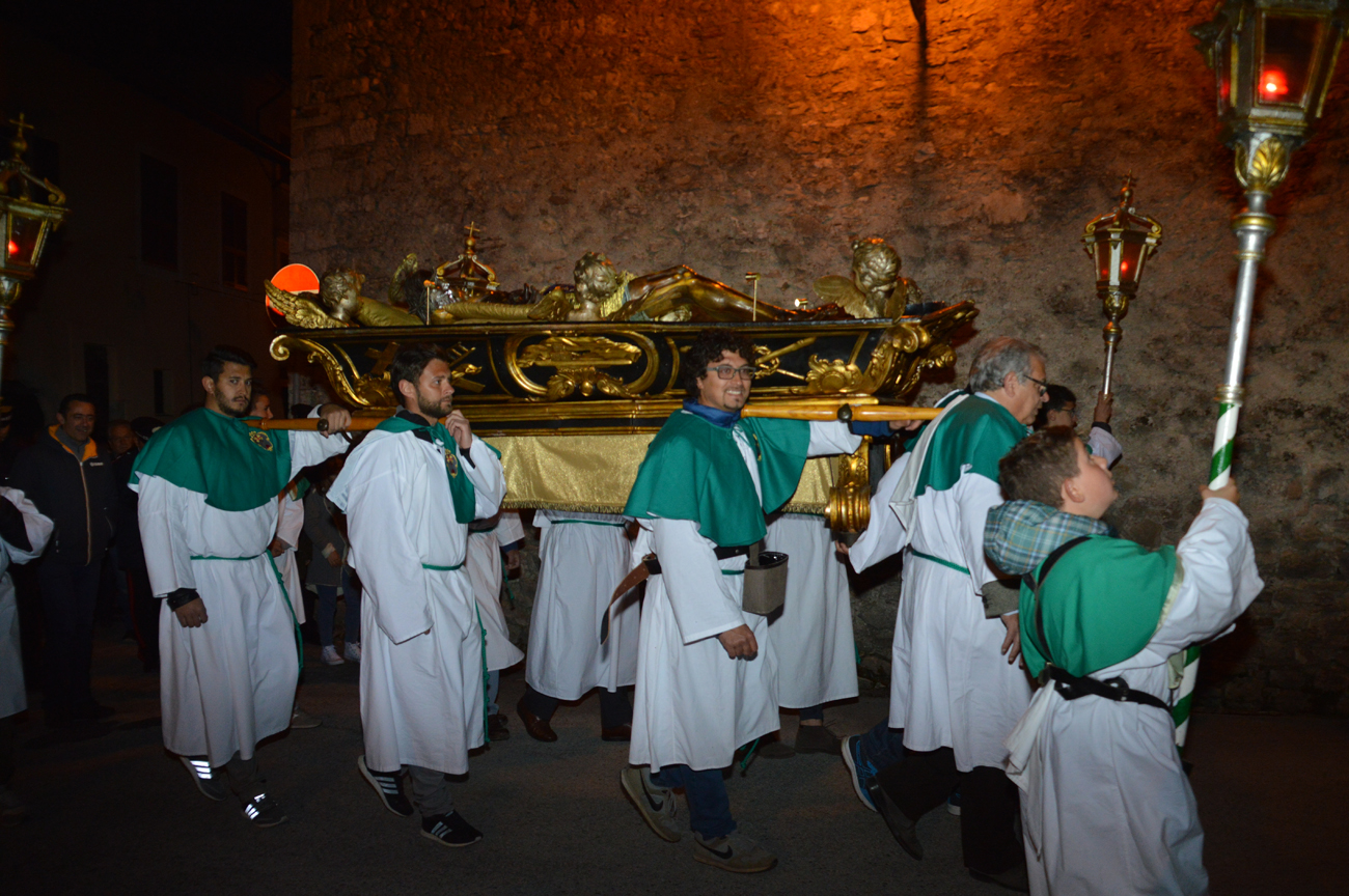 Tornando alle processioni, quella del “Cristo morto” guidata dalla confraternita “Santa Croce”, si è svolta nella notte del Venerdì Santo attraversando le strade cittadine e ritornando alla chiesa di San Francesco, luogo da cui era partita. Emozionante come sempre l’incontro che avviene al termine di questa processione tra la statua del Cristo morto e la sua santissima madre Maria; incontro che in genere avviene nella chiesa di San Pietro e che quest’anno, a causa della non agibilità della stessa, si è celebrato in piazza 7 Aprile, dinanzi alla sede comunale.