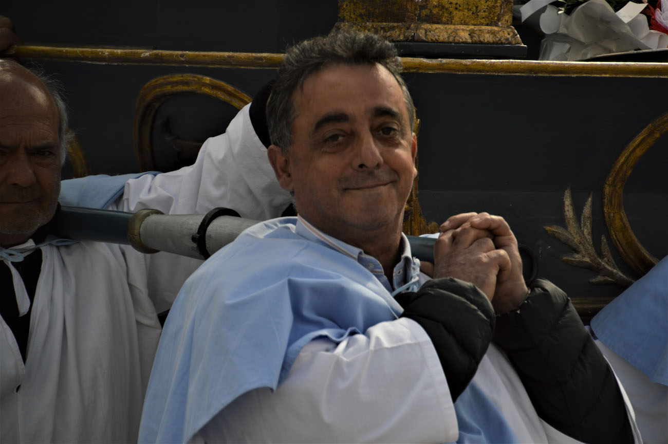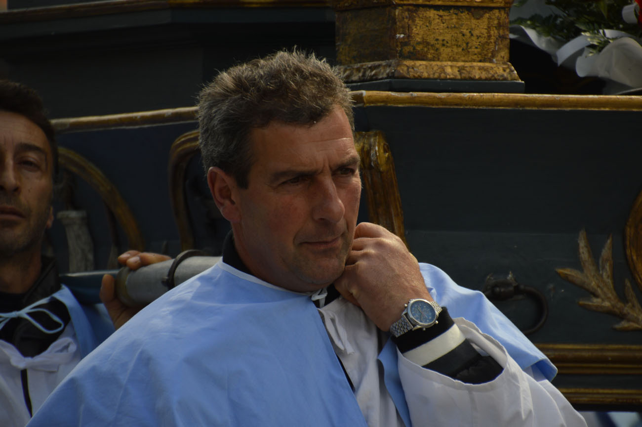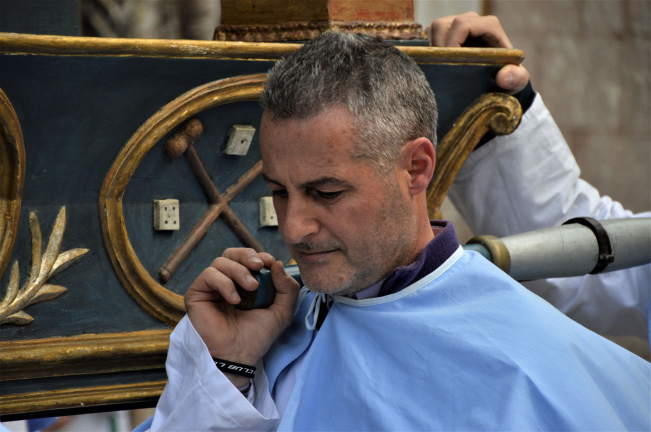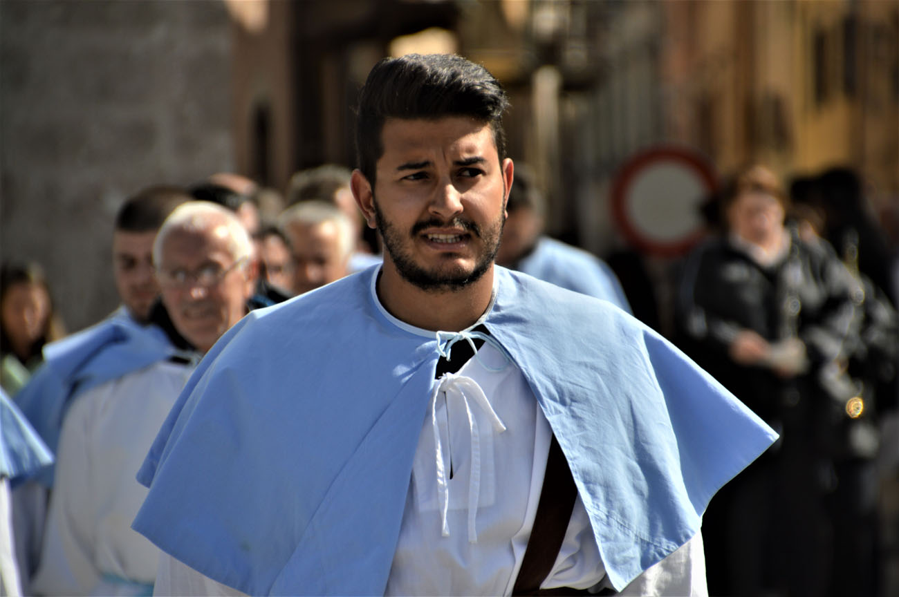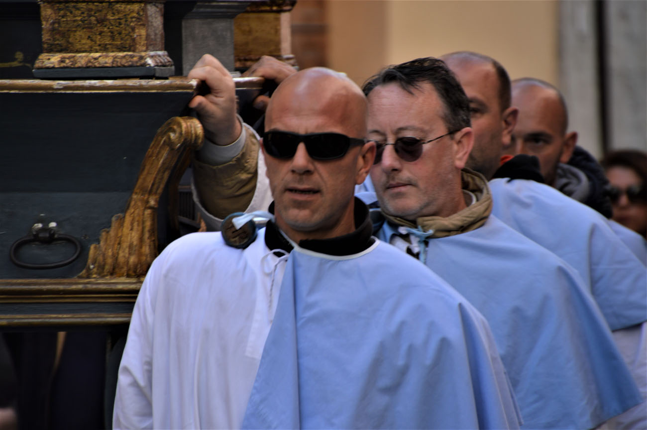 Tornando alle processioni, quella del “Cristo morto” guidata dalla confraternita “Santa Croce”, si è svolta nella notte del Venerdì Santo attraversando le strade cittadine e ritornando alla chiesa di San Francesco, luogo da cui era partita. Emozionante come sempre l’incontro che avviene al termine di questa processione tra la statua del Cristo morto e la sua santissima madre Maria; incontro che in genere avviene nella chiesa di San Pietro e che quest’anno, a causa della non agibilità della stessa, si è celebrato in piazza 7 Aprile, dinanzi alla sede comunale.