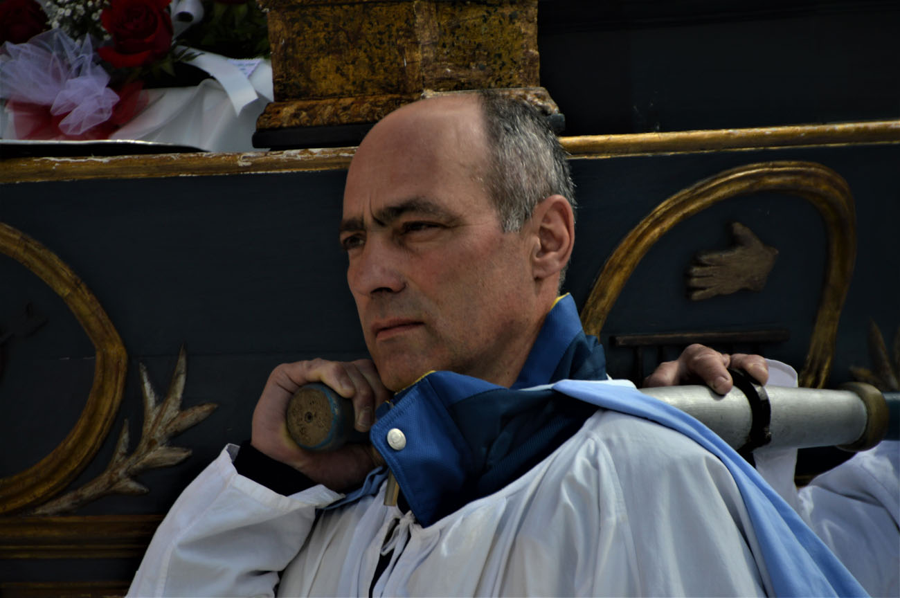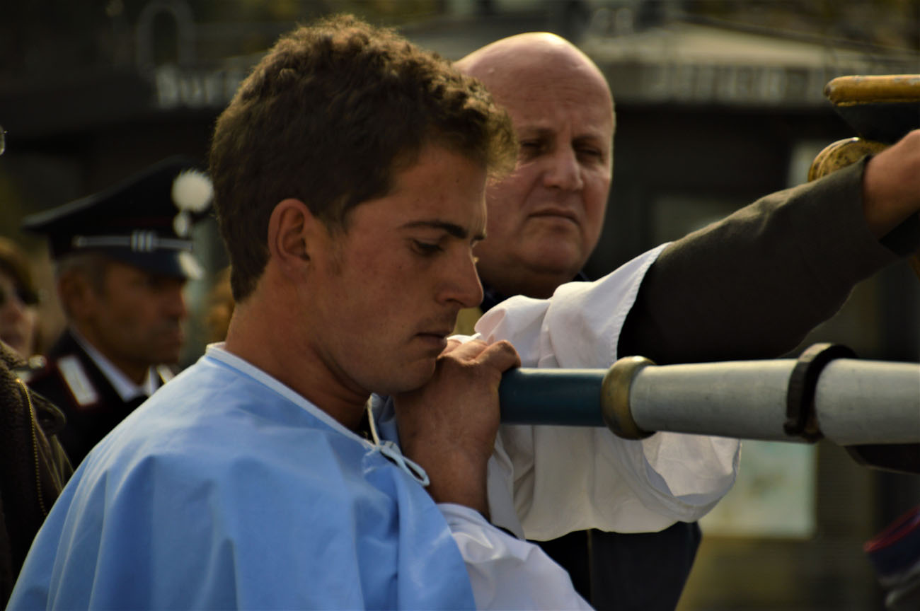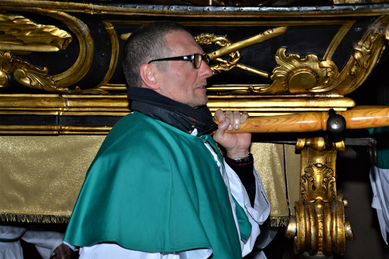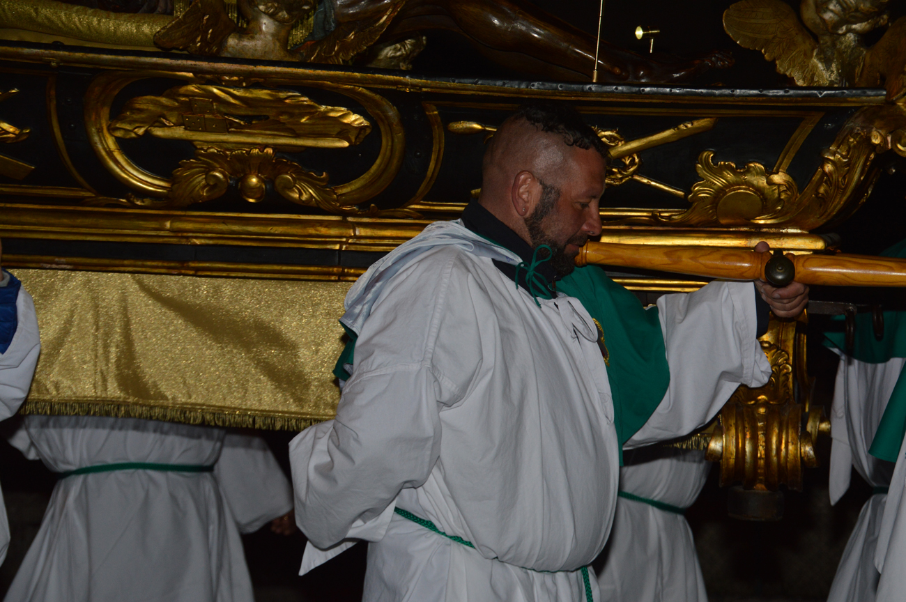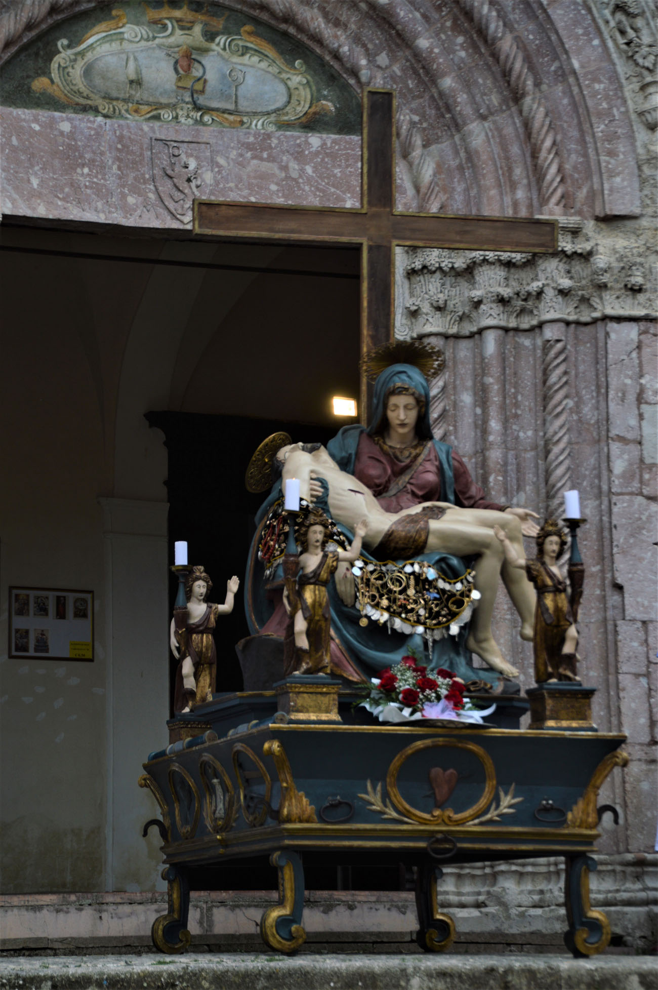 Tornando alle processioni, quella del “Cristo morto” guidata dalla confraternita “Santa Croce”, si è svolta nella notte del Venerdì Santo attraversando le strade cittadine e ritornando alla chiesa di San Francesco, luogo da cui era partita. Emozionante come sempre l’incontro che avviene al termine di questa processione tra la statua del Cristo morto e la sua santissima madre Maria; incontro che in genere avviene nella chiesa di San Pietro e che quest’anno, a causa della non agibilità della stessa, si è celebrato in piazza 7 Aprile, dinanzi alla sede comunale.