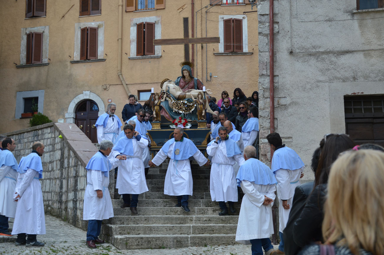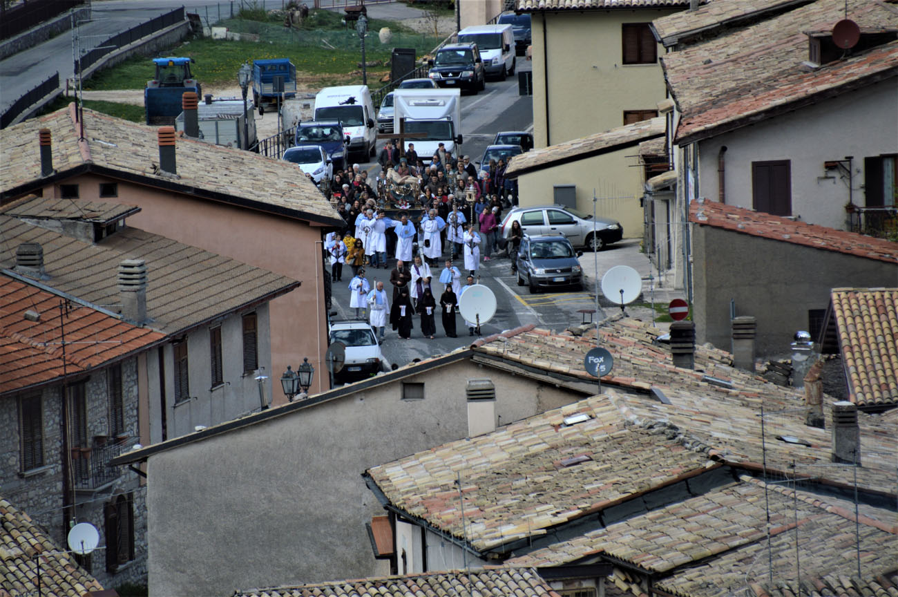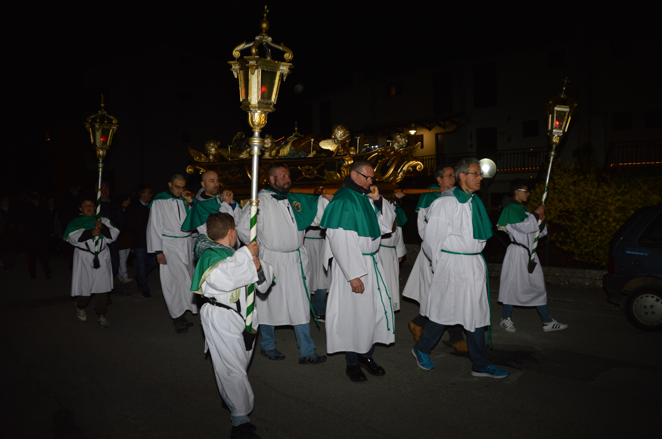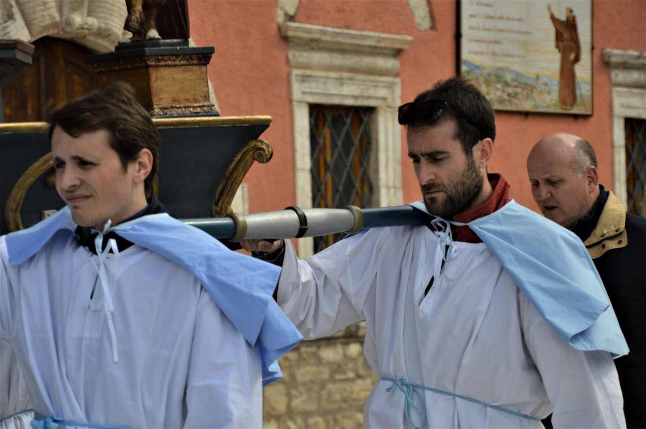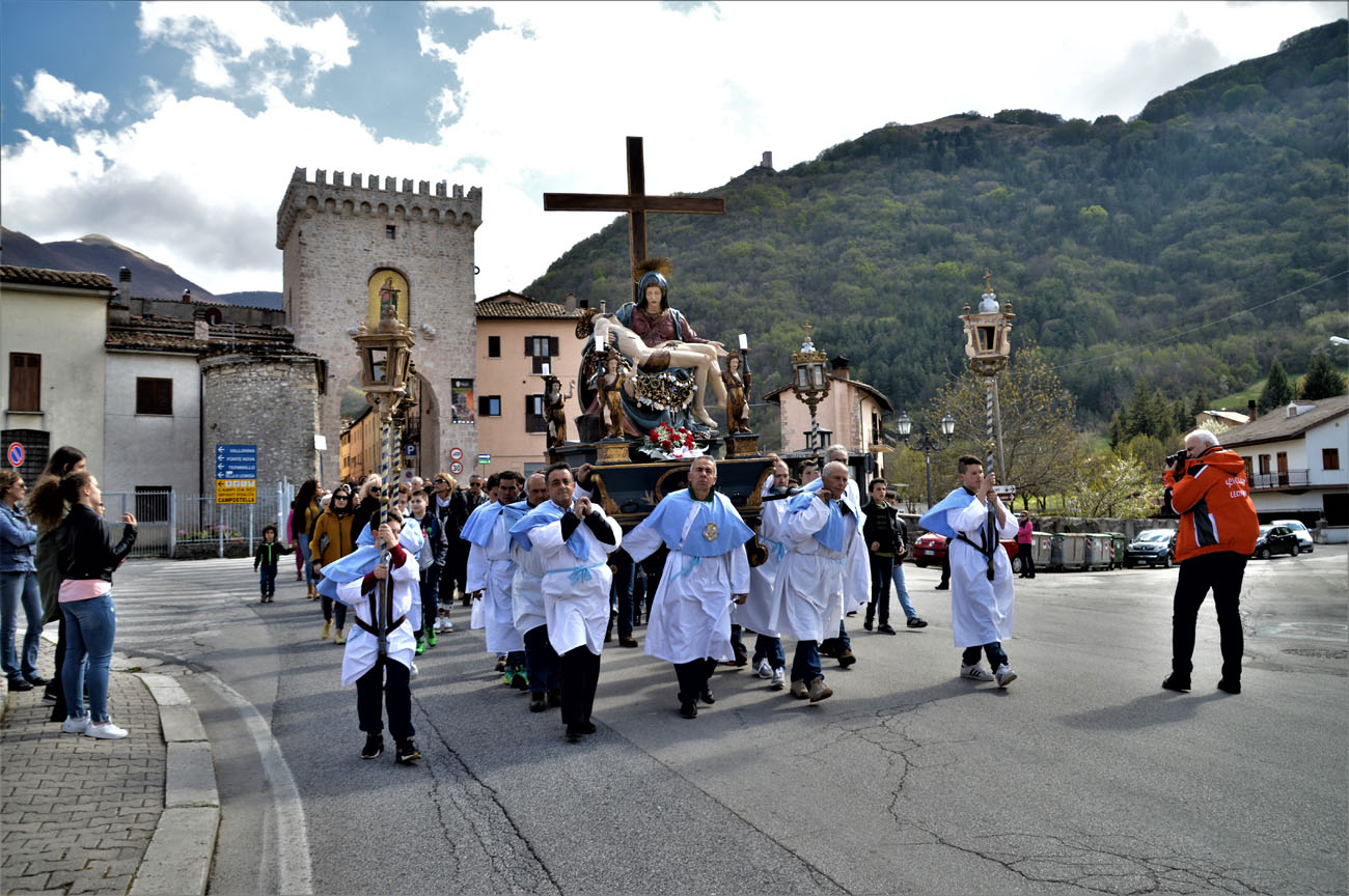 A notte inoltrata la veglia pasquale ha dato inizio all’annuncio gioioso della Risurrezione. Per questo motivo si celebra, la mattina di Pasqua alle ore 7, la processione con lo stendardo del Cristo risorto. Si svolge, questa processione, in un clima di gioia: infatti il parroco che presiede, asperge con l’acqua benedetta della notte tutte le chiese e i partecipanti, ed è aperta, la processione, dal suono di tre campanelle portate a spalle dai confratelli. Al termine, la santa messa delle ore 8, celebrata quest’anno nella chiesa di San Carlo, ha dato il senso di una celebrazione partecipata oltre ogni aspettativa, così come tutte le funzioni religiose, visto il clima che si era creato a causa delle scosse di terremoto.