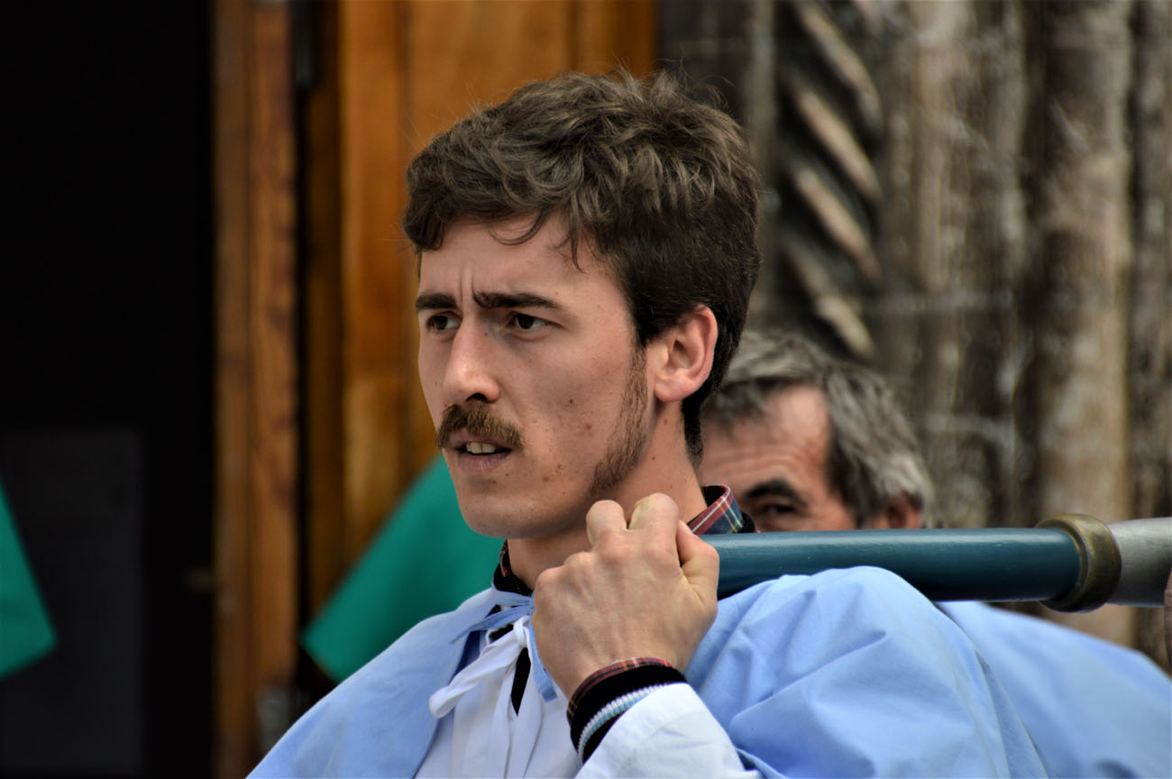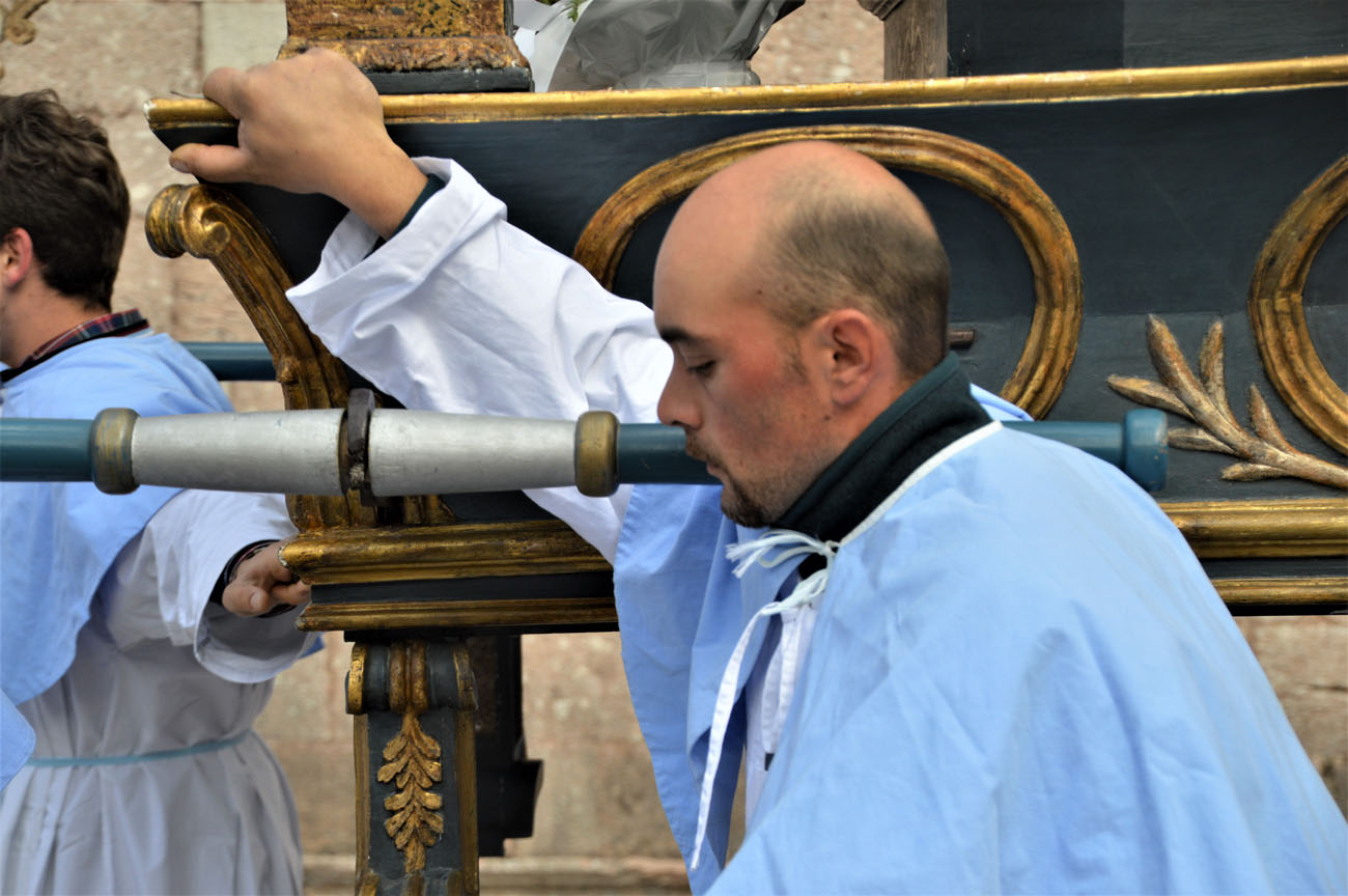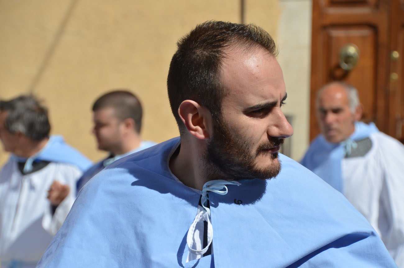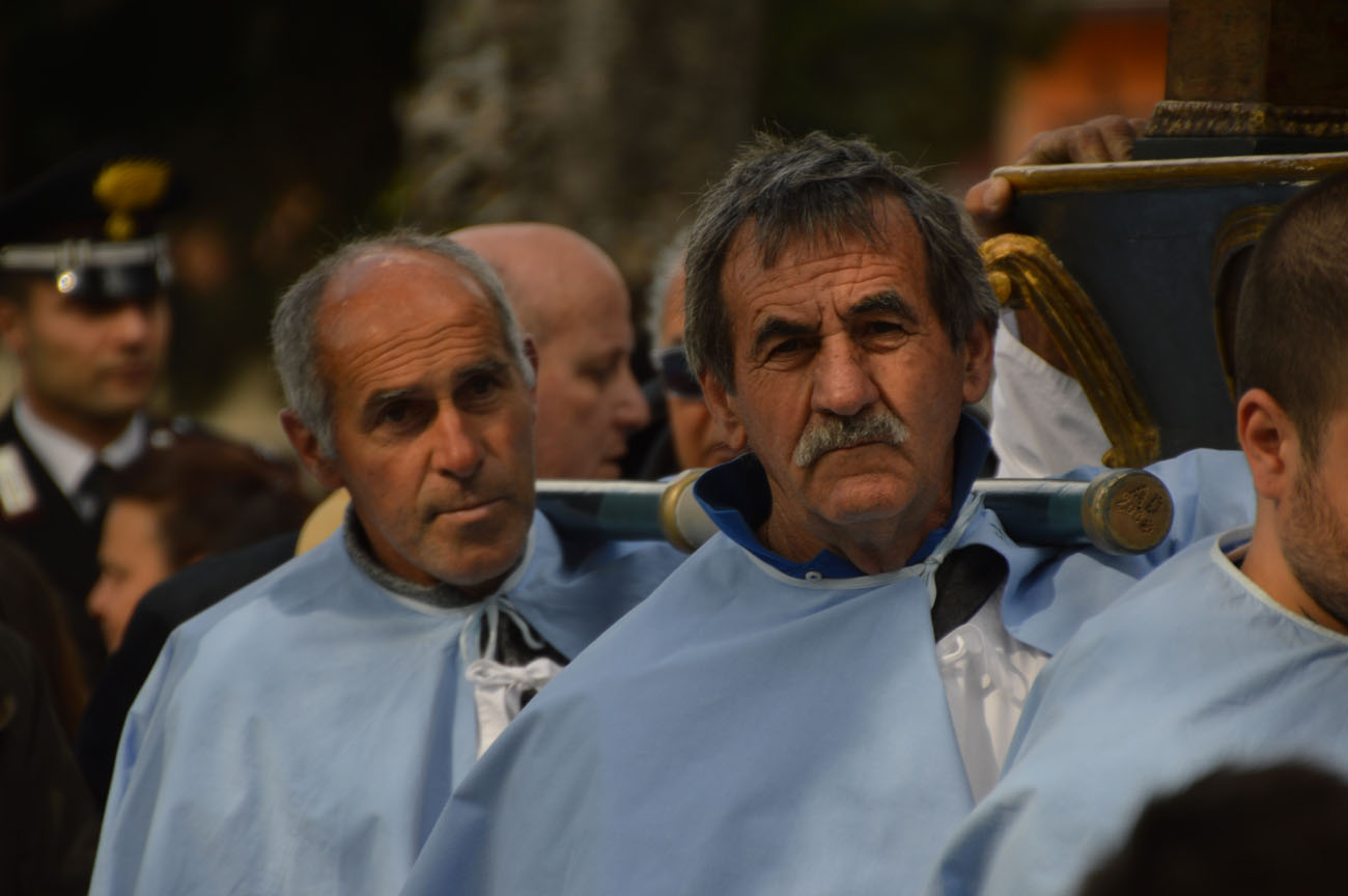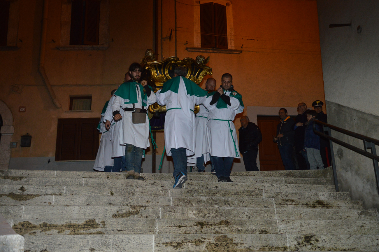 A notte inoltrata la veglia pasquale ha dato inizio all’annuncio gioioso della Risurrezione. Per questo motivo si celebra, la mattina di Pasqua alle ore 7, la processione con lo stendardo del Cristo risorto. Si svolge, questa processione, in un clima di gioia: infatti il parroco che presiede, asperge con l’acqua benedetta della notte tutte le chiese e i partecipanti, ed è aperta, la processione, dal suono di tre campanelle portate a spalle dai confratelli. Al termine, la santa messa delle ore 8, celebrata quest’anno nella chiesa di San Carlo, ha dato il senso di una celebrazione partecipata oltre ogni aspettativa, così come tutte le funzioni religiose, visto il clima che si era creato a causa delle scosse di terremoto.