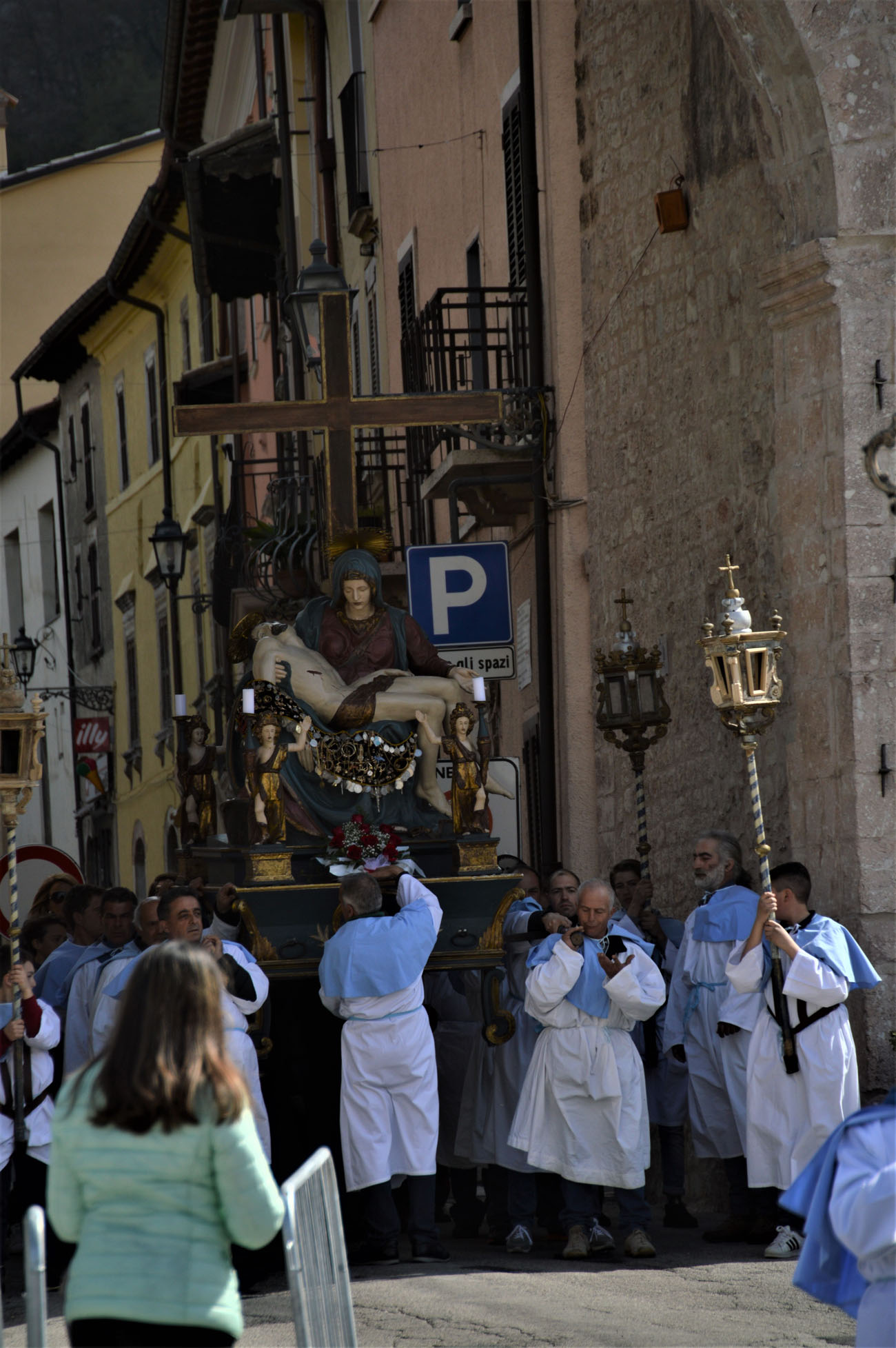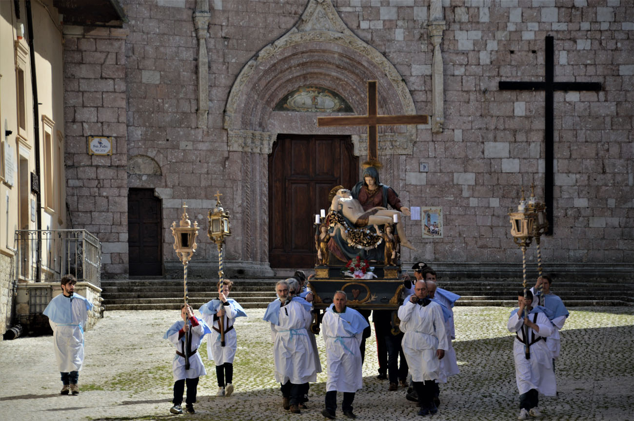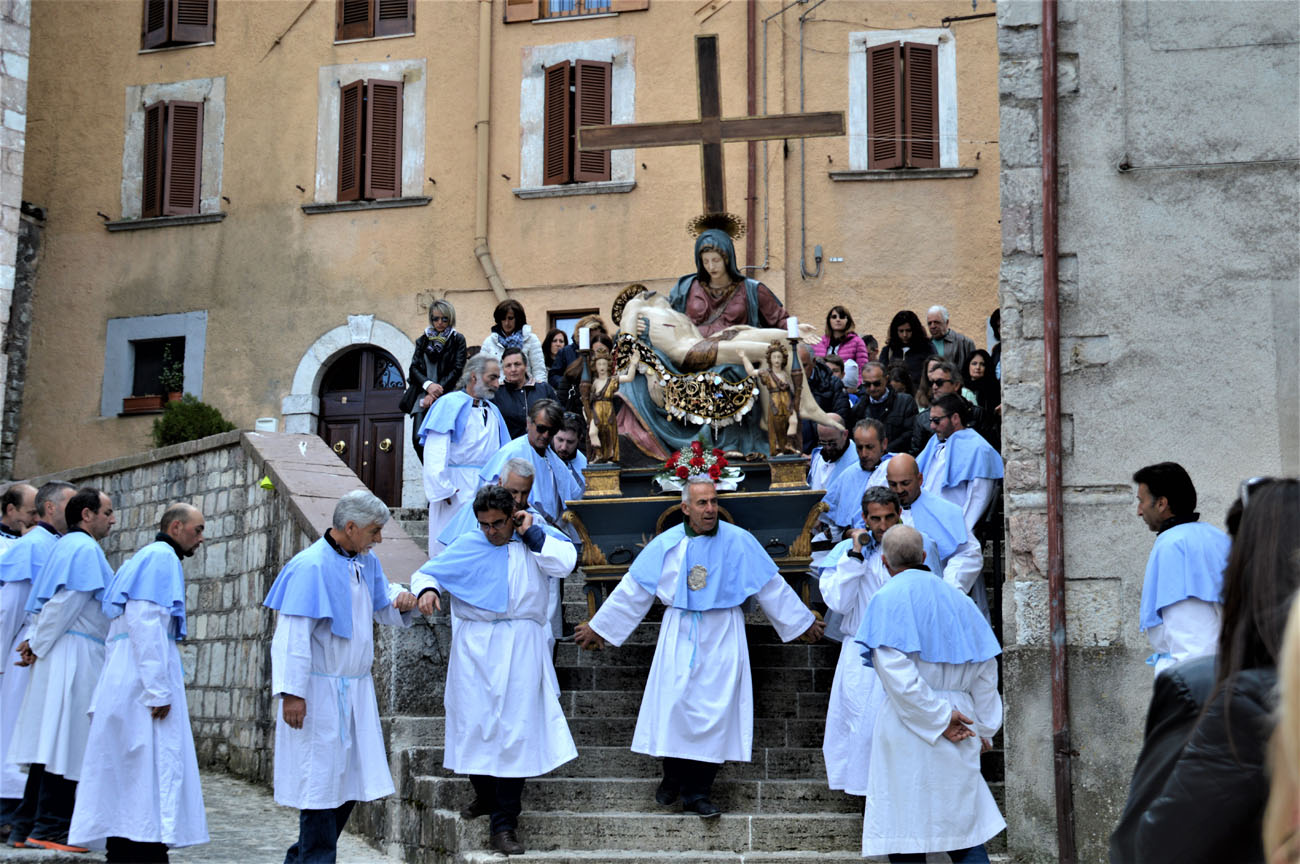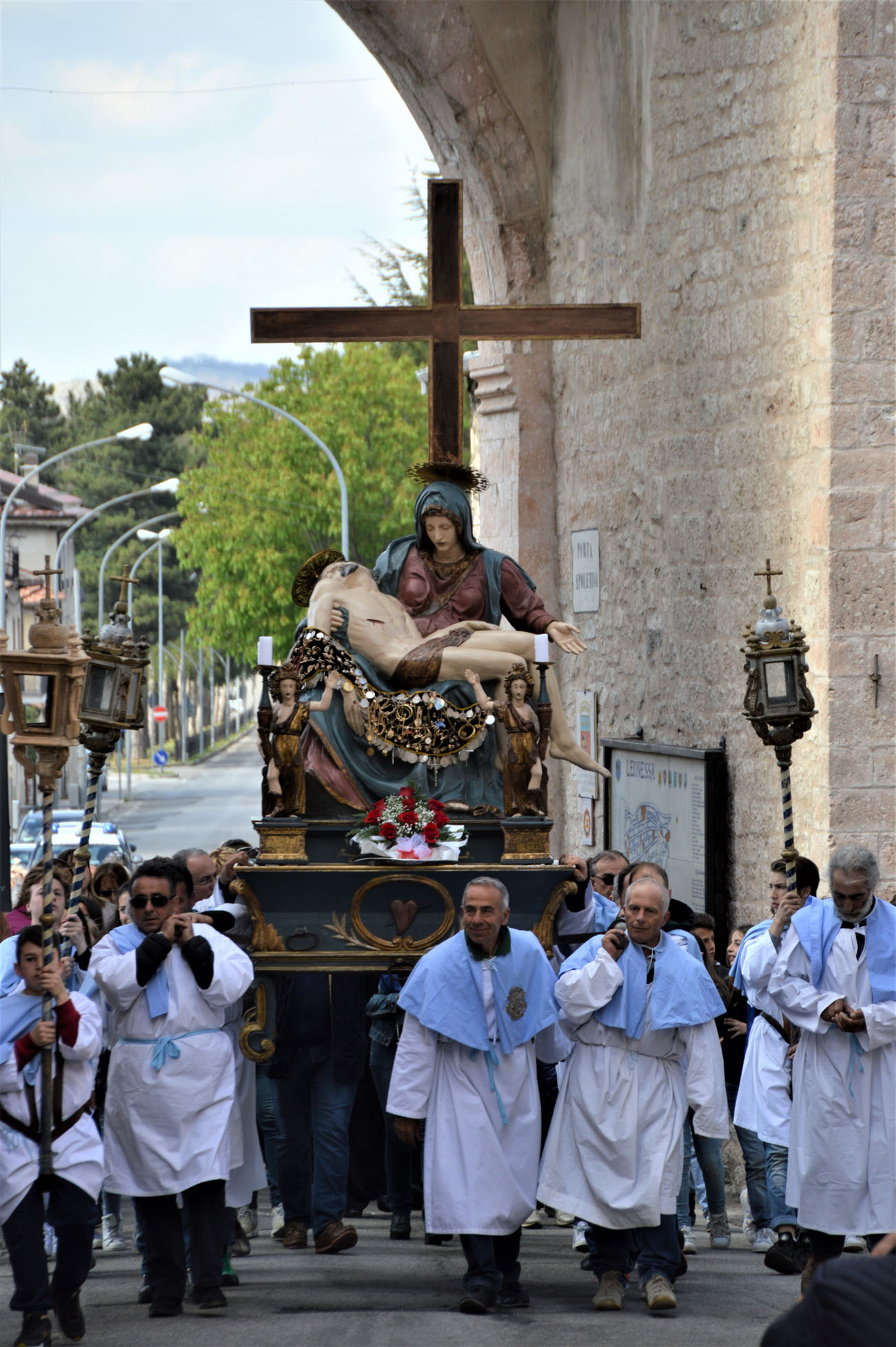 Momenti di intensa spiritualità e partecipazione sono stati vissuti dai presenti alle tre processioni che sono incluse nel triduo pasquale celebrato a Leonessa: il Cristo morto del Venerdì Santo, la Madonna della Pietà del Sabato Santo e il Cristo risorto della mattina di Pasqua. Queste tre processioni attraversano i giorni più importanti dell’anno liturgico aperti con la santa messa in Coena Domini, quest’anno celebrata nella struttura donata alla comunità leonessana dalla Caritas nazionale e dalla diocesi di Rieti.