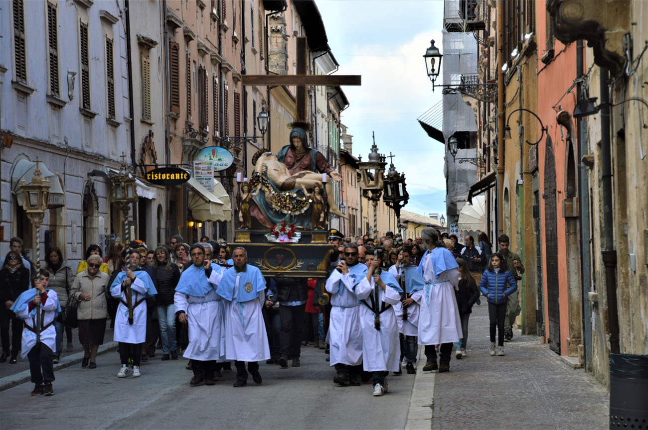 Alle 15 del Sabato Santo ha avuto inizio la processione della Madonna della Pietà (statua del peso di circa 4 quintali) che, portata a spalle dai confratelli della “Madonna Pietà e Grazie”, ha attraversato anch’essa tutte le vie cittadine.