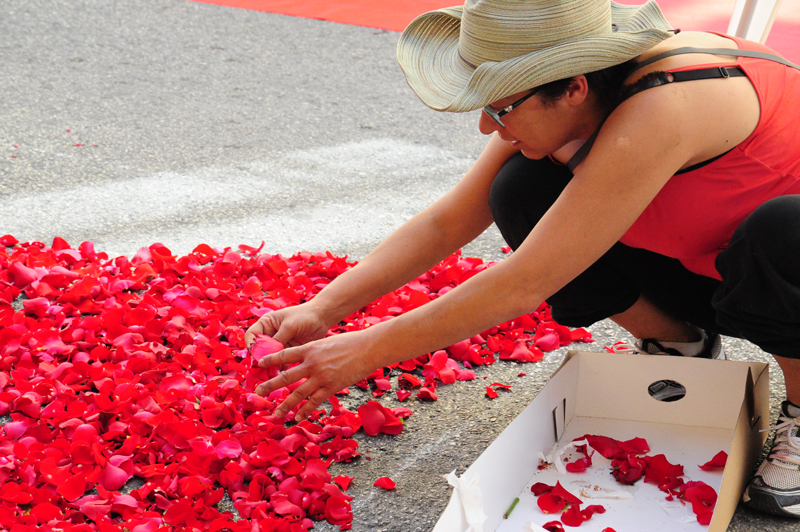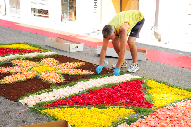 Gli infioratori di Porta Romana prediligono l’utilizzo di fiori freschi, selezionati con cura nelle ore precedenti alla messa su strada.