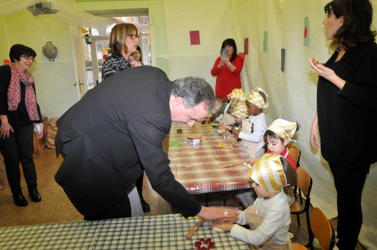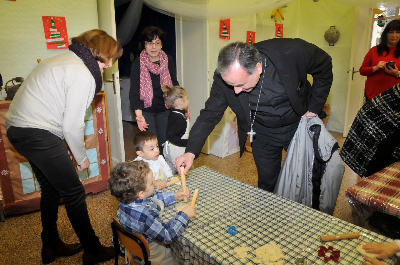 Così, intorno a credenze, madie, camini, forni, i bimbi si sono trasformati in piccoli falegnami e pastori, ricamatrici e fornai in erba intenti a lavorare e poi tutti intorno alla Sacra Famiglia per cantare in coro. Il vescovo, piccolo in mezzo ai piccoli, ascolta tutti, applaude, si mette “alla loro altezza” per la foto, siede nei piccoli tavolini colorati per la colazione da fare insieme.