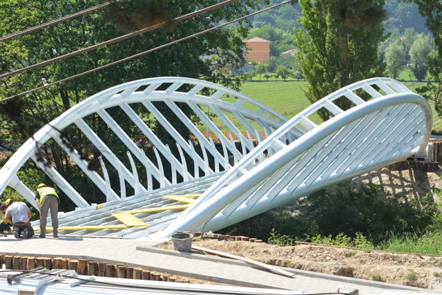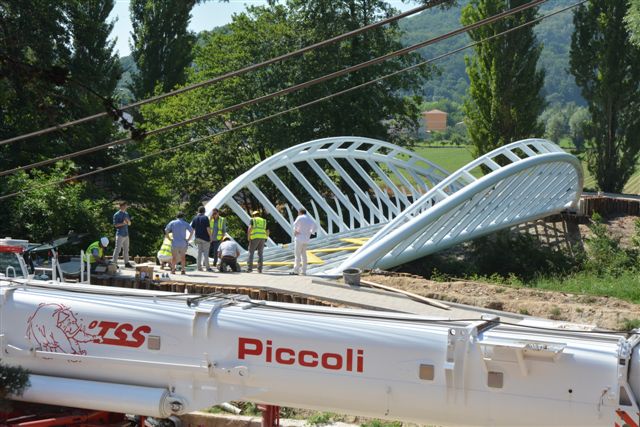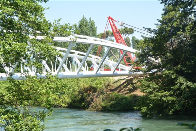 La struttura pesa quattrocento quintali e misura quaranta metri di lunghezza e tre metri e sessanta di larghezza. Per sollevarla è stata necessaria una gru appositamente arrivata da Roma lunedì mattina. Per completare l’opera, la passerella sarà rivestita con tavole di legno. Inoltre saranno applicati i parapetti laterali e una adeguata illuminazione. I lavori non hanno mancato di attirare gli sguardi di decine di curiosi.