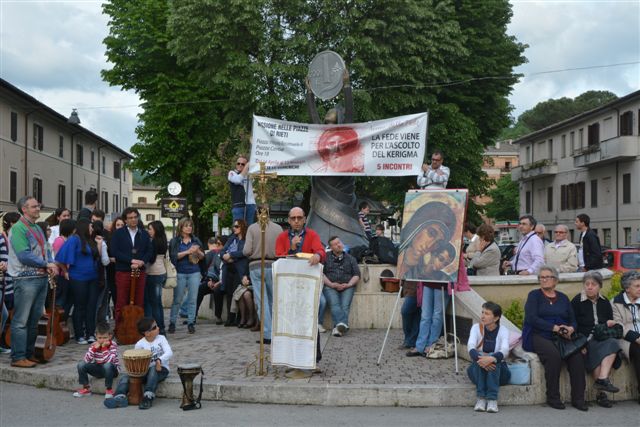 Il quarto pomeriggio della missione si è svolto nelle due piazze Vittorio Emanuele e Cavour dove, domenica prossima, si concluderà questa prima esperienza della Chiesa reatina, come quella in corso in tutto il mondo, dove diecimila sono stati i luoghi pubblici organizzati all’aperto che hanno ospitato la predicazione e che, per tre quarti d’ora, sono servite ad abbandonare il tempio, ove bisogna recarsi per incontrare Gesù, andando invece incontro agli uomini e alle donne, presi da tutt’altri interessi intesi come strumenti di liberazione dell’uomo quando si fanno assurgere a valori assoluti e non lo sono per i motivi che tutti conoscono.