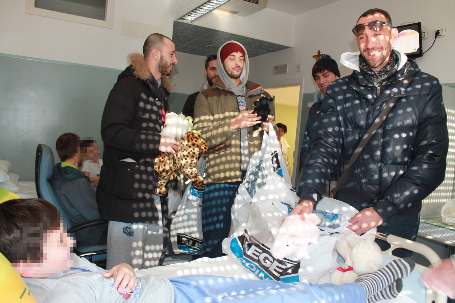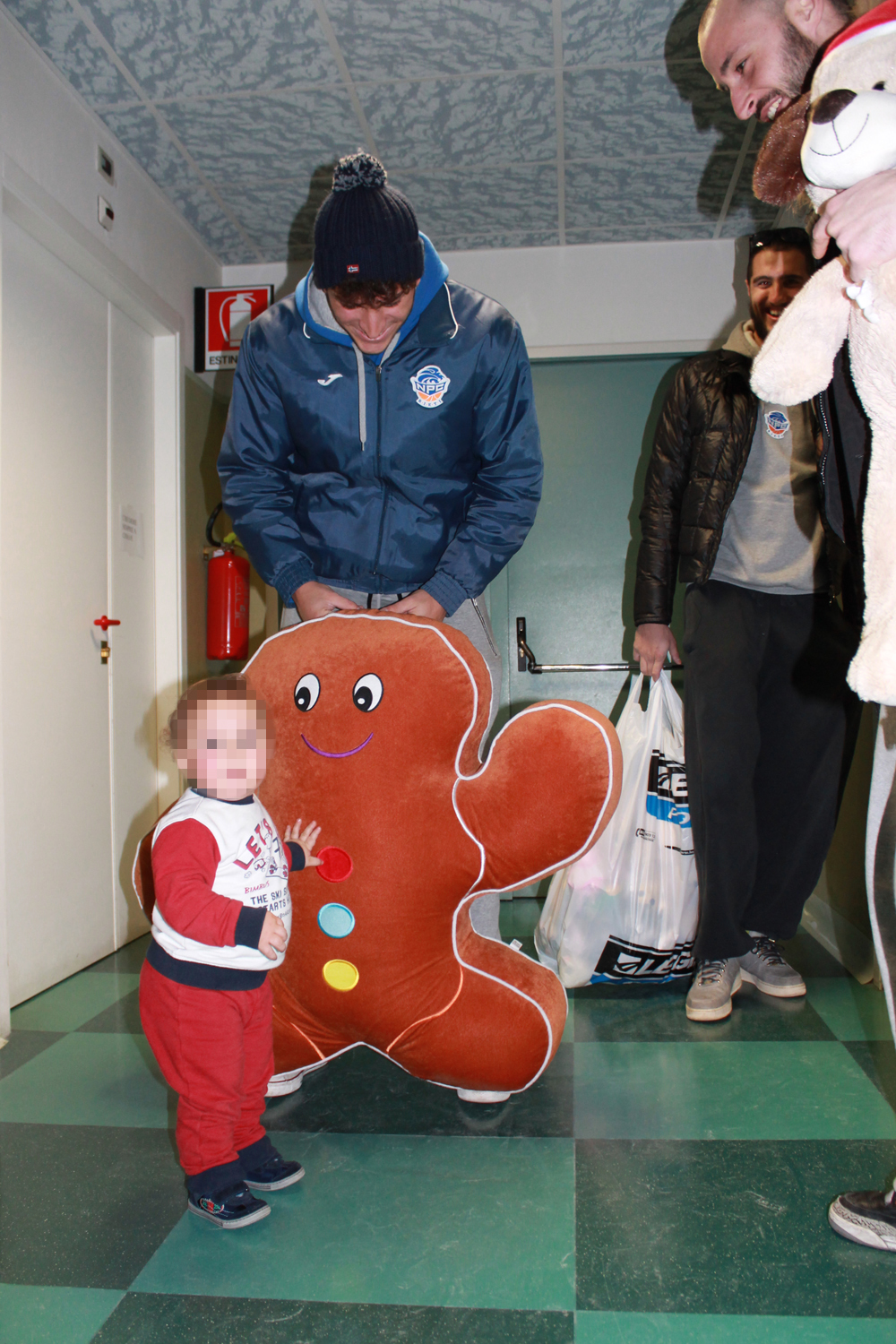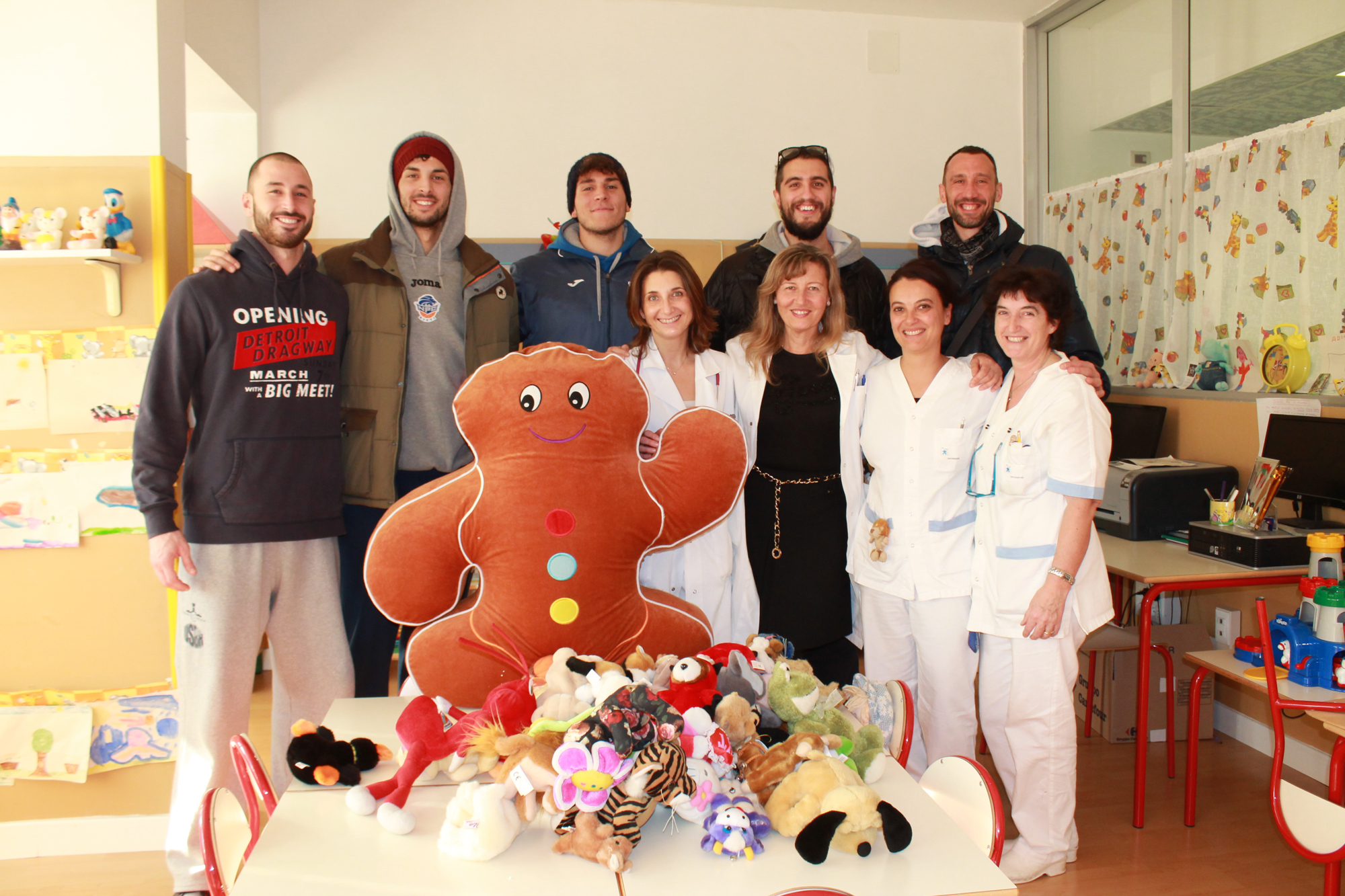 Una nutrita rappresentanza della Prometeo Estra Rieti si è recata questa mattina nel reparto pediatrico dell’Ospedale De Lellis, per consegnare ai bambini ricoverati i peluches raccolti con il Teddy Bear Toss del 21 dicembre scorso. Benedusi, Feliciangeli, Rosignoli, Spizzichini e Ponziani hanno fatto una graditissima sorpresa ai piccoli pazienti, regalando loro soprattutto momenti di allegria e serenità. La dottoressa Faraoni, responsabile del reparto, ha accompagnato, insieme al suo staff, i giocatori nella visita, introducendoli alle famiglie. I peluches non direttamente consegnati nelle mani dei bambini sono stati sistemati nella stanza dei giochi del reparto, a disposizione dei futuri pazienti di pediatria. Lo staff ha ringraziato la NPC che a sua volta gira il ringraziamento a tutti i tifosi che con il lancio del loro peluche hanno contribuito a rendere un pochino migliore la degenza dei più piccoli nel nosocomio reatino.