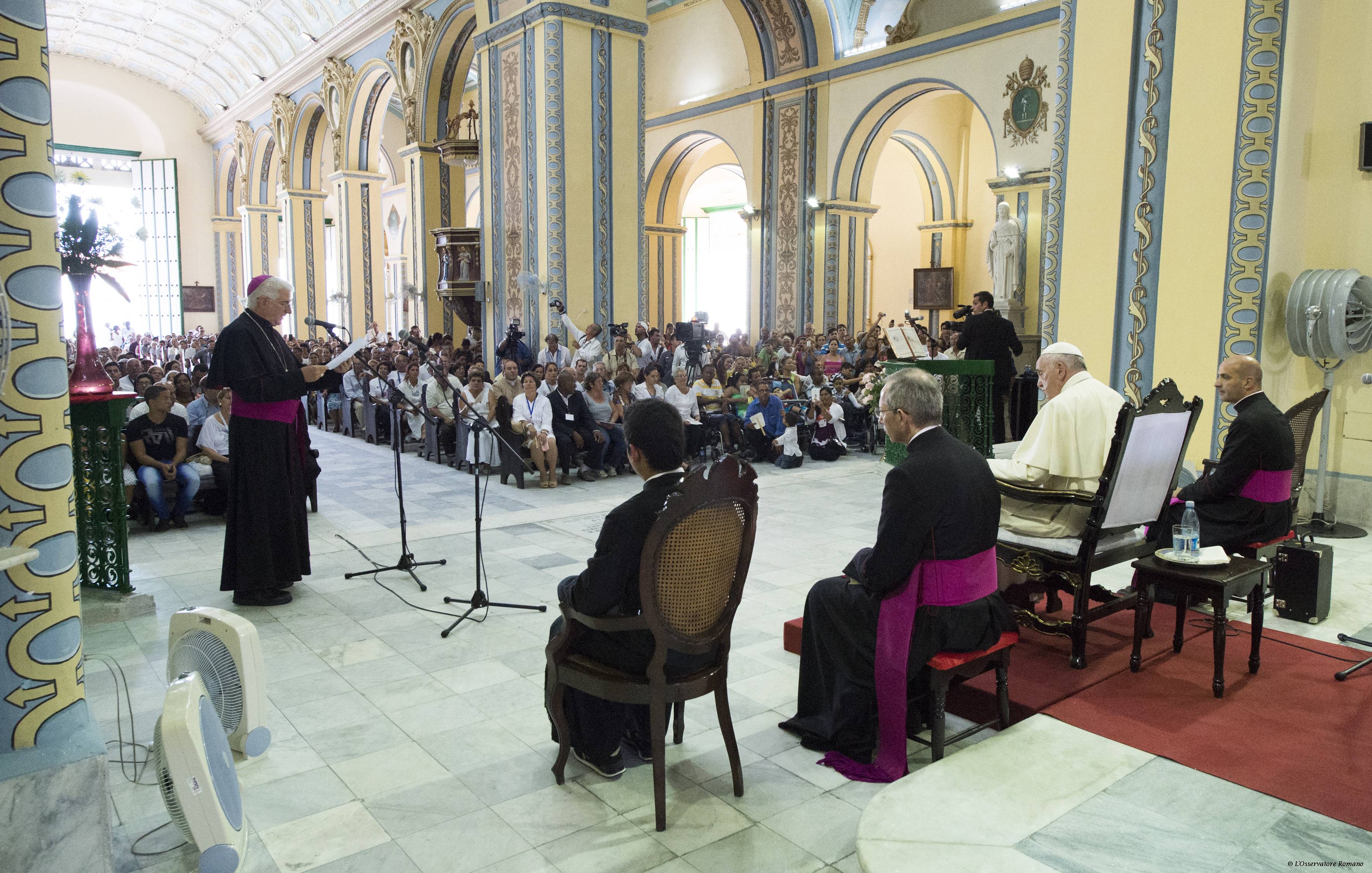«Grazie famiglie cubane, grazie cubani per avermi fatto sentire in tutti questi giorni in famiglia, per avermi fatto sentire a casa». È il congedo del Papa da Cuba, durante l’ultima tappa nell’isola: l’incontro con le famiglie nella cattedrale di Nostra Signora dell’Assunzione a Santiago.
