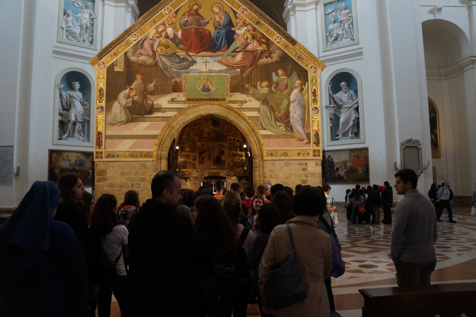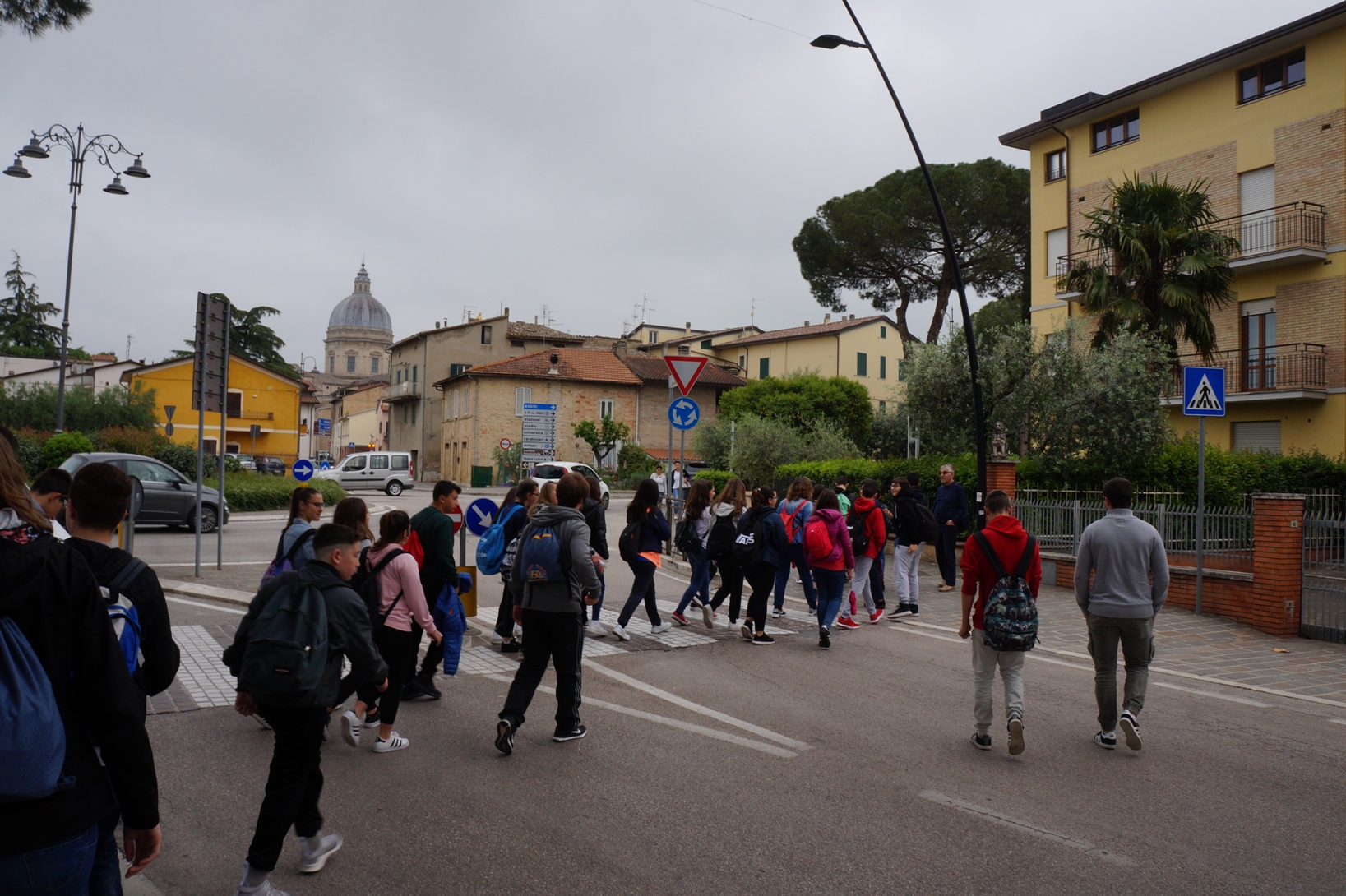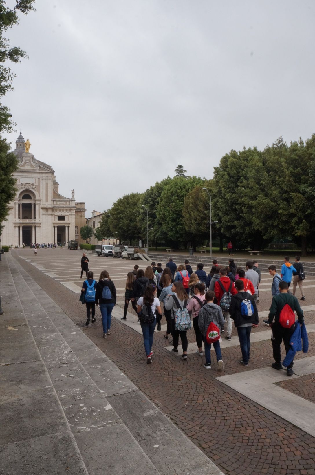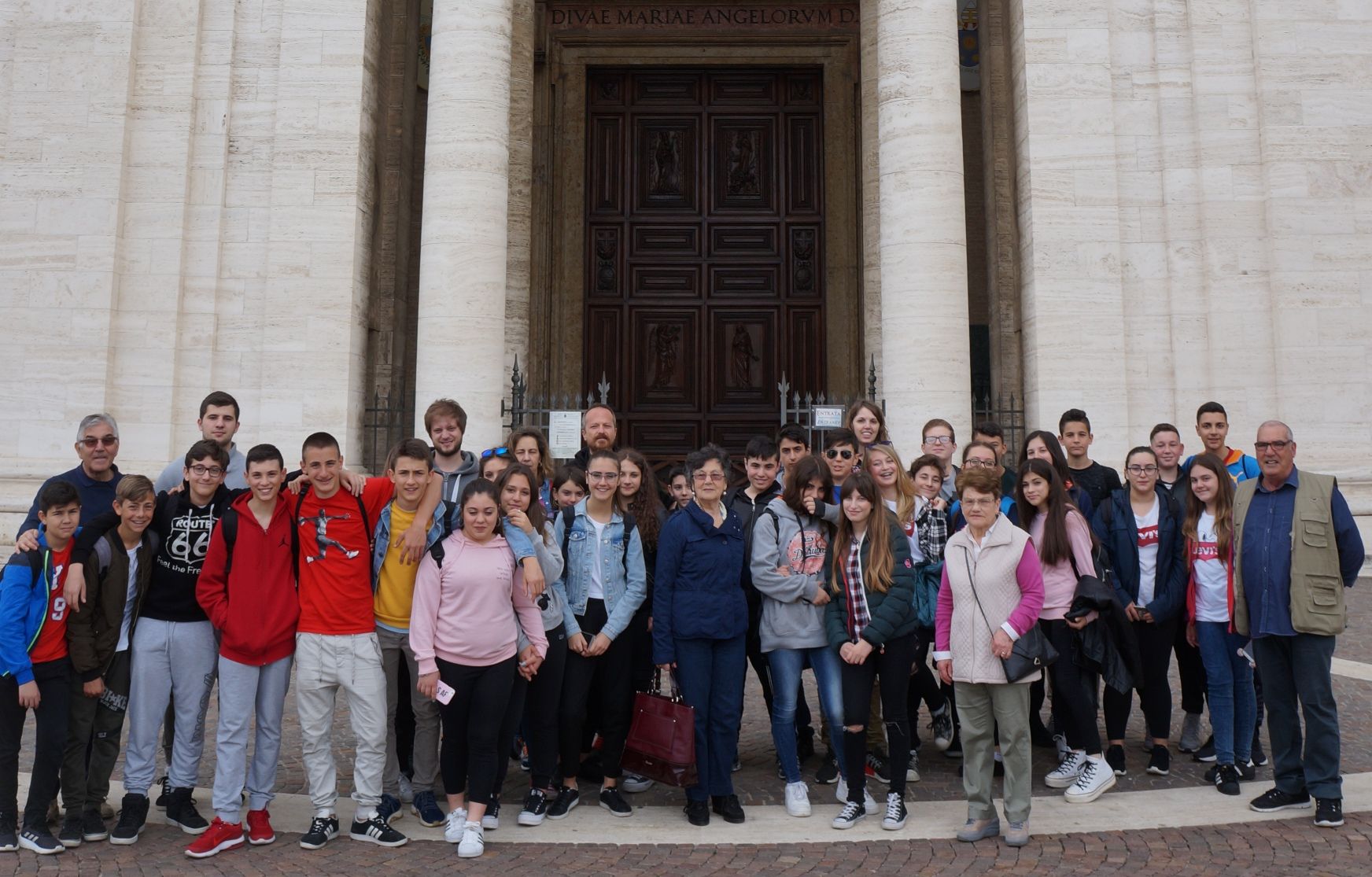 I ragazzi, appena arrivati, hanno intravisto la sagoma della cupola di Santa Maria degli Angeli apparire dal diafano orizzonte, ma soltanto a pochi metri dalla Chiesa li ha accolti anche il dorato benvenuto della grande statua della Madonna sul frontone.
