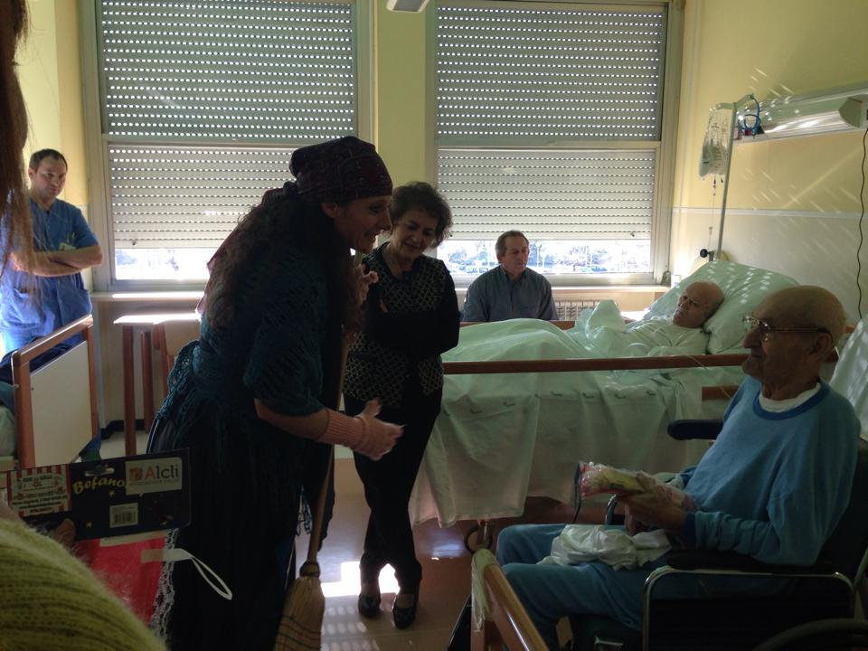 La Befana dell’ALCLI in visita il 6 gennaio nel Reparto di Geriatria presso l’Ospedale de Lellis, è stata testimone di un piccolo miracolo avvenuto davanti agli occhi stupiti degli infermieri e dello stesso responsabile del Reparto, il Dott. Giorgio Amedoro. Un’anziana signora che, dopo aver subito una brutta ischemia non aveva più parlato dal suo ricovero nella struttura, ha “conversato” con la Befana, esprimendo con dolci parole il suo stato d’animo e l’affetto per i volontari dell’ALCLI tutti intorno a lei a farle carezze e sorrisi.