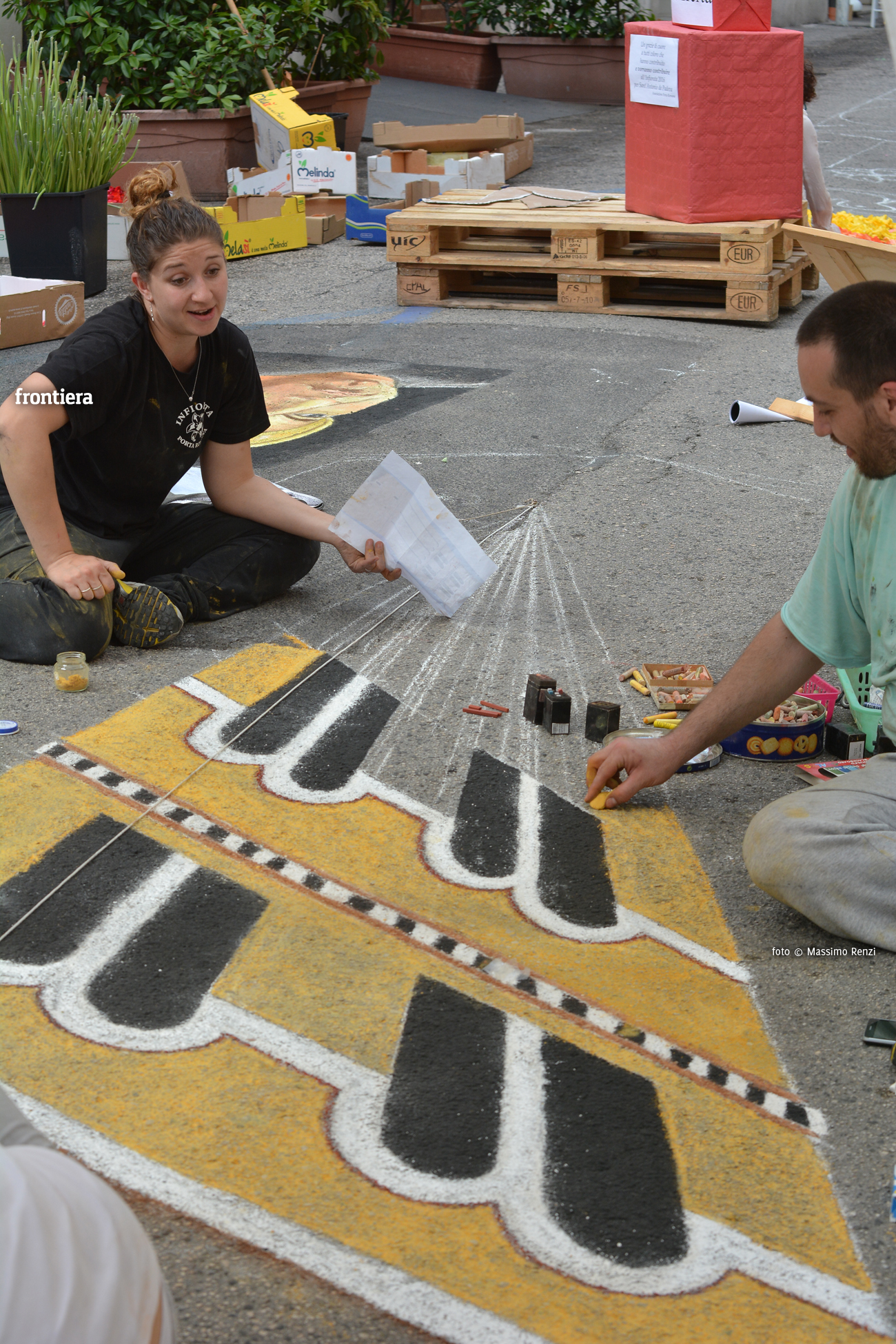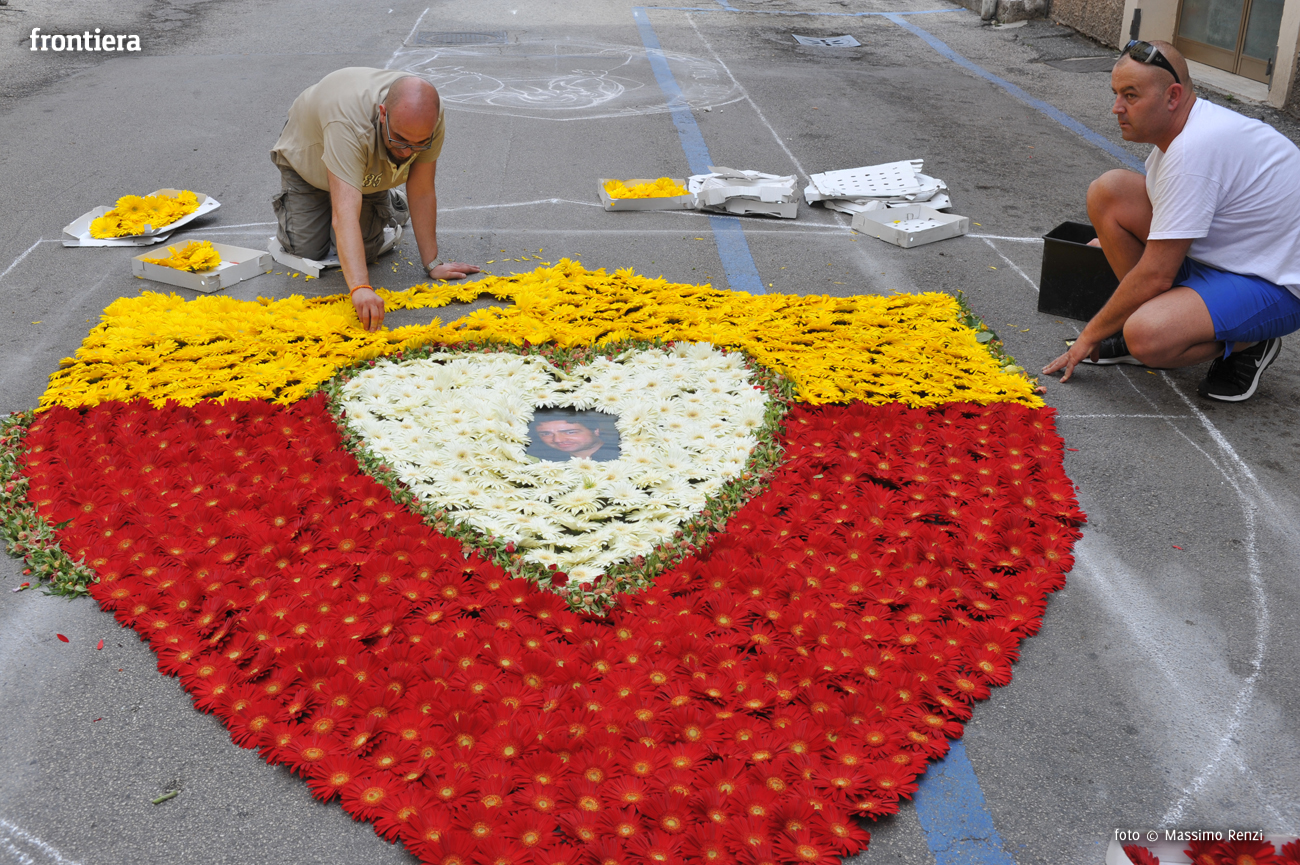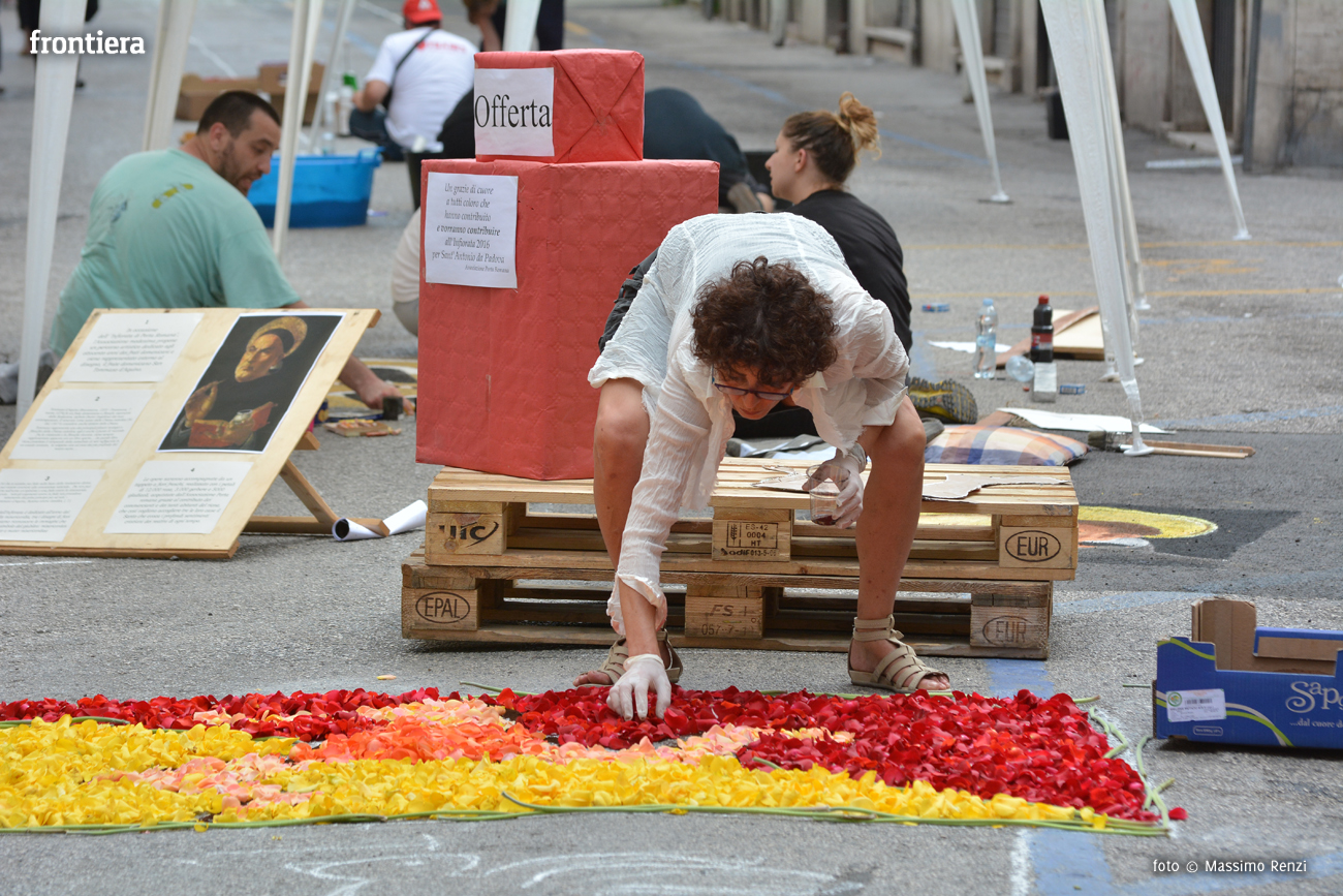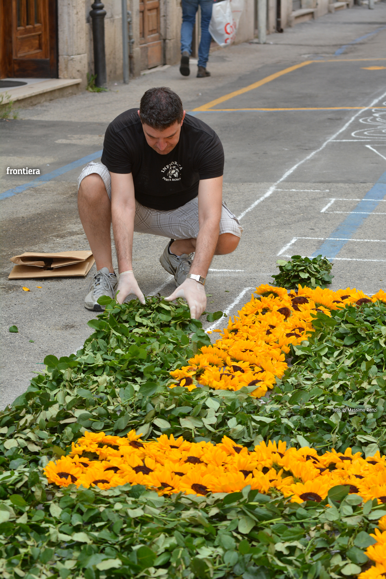Una città in movimento, con tante persone all’opera già dall’alba: è quella che ha realizzato le infiorate in onore di Sant’Antonio di Padova nel giorno più importante del Giugno antoniano: quello della Processione dei Ceri.