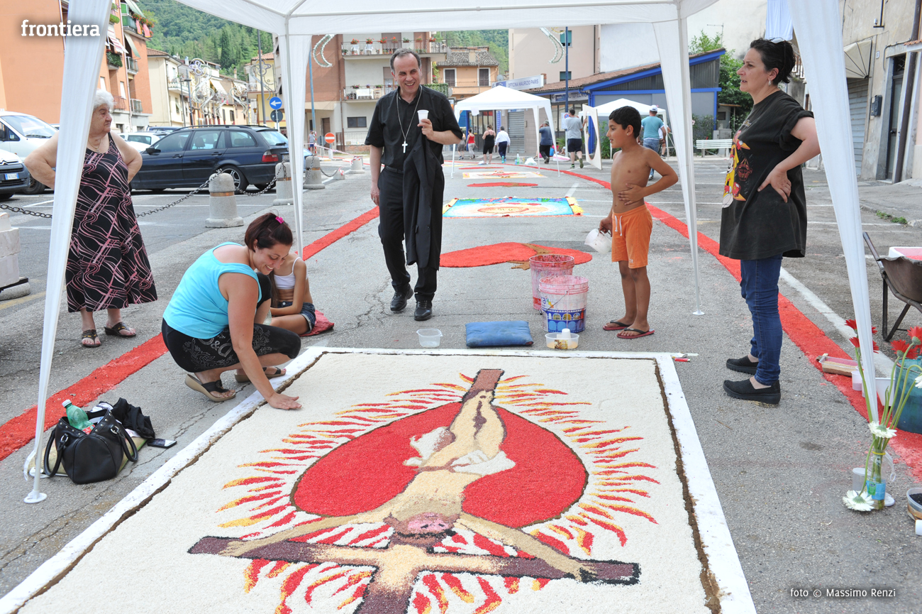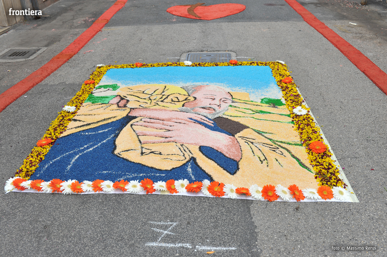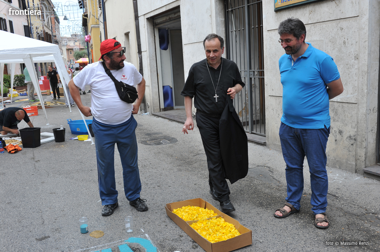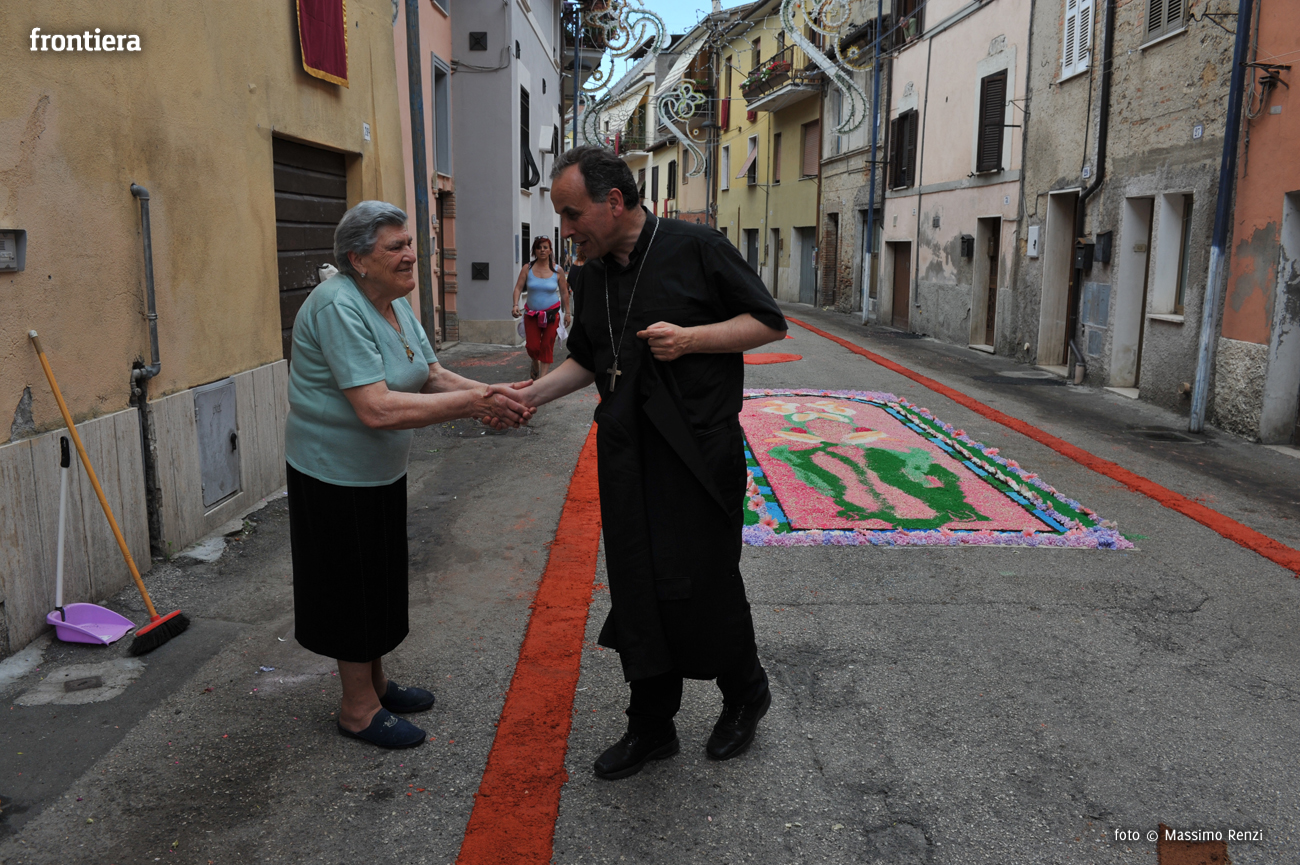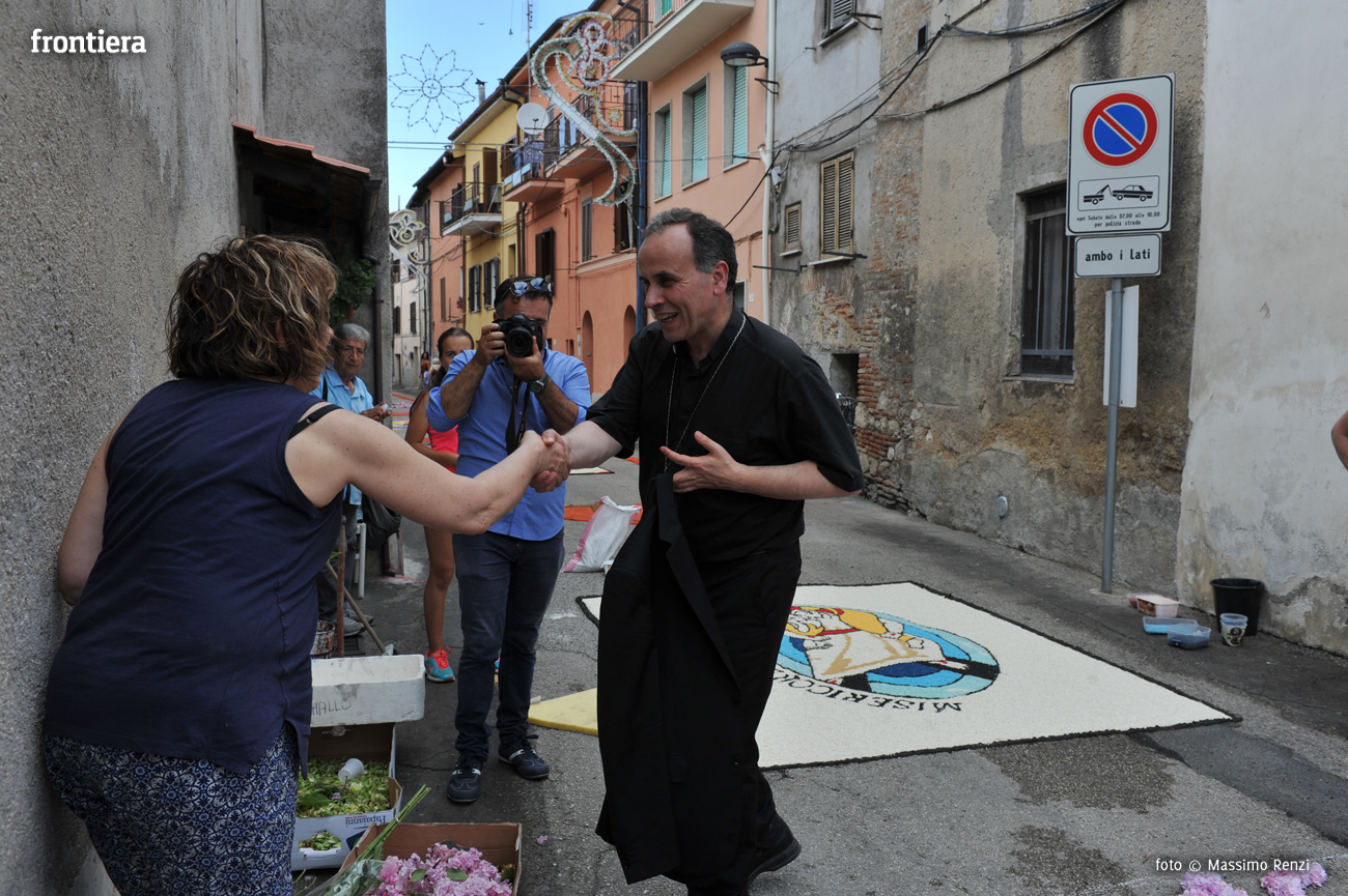 Per tutti il vescovo ha avuto una parola, un gesto, una carezza. E gli infioratori non hanno mancato di dimostrare affetto e simpatia. Una grande emozione per ciascuno: «quando si interagisce tutti allo stesso modo, è motivo di grande conforto» ha detto don Domenico, che proprio nel senso dell’agire insieme, nell’intraprendere un cammino comune, ha individuato il messaggio, la lezione e il potenziale della devozione antoniana.