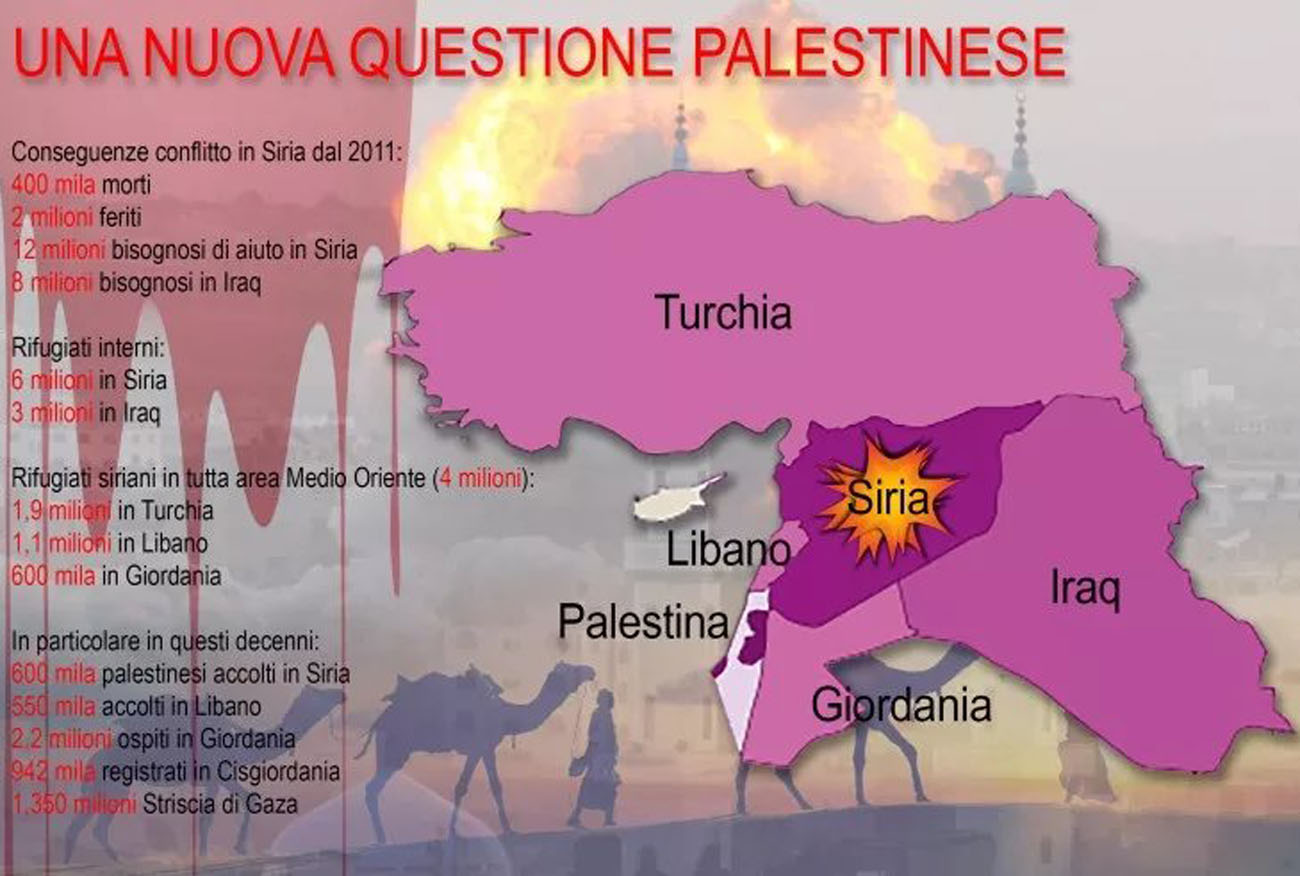 Siriani e iracheni, nuovi palestinesi. Secondo i dati disponibili, e riportati nel corso di una recente riunione del Pontificio Consiglio Cor Unum, dal 2011 il conflitto in Siria avrebbe provocato finora circa 400 mila vittime e 2 milioni di feriti.Attualmente sono più di 12 milioni le persone bisognose di aiuto in Siria e oltre 8 milioni in Iraq;i rifugiati interni sono più di 6 milioni in Siria e più di 3 milioni in Iraq, mentre almeno 4 milioni sono i rifugiati siriani in tutta l’area del Medio Oriente: in particolare, 1,9 milioni in Turchia, 1,1 milione in Libano, più di 600mila in Giordania.Pezzi di popolo senza patria così come lo sono i 600mila palestinesi accolti in questi decenni in Siria, i 550mila in Libano, i 2,2 milioni ospiti della Giordania, oltre ai 942mila registrati in Cisgiordania e al milione e 350mila della Striscia di Gaza.I dati Onu non tengono conto di tutti i palestinesi residenti nei Territori (dunque non registrati come rifugiati) e di quelli che negli anni passati sono emigrati in diversi Paesi del mondo, in particolare in Sud America. Una crisi ormai “datata” quella palestinese, per anni uno dei cavalli di battaglia dei movimenti radicalisti islamici, ora abbandonata a favore di una più efficace – almeno sul piano mediatico – jihad globale.