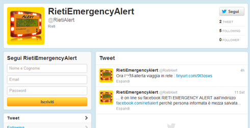 Il servizio “Rieti emergency alert” prenderà il via ufficialmente il 15 ottobre prossimo, ma sin d’ora si potrà aderire sia sulla pagina Facebook all’indirizzo www.facebook.com/rietialert sia su Twitter all’indirizzo www.twitter.com/rietialert e ricevere in tempo reale informazioni (ma anche interagire, postando foto, filmati e commenti) in caso di allerta o emergenza di Protezione Civile a Rieti.