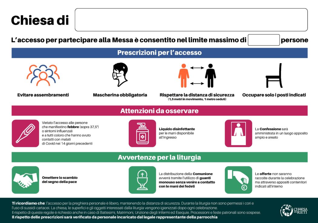 Posti contrassegnati con appositi adesivi a indicare il luogo dove sedersi, rispettando la distanza di almeno un metro, frontale e laterale, tra fedeli, rigorosamente con mascherina; colonnina con il gel igienizzante all’entrata; cartelli con il pro-memoria delle regole (e l’indicazione del numero massimo di persone ammesse) da apporre alle porte della chiesa.