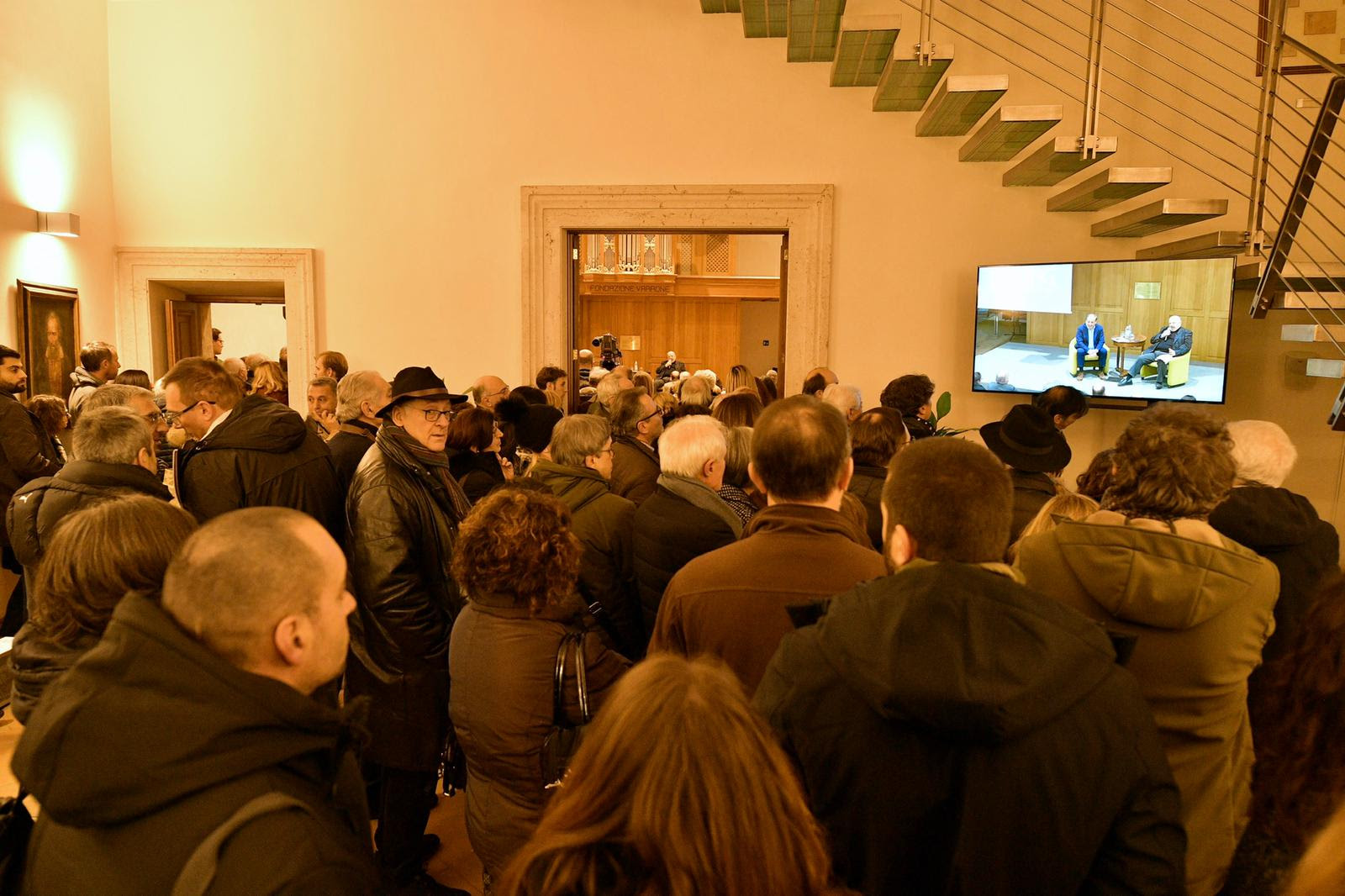 Un incontro – quello con lo storico toscano, affiancato dal giornalista Federico Fioravanti – ricco di spunti e di suggestioni sapientemente riassunte nelle conclusioni da monsignor Lorenzo Chiarinelli, e seguito con attenzione non solo dal pubblico in sala ma, attraverso uno schermo tv, anche dalle decine di persone rimaste fino in ultimo nell’atrio.